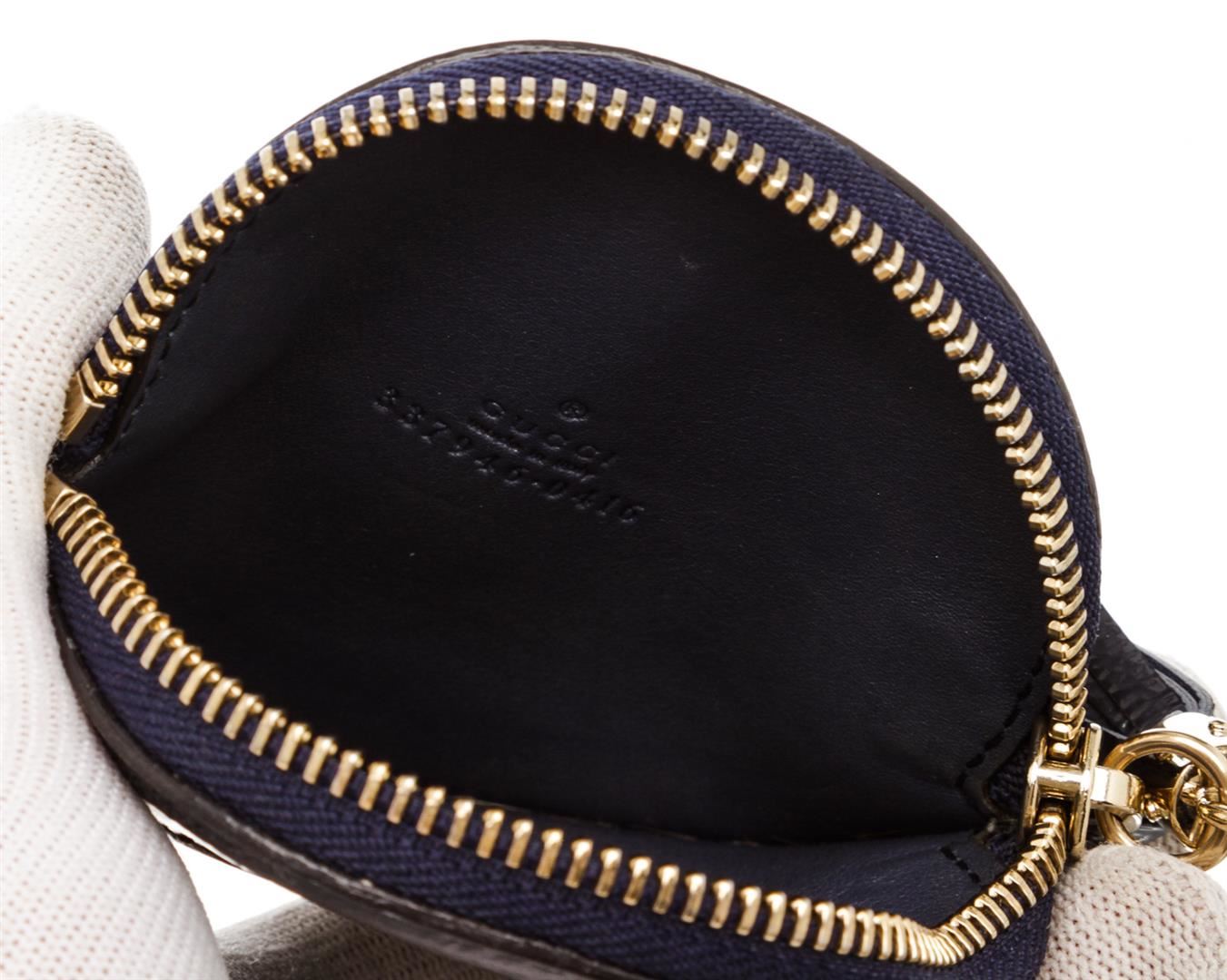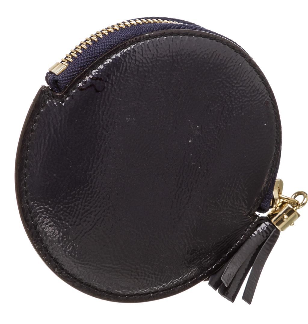 Gucci blue patent leather Soho round coin purse with blue leather lining, gold-tone hardware, and tassel zip closure. Authentic.
