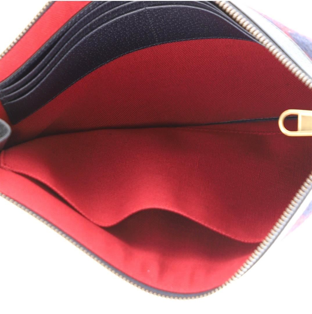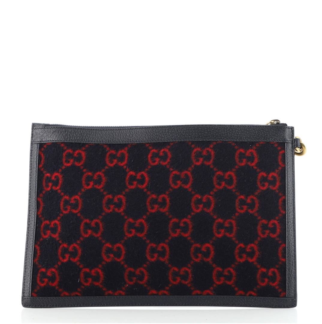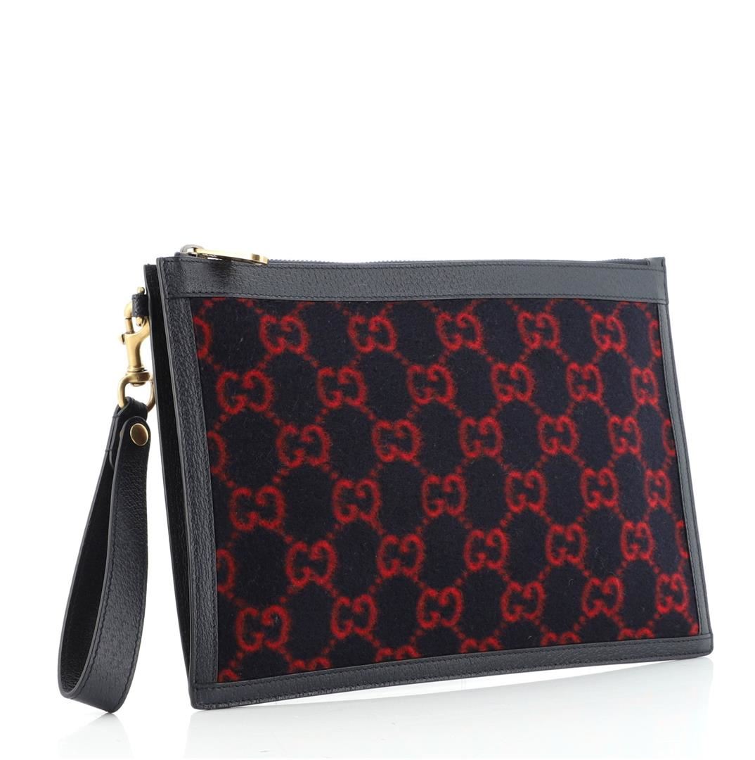 Gucci Wristlet Pouch features blue and red GG Monogram wool body, black leather trim, detachable leather wrist strap, zipper closure at top, red canvas interior lining with embossed logo and two card slots at the interior.