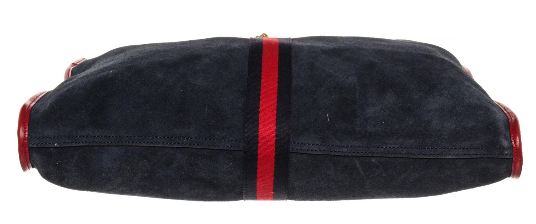 One Gucci Blue Suede Rajah Large Tote. Item is sold AS-IS. All available information is listed in the description and shown in the photo. Gucci Large Rajah Tote Navy Suede Red Leather. Features gold hardware, red leather straps, blue leather interior, and a gold zipper closure.