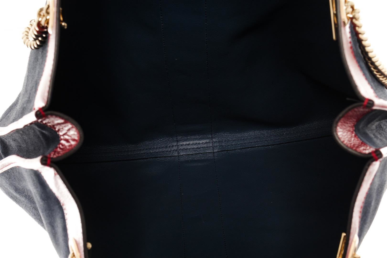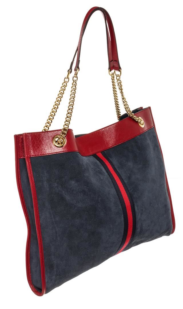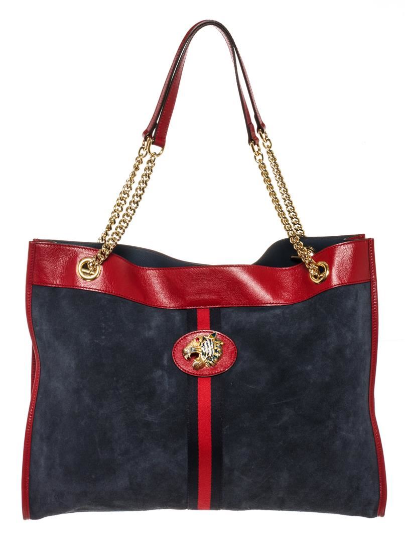 One Gucci Blue Suede Rajah Large Tote. Item is sold AS-IS. All available information is listed in the description and shown in the photo. Gucci Large Rajah Tote Navy Suede Red Leather. Features gold hardware, red leather straps, blue leather interior, and a gold zipper closure.