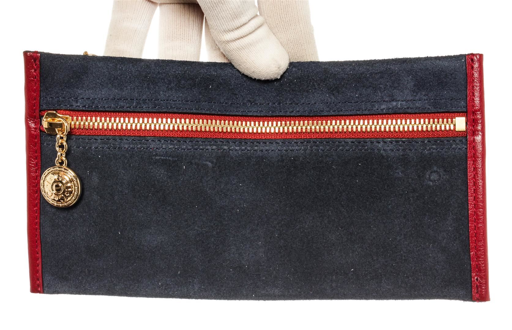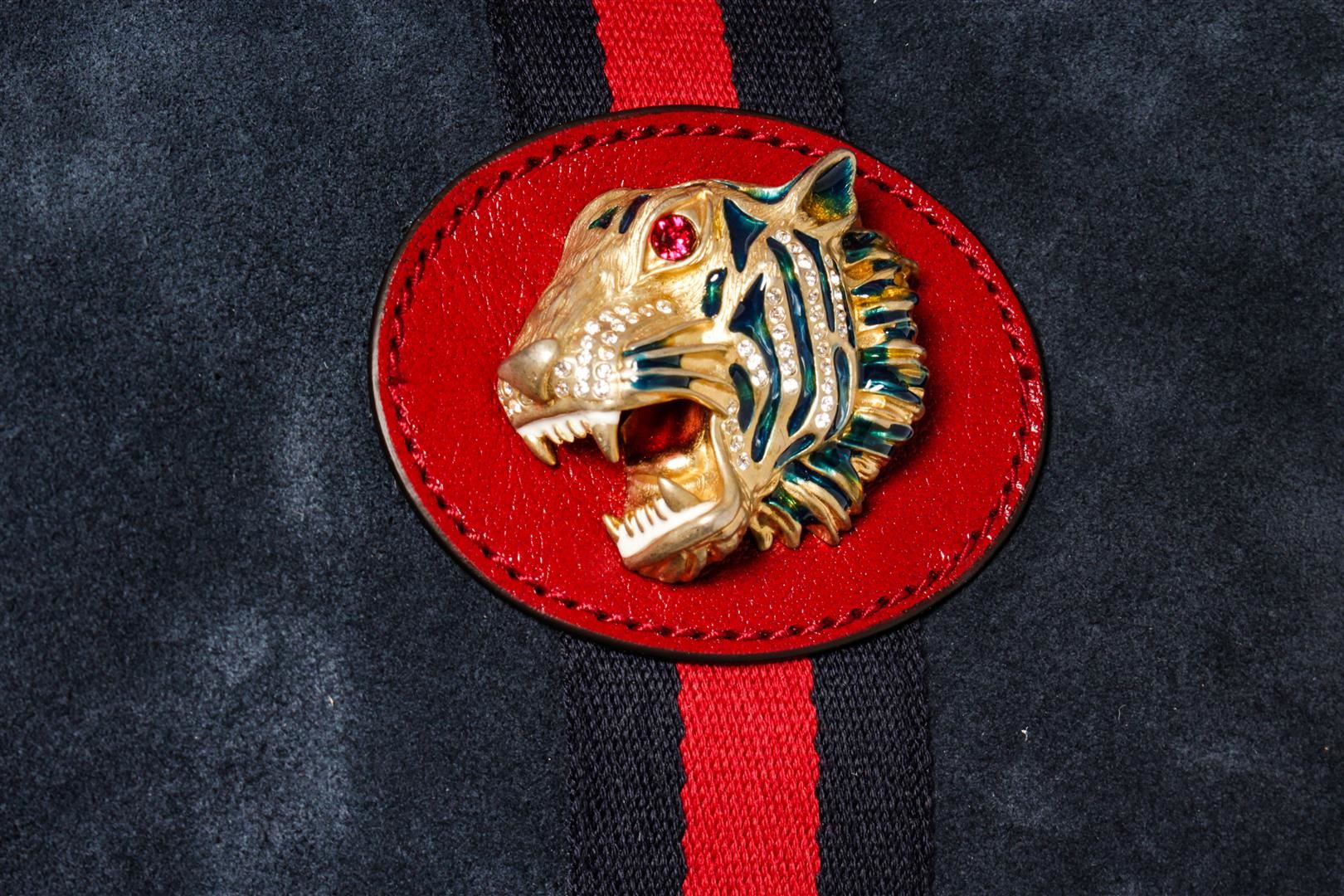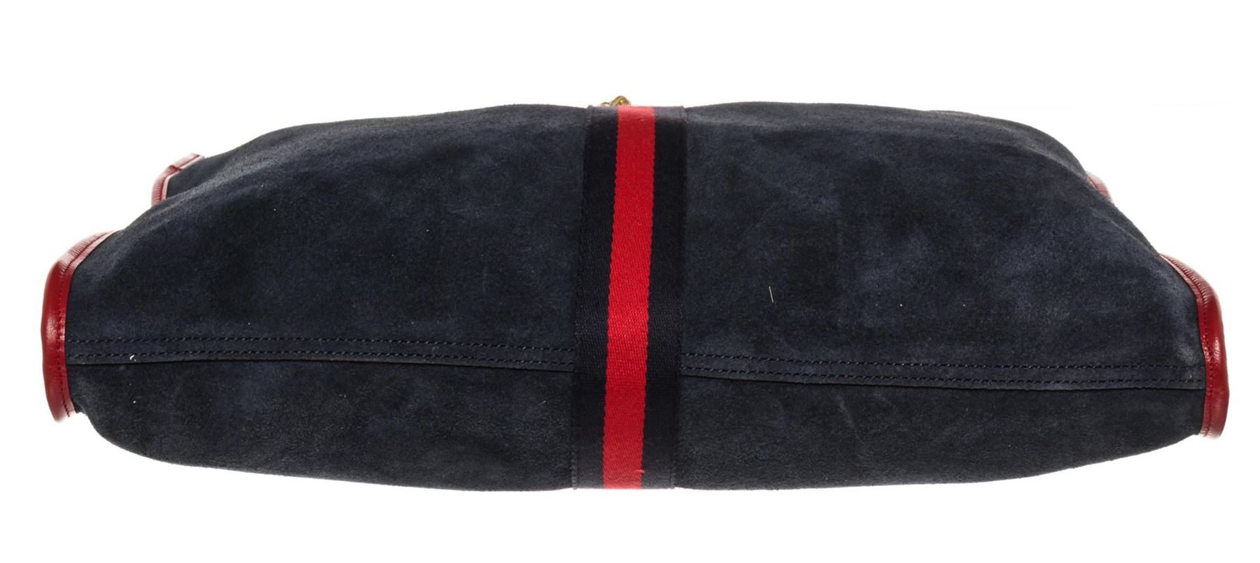 One Gucci Blue Suede Rajah Large Tote. Item is sold AS-IS. All available information is listed in the description and shown in the photo. Gucci Large Rajah Tote Navy Suede Red Leather. Features gold hardware, red leather straps, blue leather interior, and a gold zipper closure.