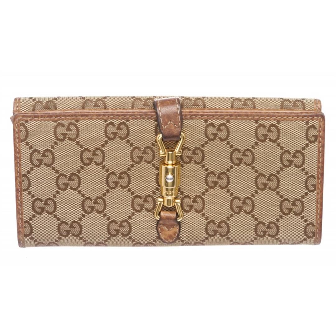 One Gucci Brown Beige Canvas Leather Monogram Wallet. Overall magnetic snap button closure. Interior contains seven credit cardip pockets, two billfold pockets and two large open compartment. Exterior contains large compartment with overall piston lock cl