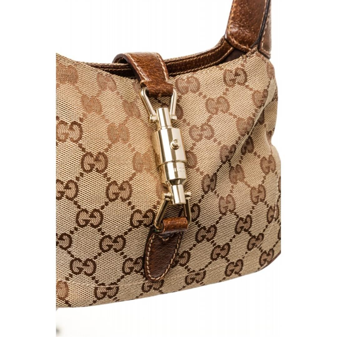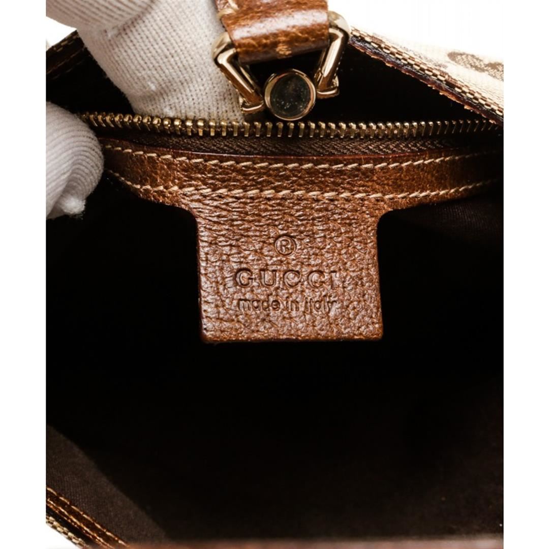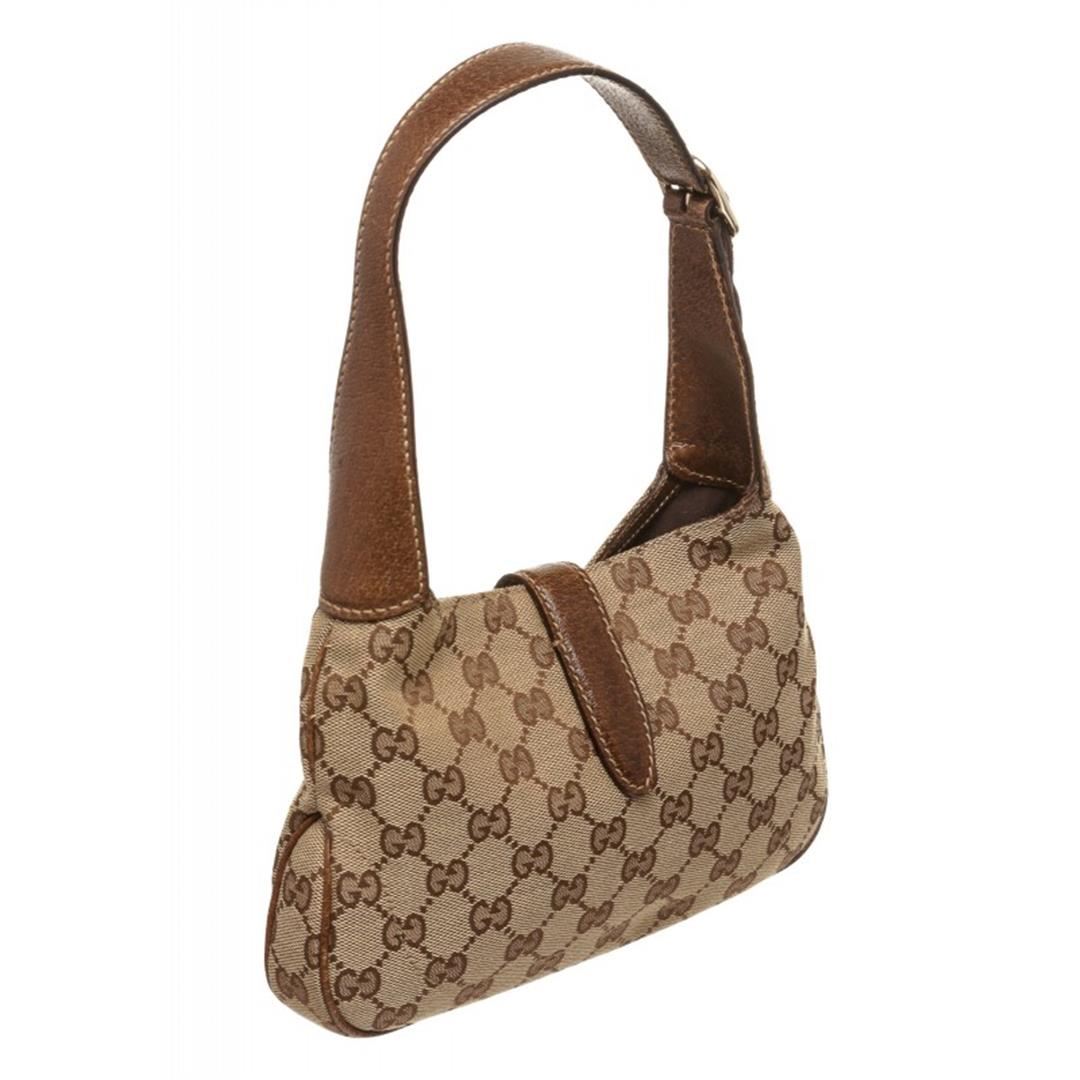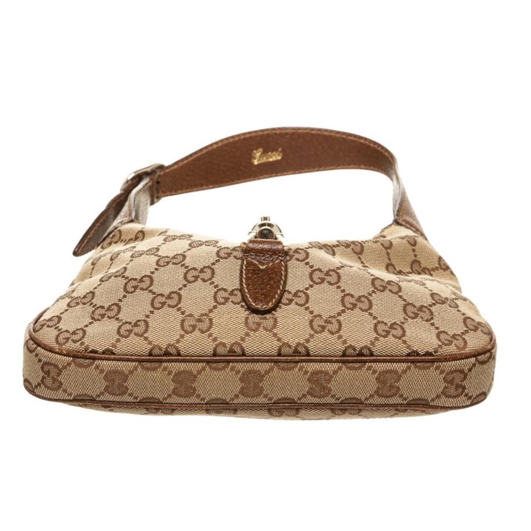 One Gucci Brown Beige Monogram Canvas Leather Mini Jackie Bag. Overall push pin closure and adjustable leather buckle shoulder strap. Interior contains fabric lining and one side zipper pocket. Item is pre-owned.