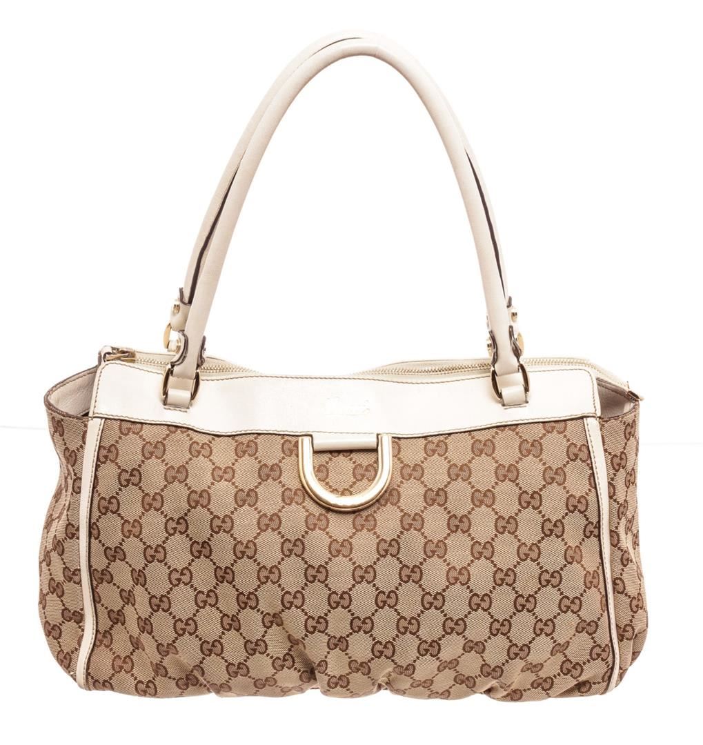 Gucci Brown Canvas D Tote Bag. All available information is listed in the description and shown in the photos. Gucci Brown Canvas D Tote Bag with gold-tone hardware, dual rolled top handles, gold-tone leather trim, black canvas lining, single slit pocket at interior wall and zip closure. CONDITION: Pre-Owned Good condition overall. Please refer to photographs.
