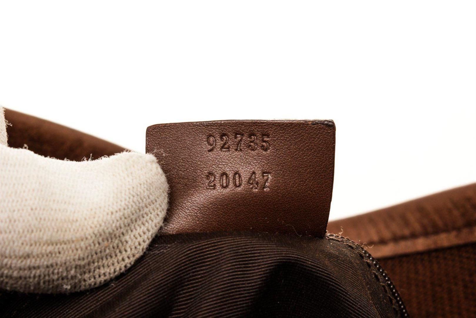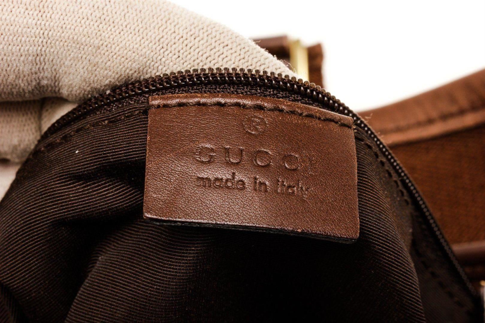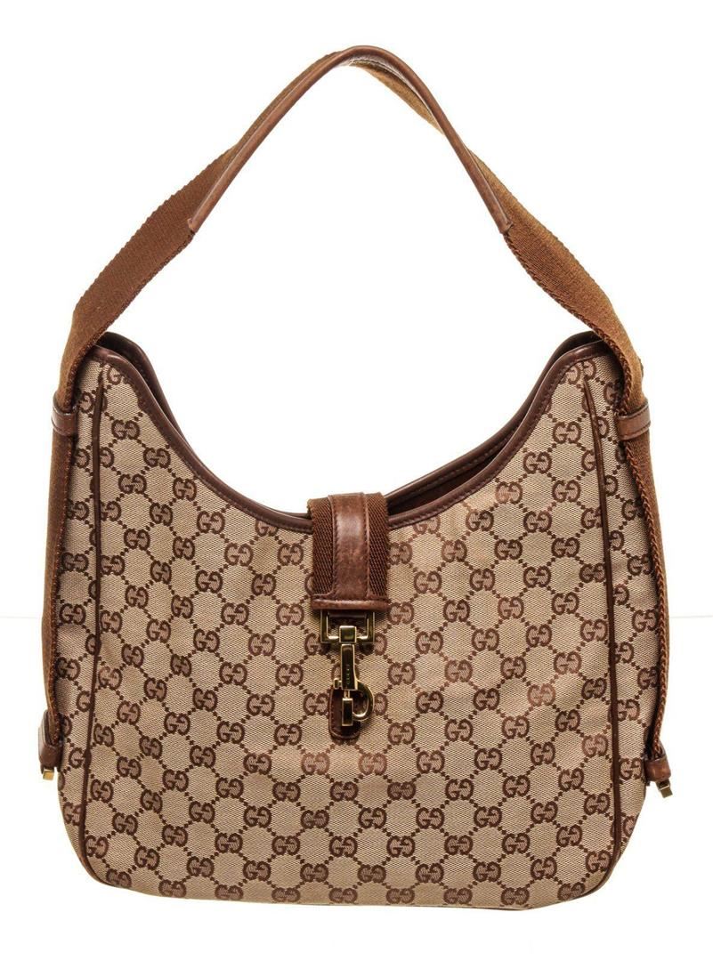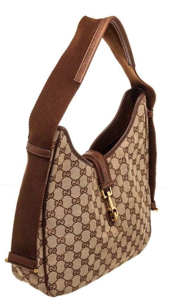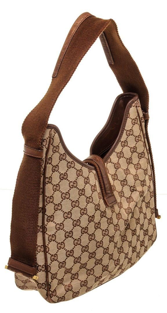 Gucci Brown Canvas Jackie Hobo Bag with canvas, gold-tone hardware, interior slip pocket, canvas lining, shoulder strap and turn lock closure.