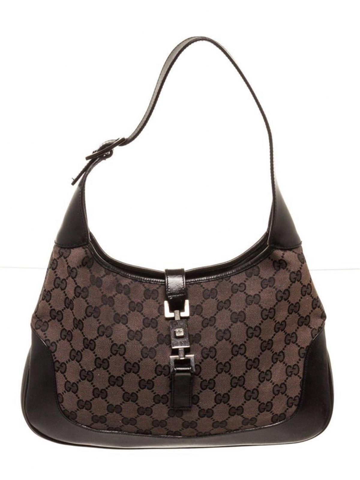 Gucci Brown Canvas Jackie Shoulder Bag. Gucci Brown Canvas Jackie Shoulder Bag with material canvas gold-tone hardware, interior slip pockets, shoulder strap and push-lock closure.