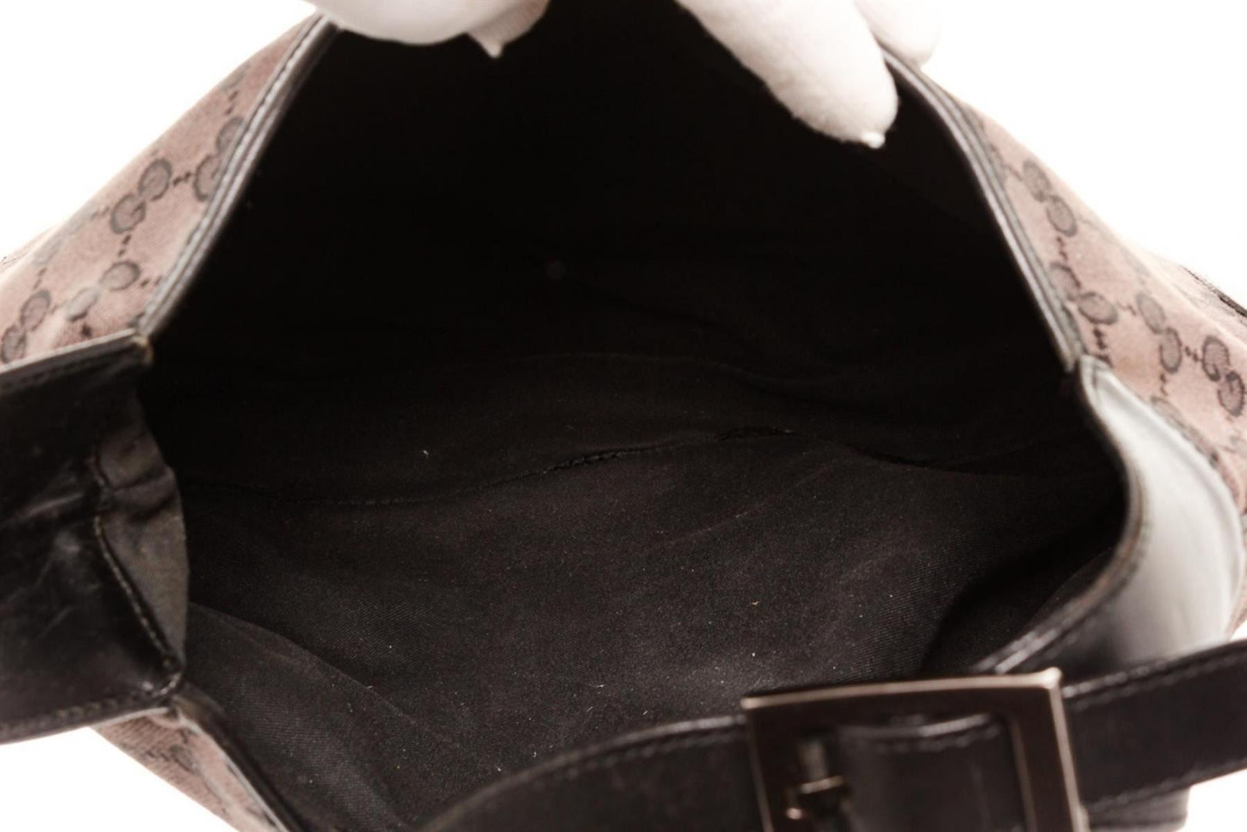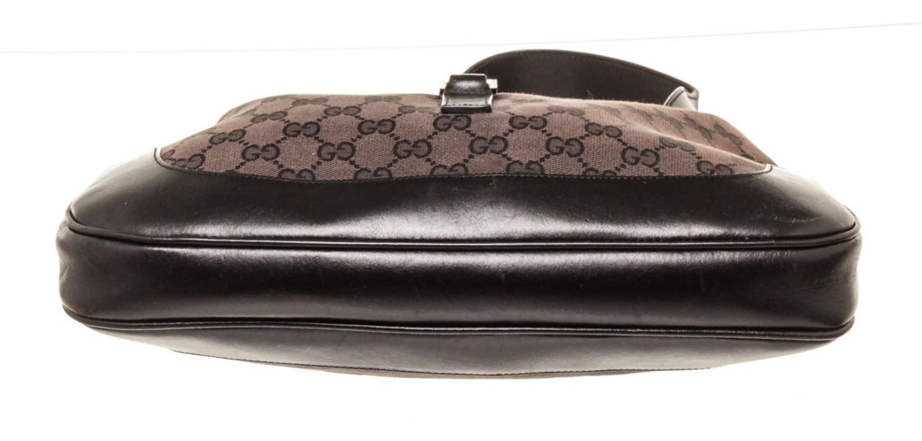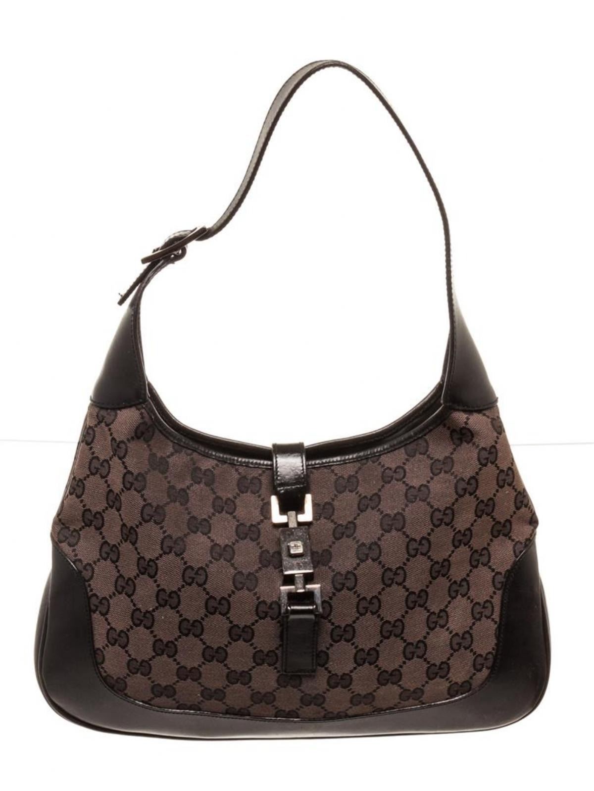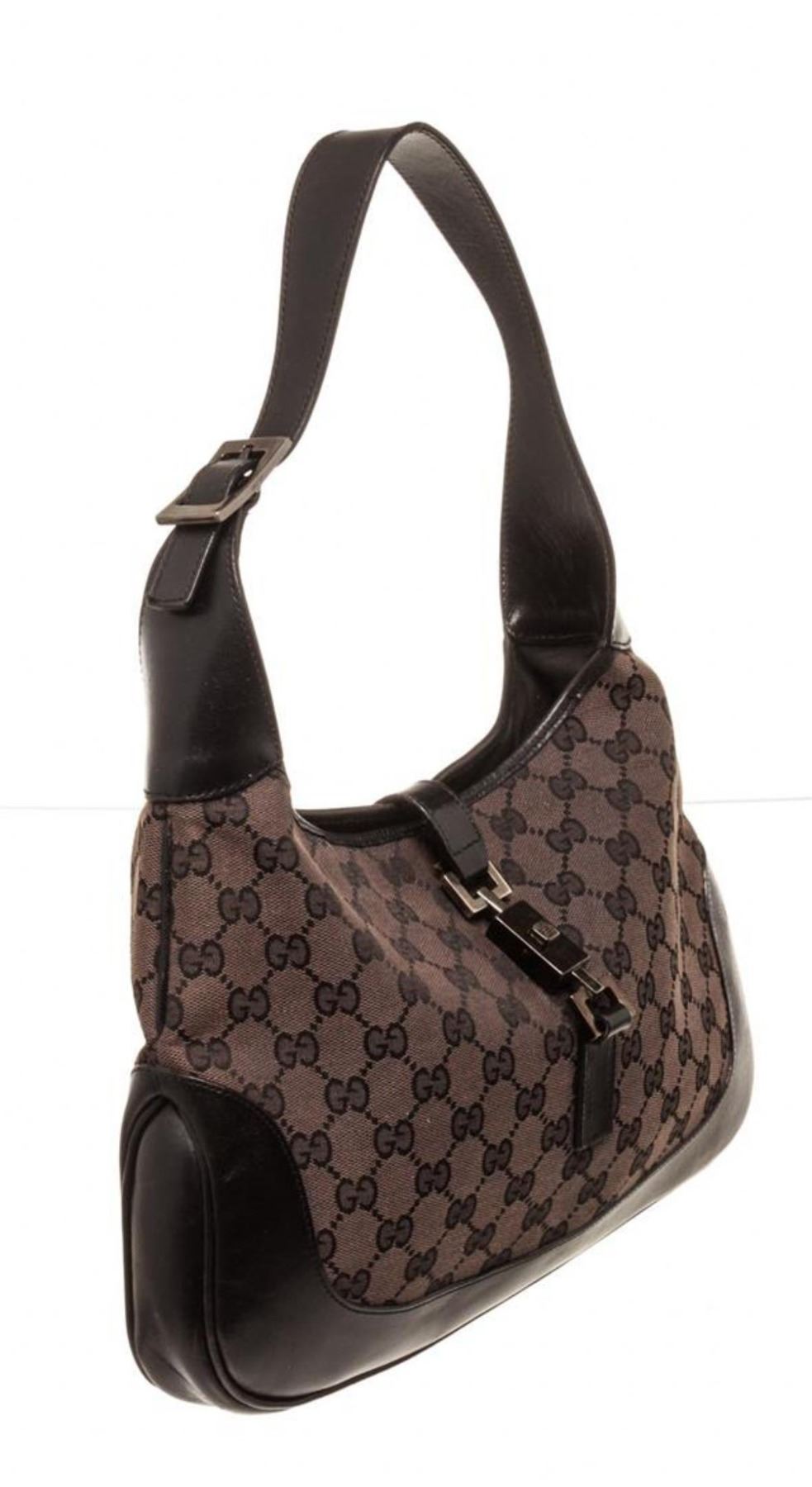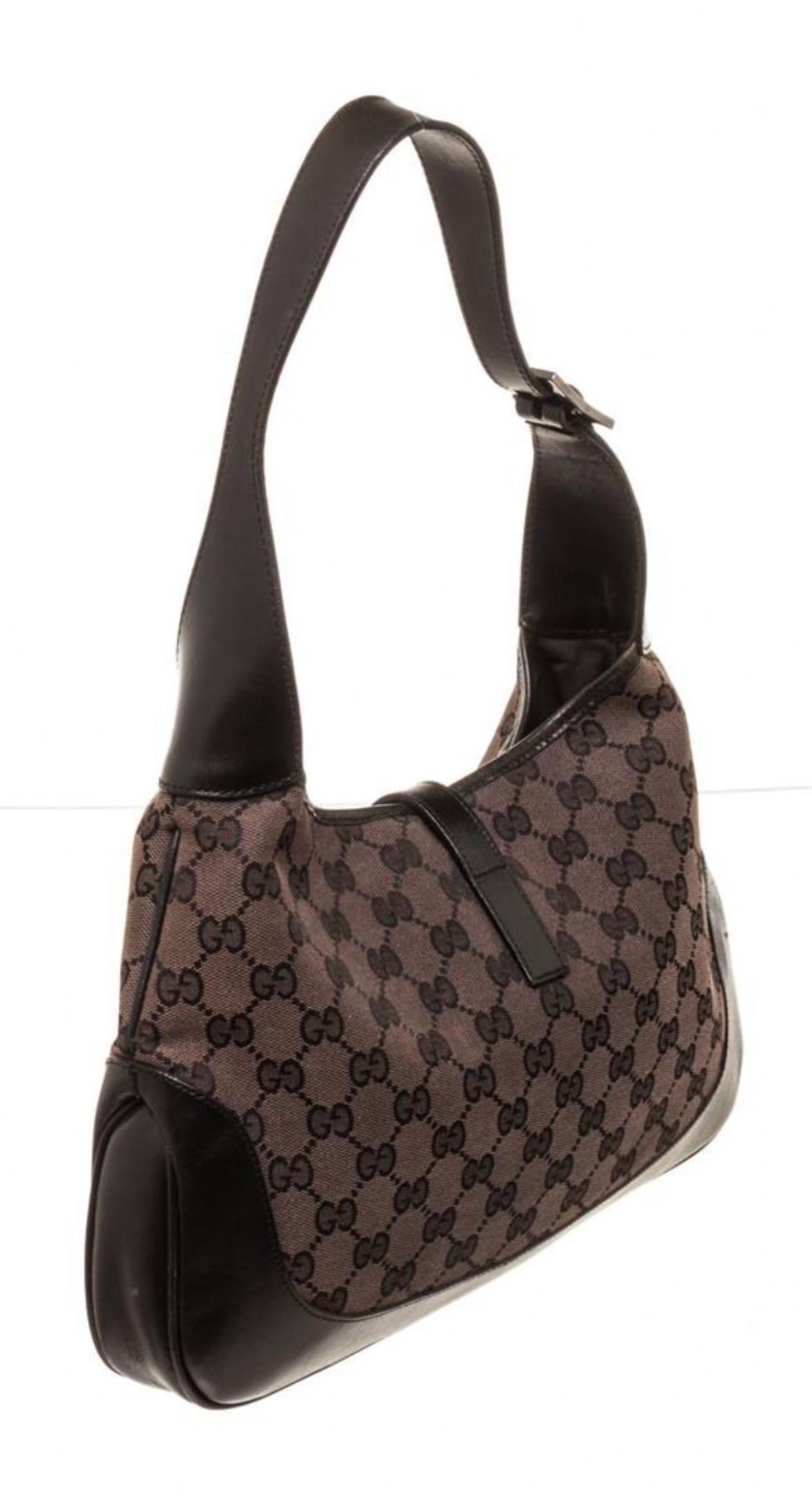 Gucci Brown Canvas Jackie Shoulder Bag with material canvas gold-tone hardware, interior slip pockets, shoulder strap and push-lock closure.