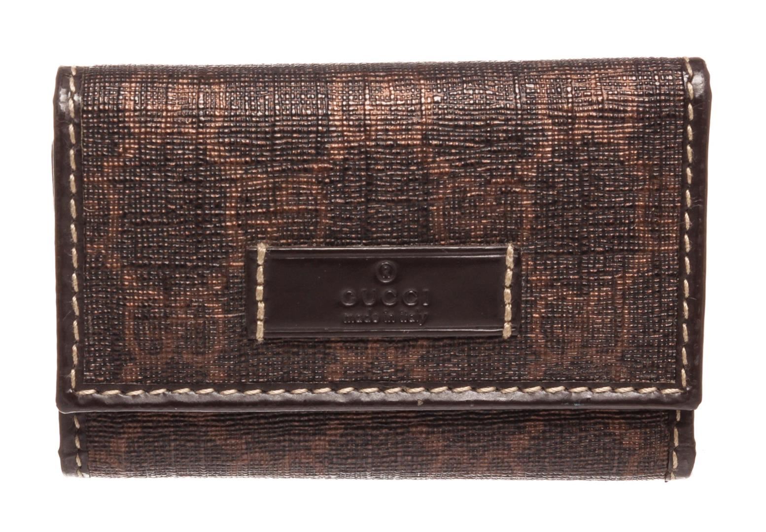 Gucci dark brown monogram coated canvas 6 key holder with leather lining, light gold-tone hardware, side pocket, and snap closure.