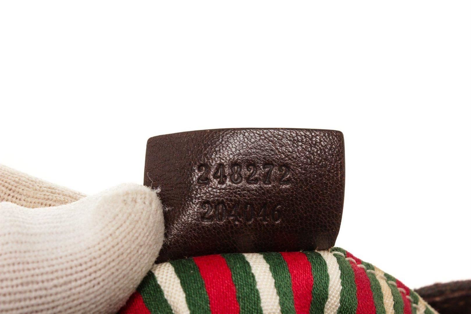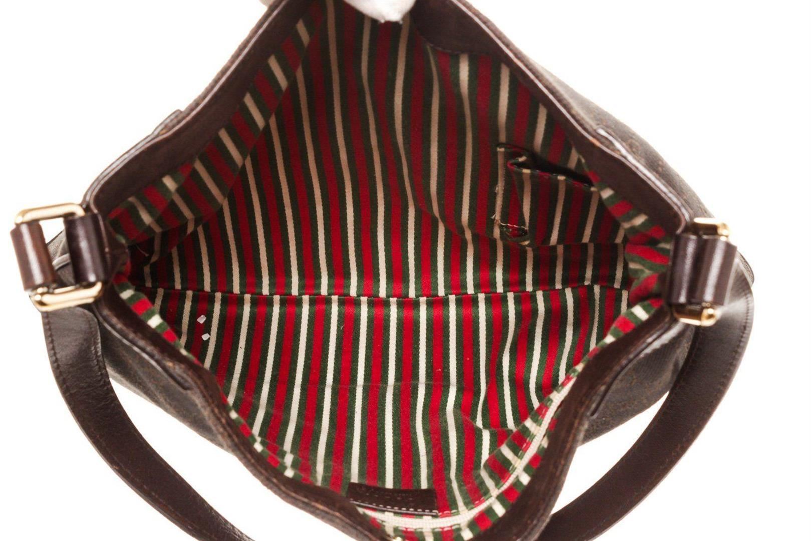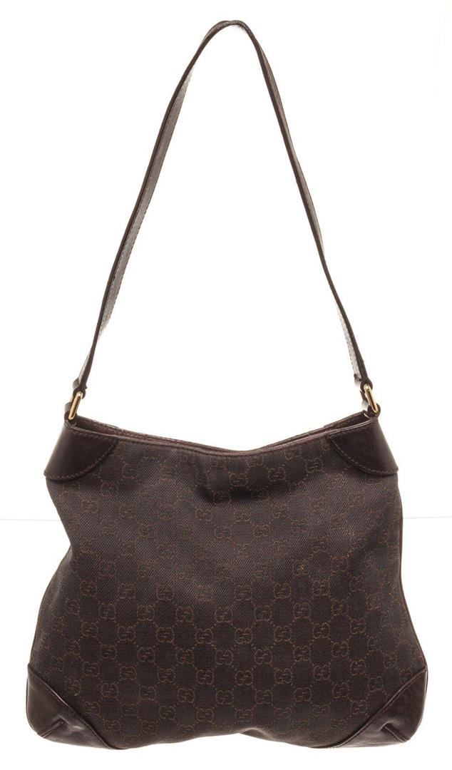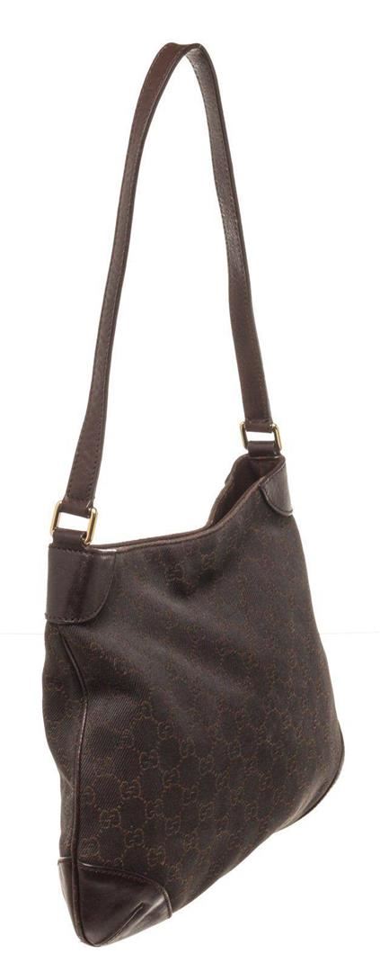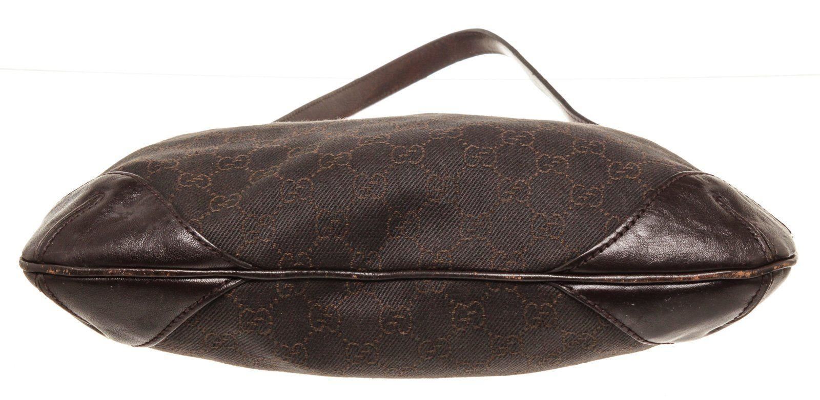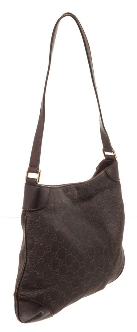 Gucci Brown Canvas Leather Shoulder Bag with gold-tone hardware, black leather trim, single flat shoulder strap, black woven lining, single zip pocket at interior wall and zip closure.