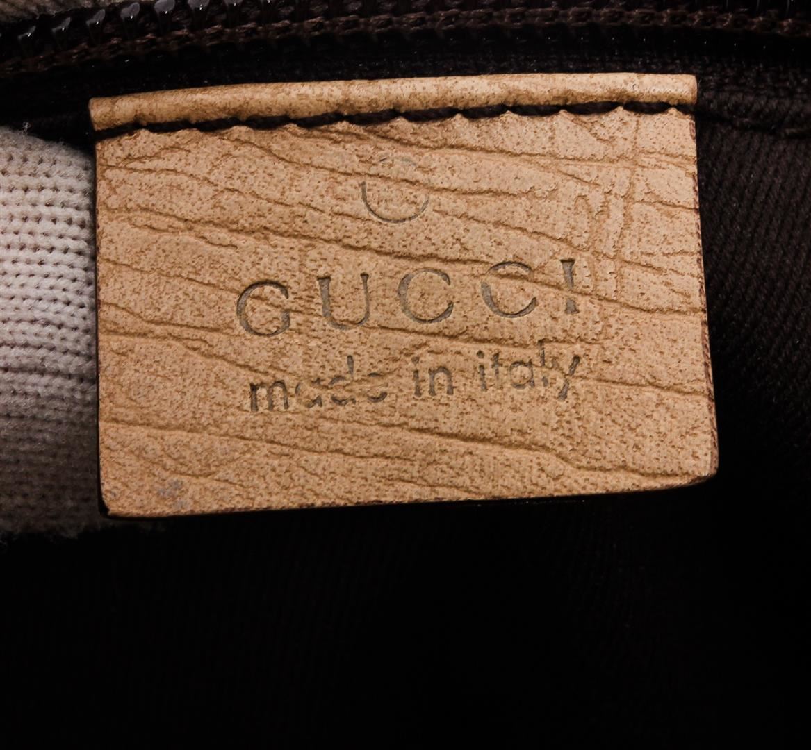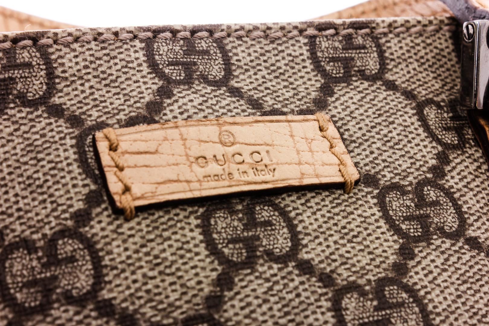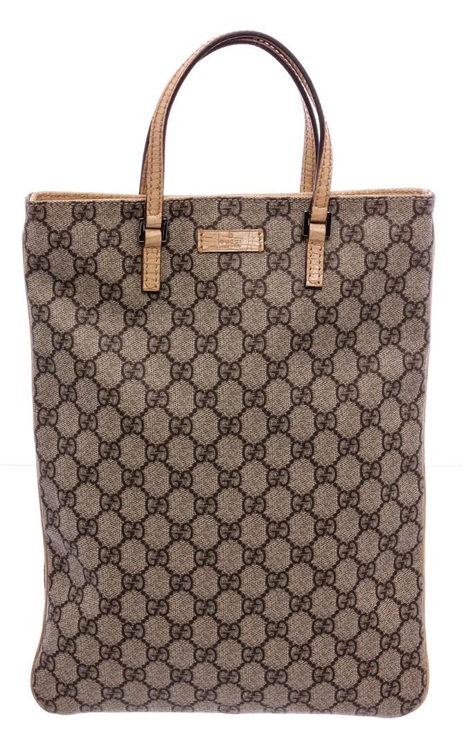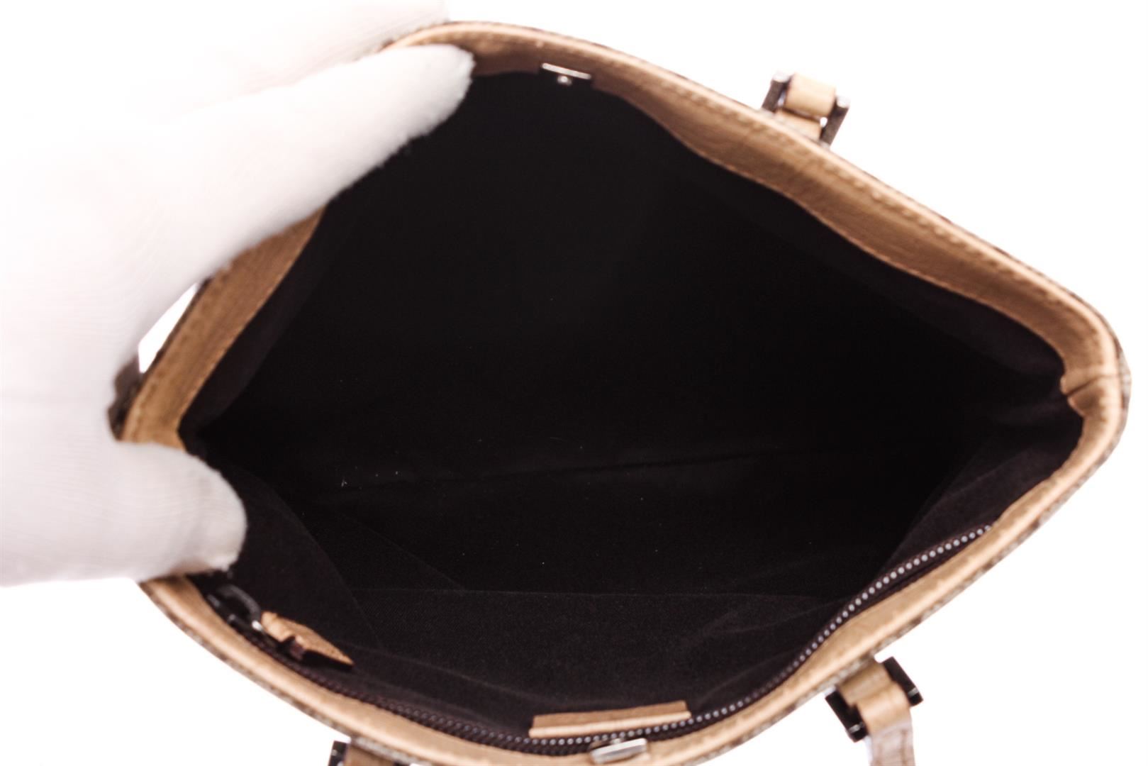 One Gucci Brown Coated Canvas Leather GG Plus Mini Tote Bag. Brown and tan GG Plus coated canvas Gucci Mini Tote with gunmetal hardware, dual flat top handles, tan leather trim, logo embossed placard at front, brown canvas lining, single zip pocket at interior wall and magnetic snap closure at top.