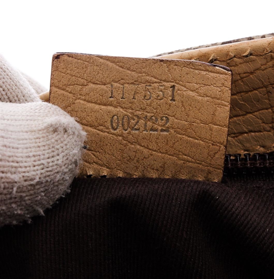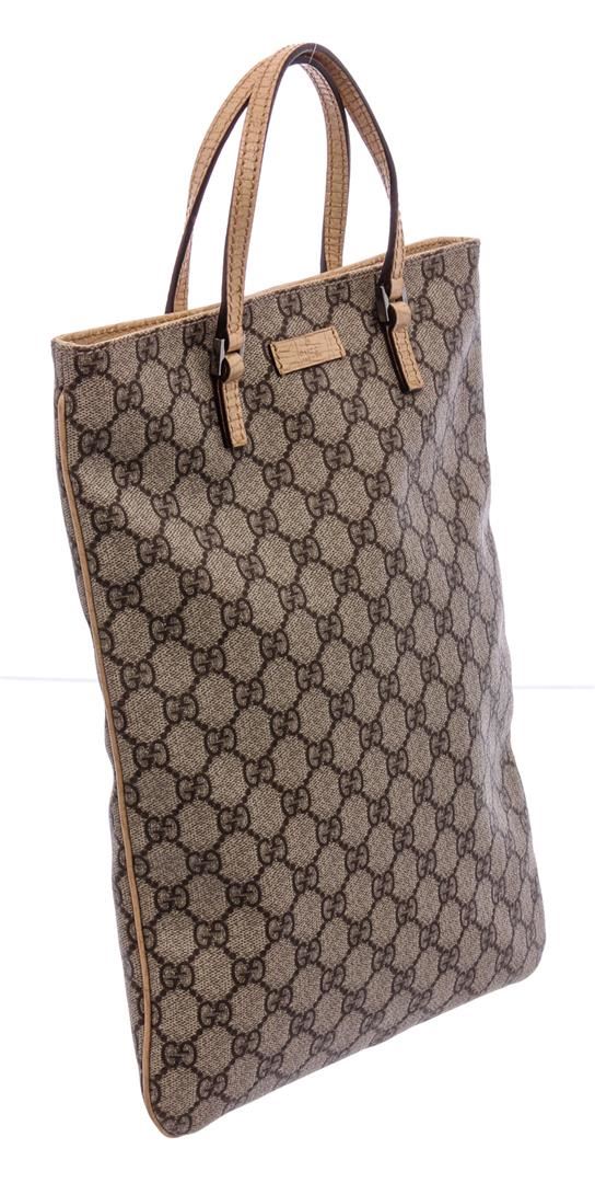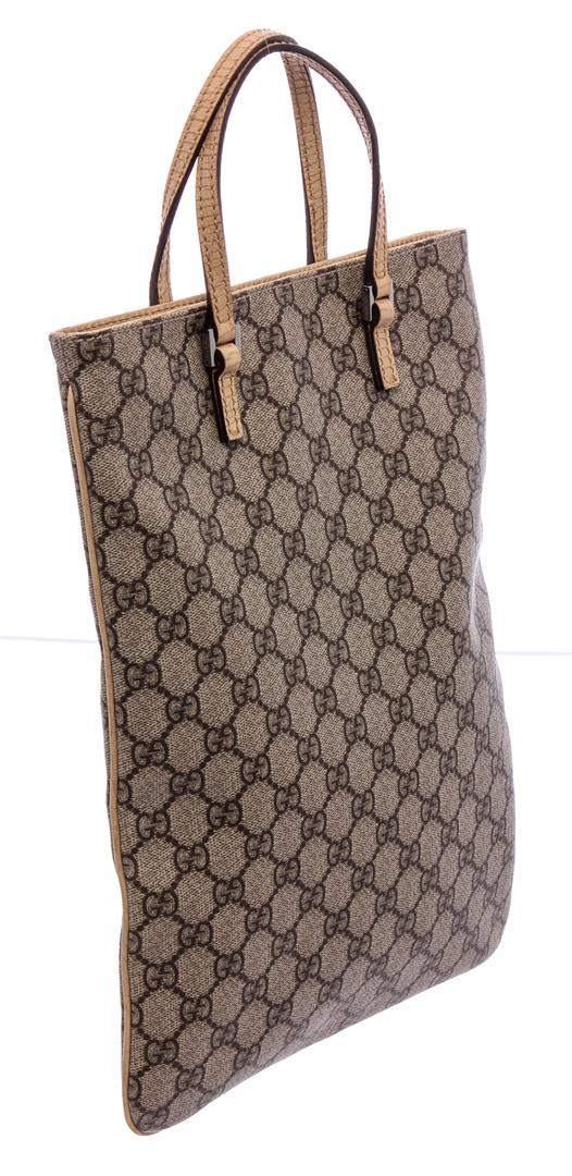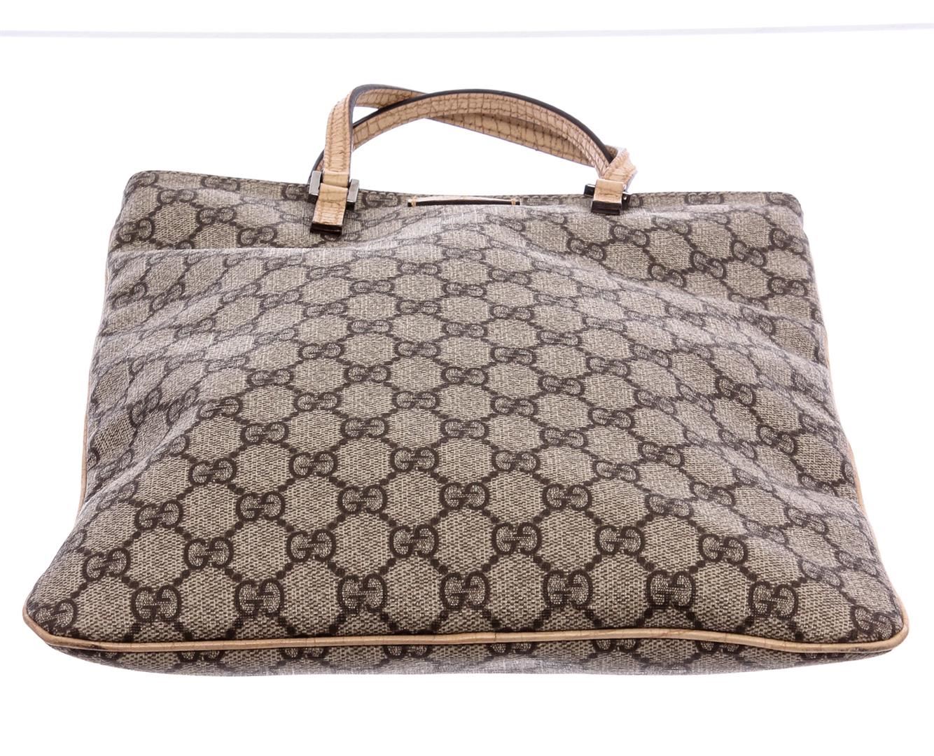 One Gucci Brown Coated Canvas Leather GG Plus Mini Tote Bag. Brown and tan GG Plus coated canvas Gucci Mini Tote with gunmetal hardware, dual flat top handles, tan leather trim, logo embossed placard at front, brown canvas lining, single zip pocket at interior wall and magnetic snap closure at top.