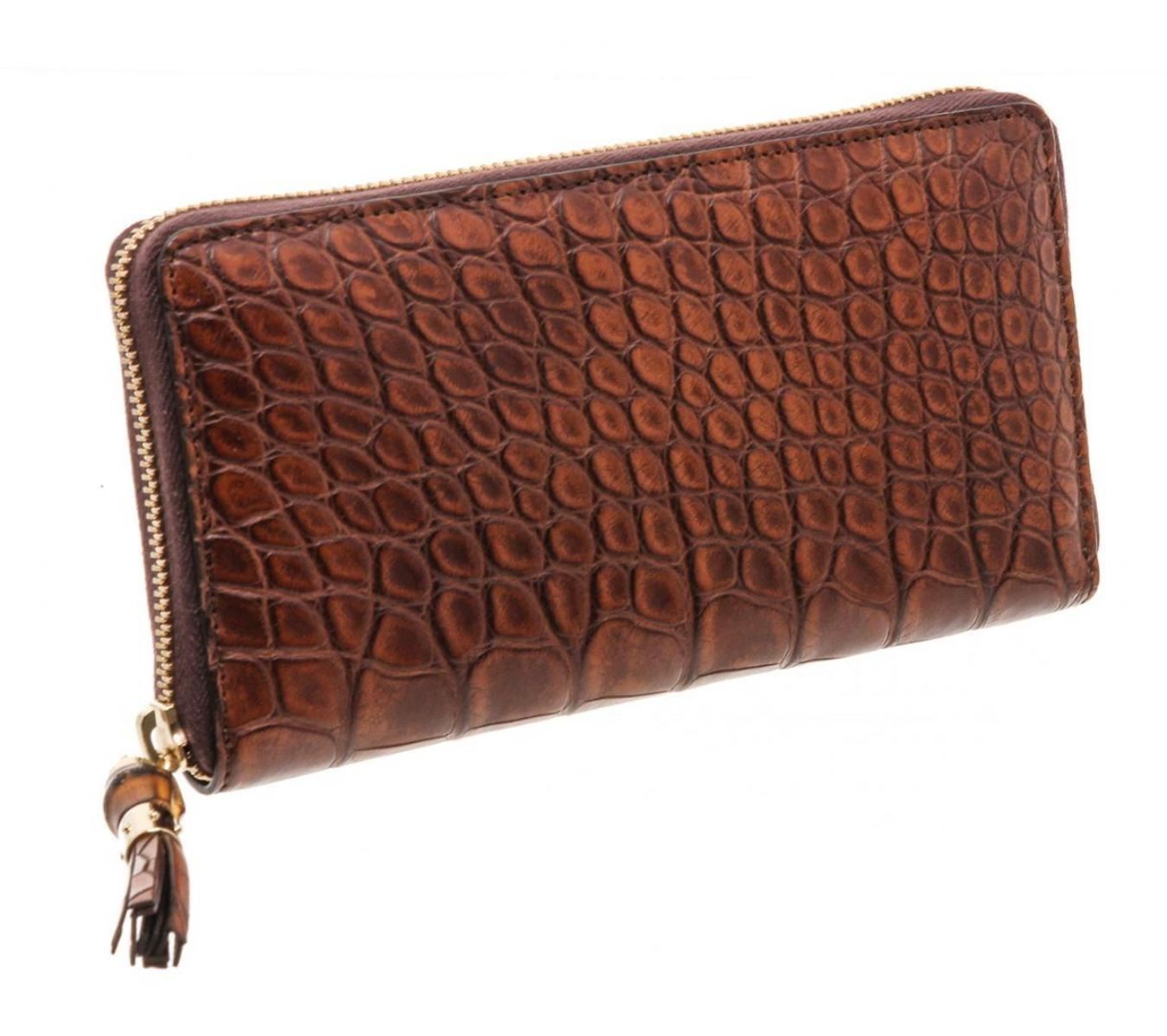 One Gucci Brown Crocodile Tassel Zip Wallet. Brown Crocodile Gucci wallet with gold-tone hardware, tonal leather lining, four compartments; one with zip closure, card slots and zip-around closure at top.