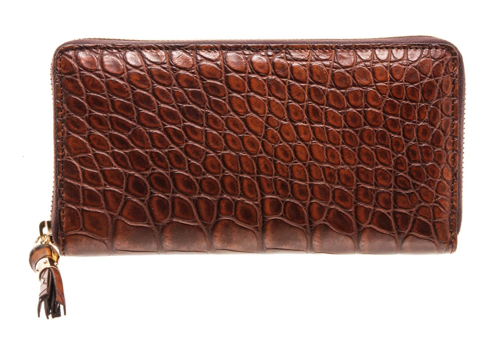 One Gucci Brown Crocodile Tassel Zip Wallet. Brown Crocodile Gucci wallet with gold-tone hardware, tonal leather lining, four compartments; one with zip closure, card slots and zip-around closure at top.