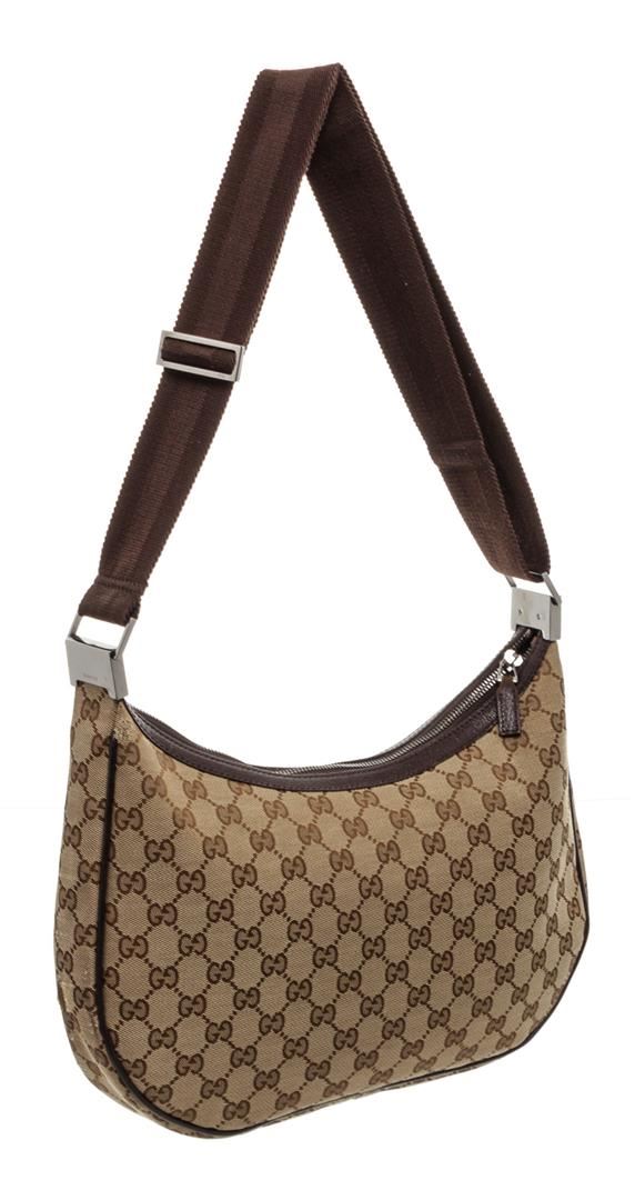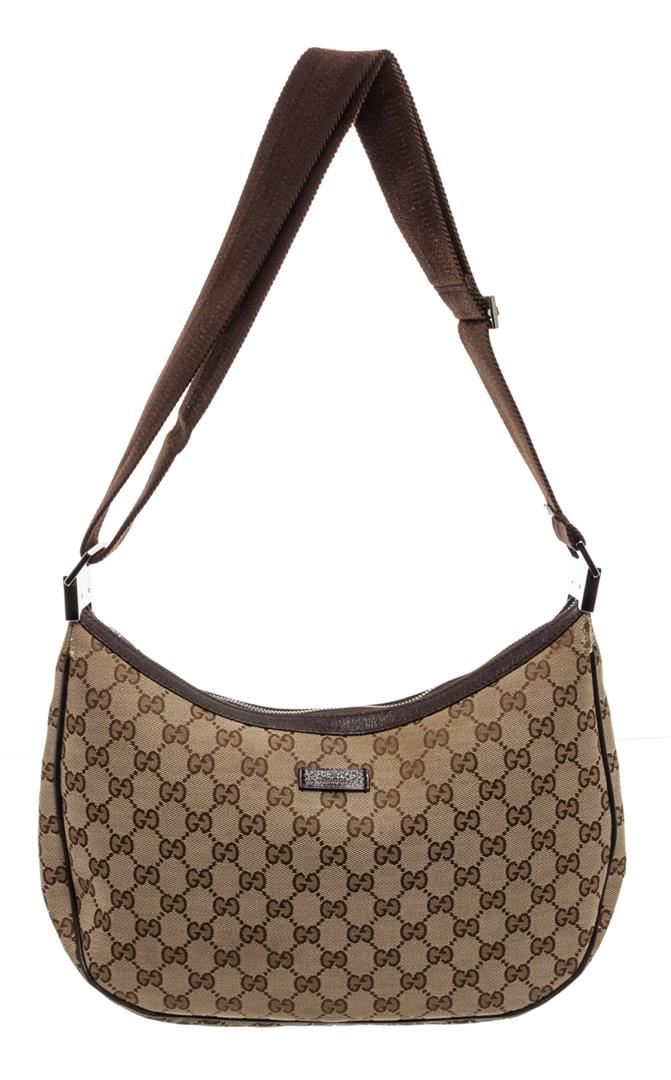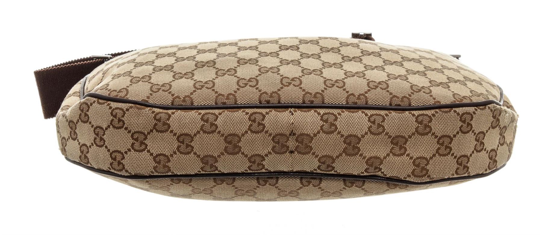 One Gucci Brown GG Canvas Leather Messenger Bag. Gucci brown GG Canvas side bag with dark brown leather trim, silver-tone hardware, brown canvas lining, interior zip pocket adjustable shoulder strap, and zip top closure. MKX