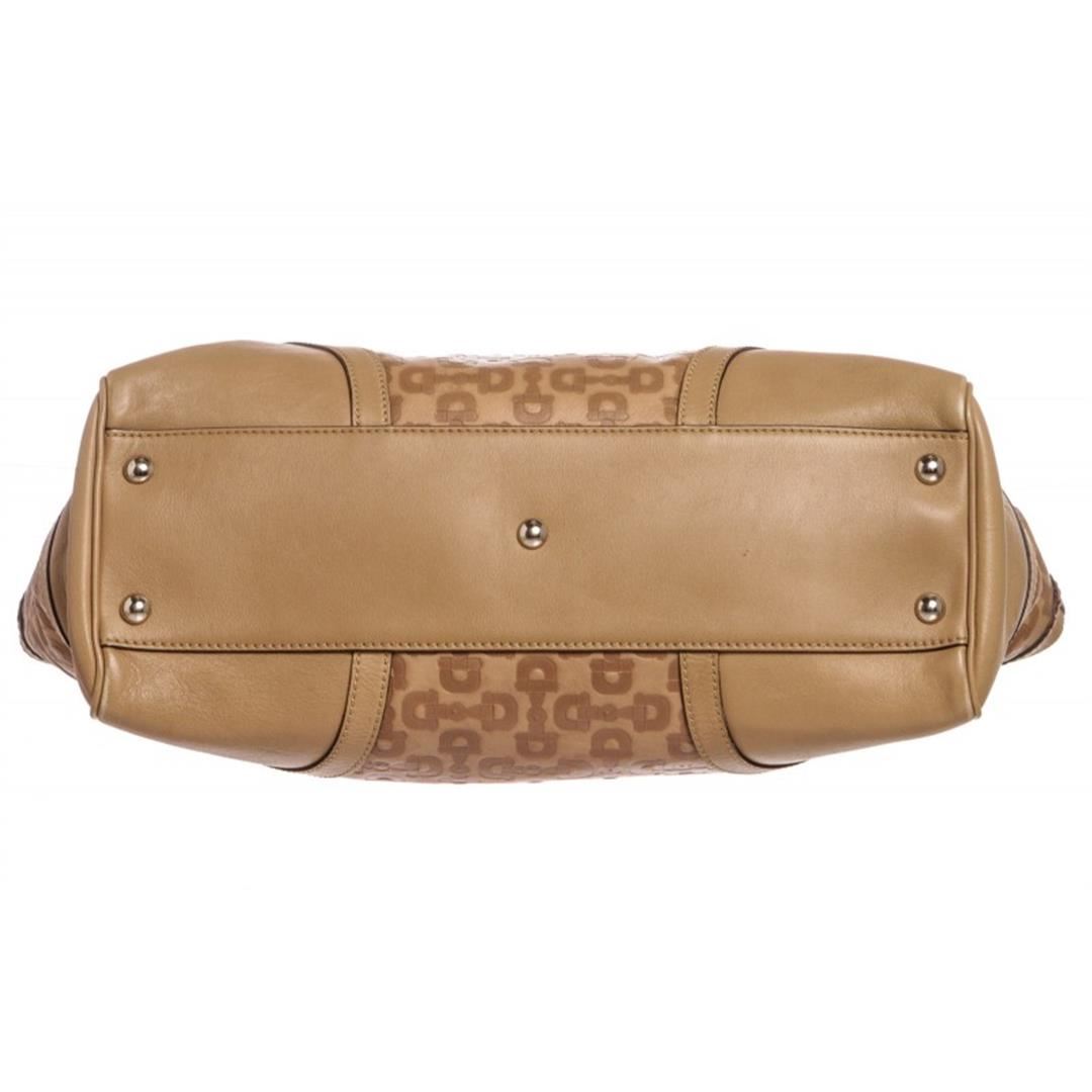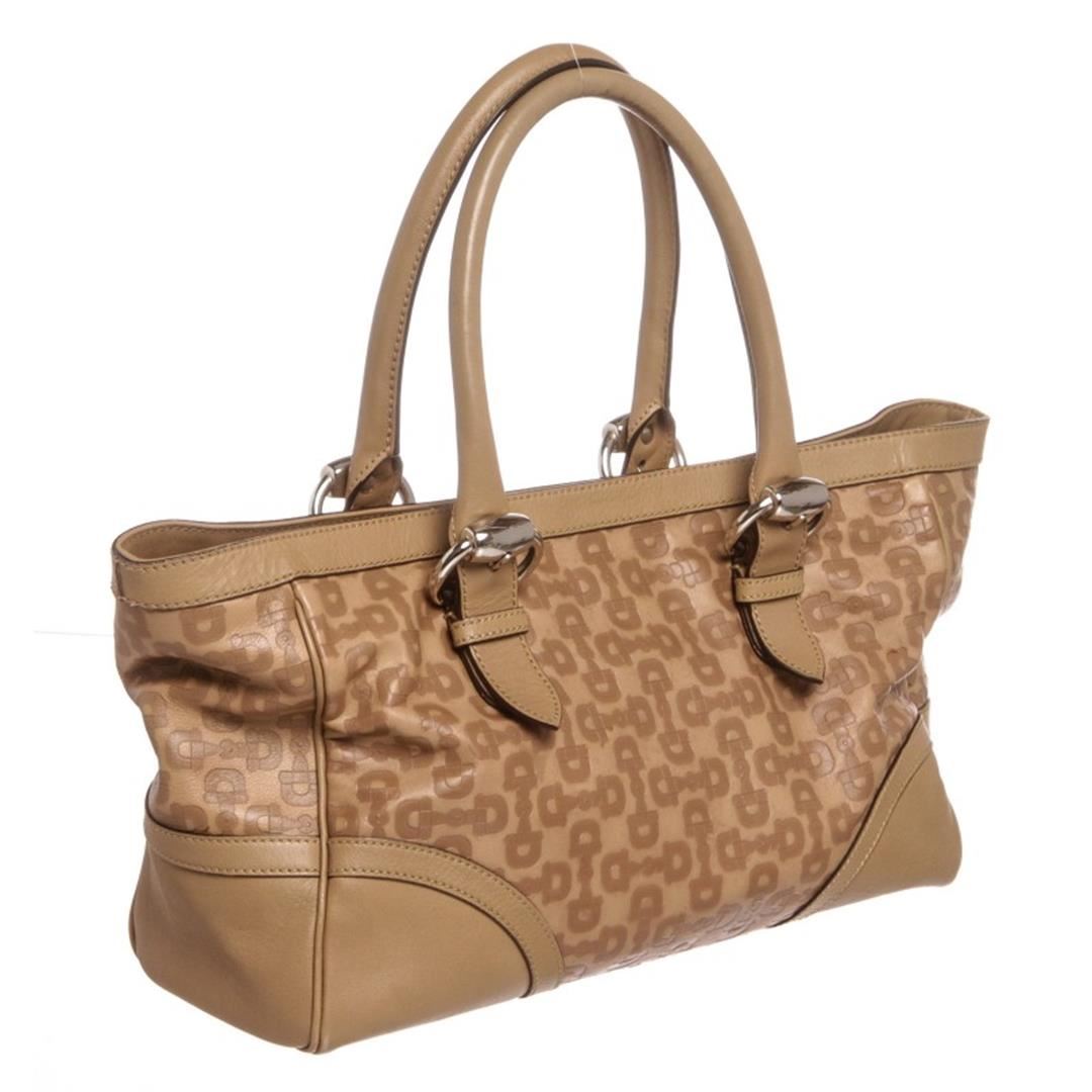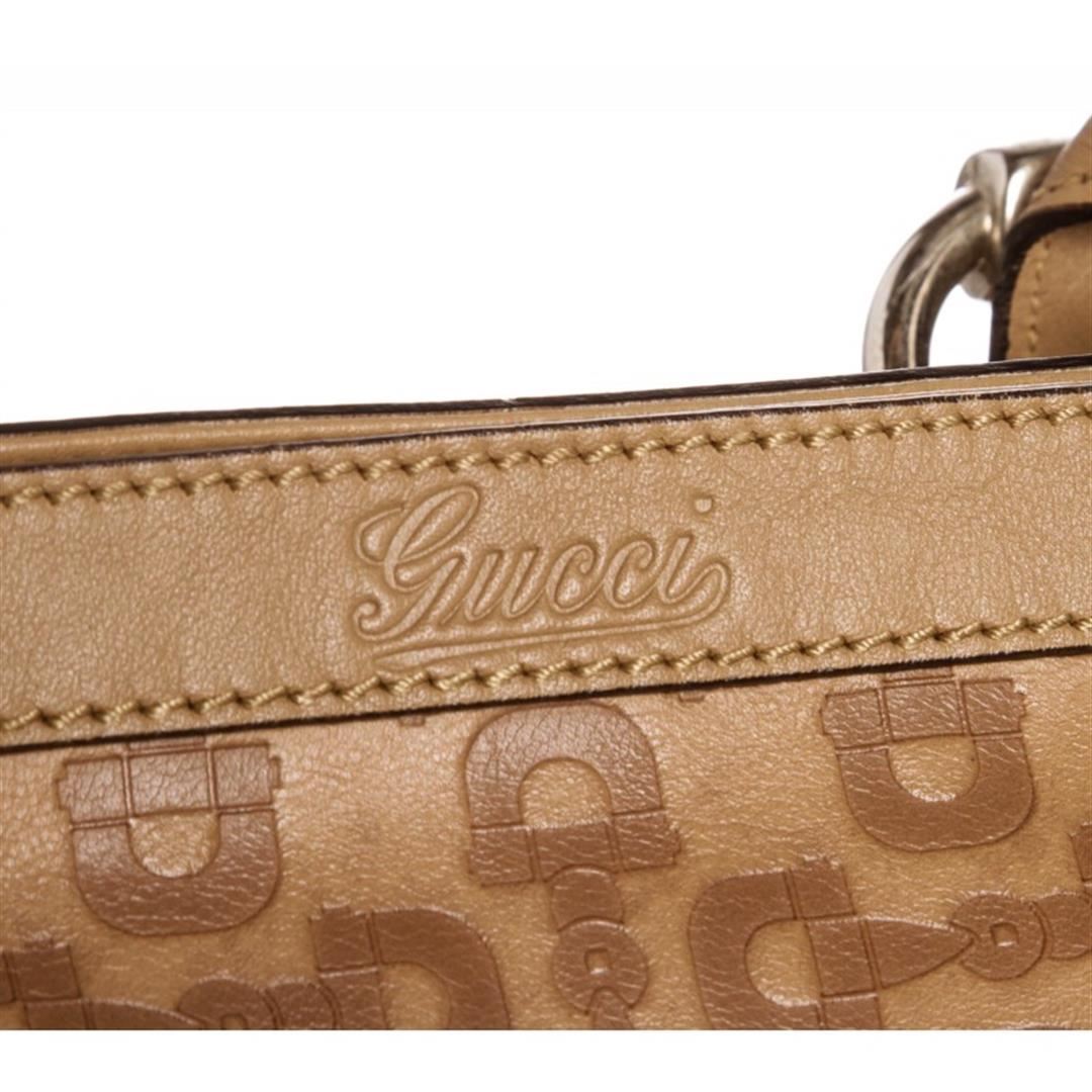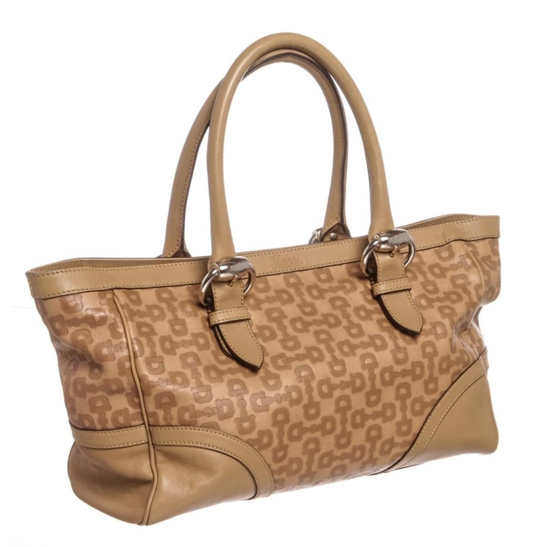 Crafted out of brown horsebit leather pattern, silver-tone hardware, dual rolled handles, and magnetic snap closure. Inner brown canvas lining and one side zip pocket. Item is pre-owned.