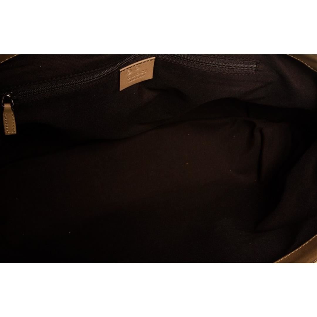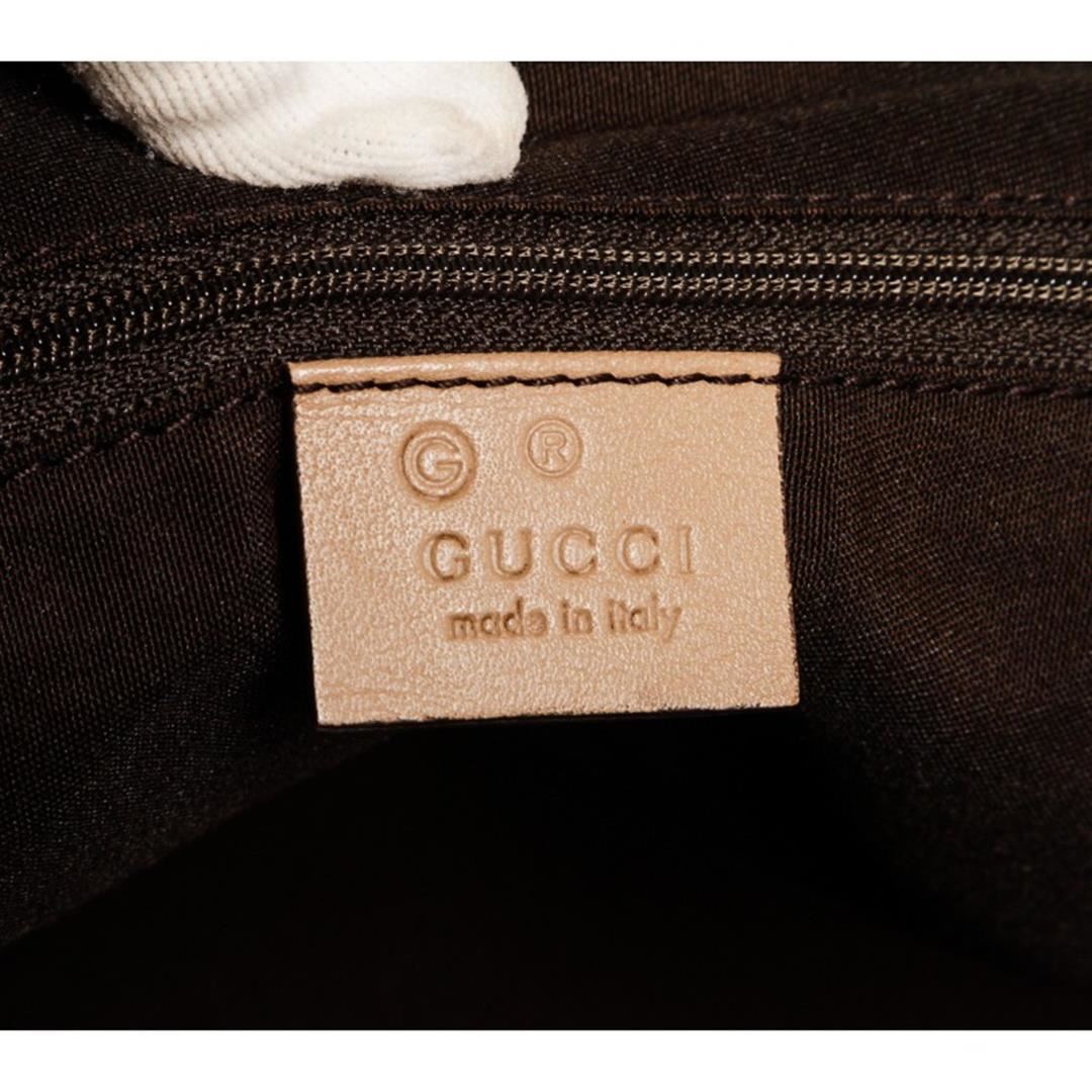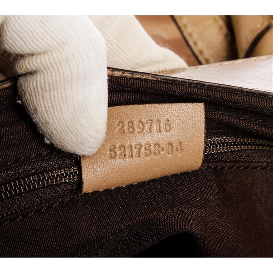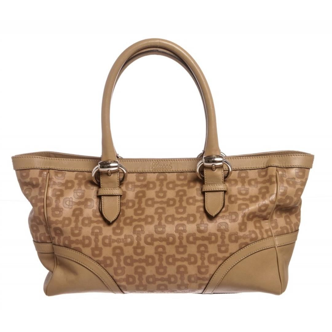 Crafted out of brown horsebit leather pattern, silver-tone hardware, dual rolled handles, and magnetic snap closure. Inner brown canvas lining and one side zip pocket. Item is pre-owned.
