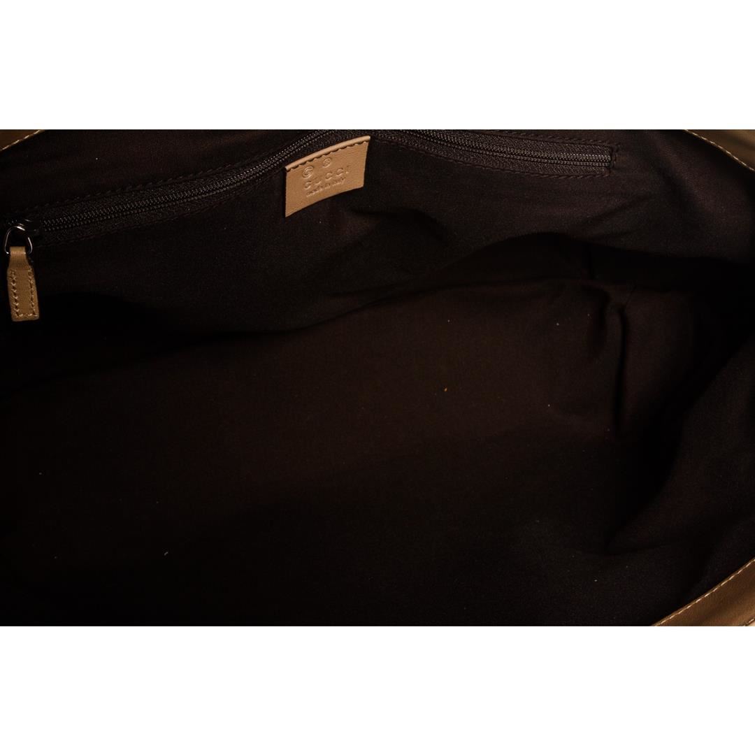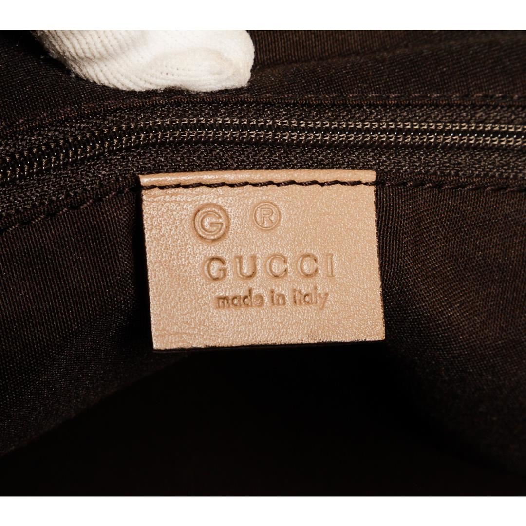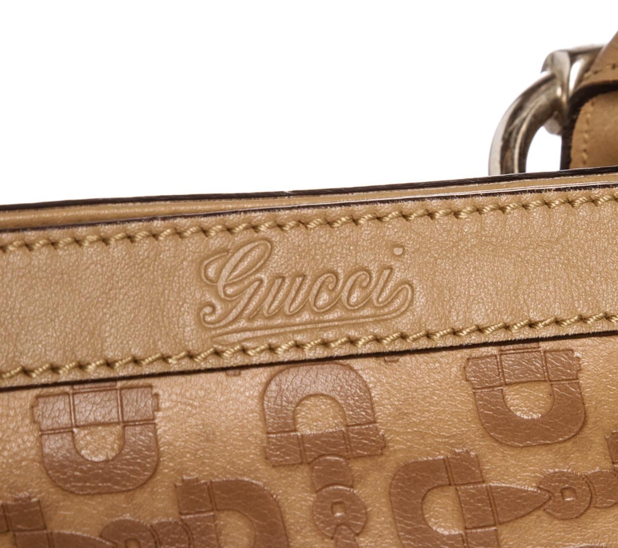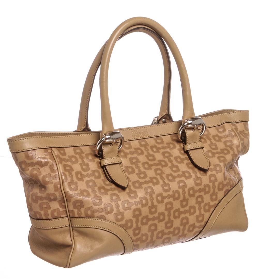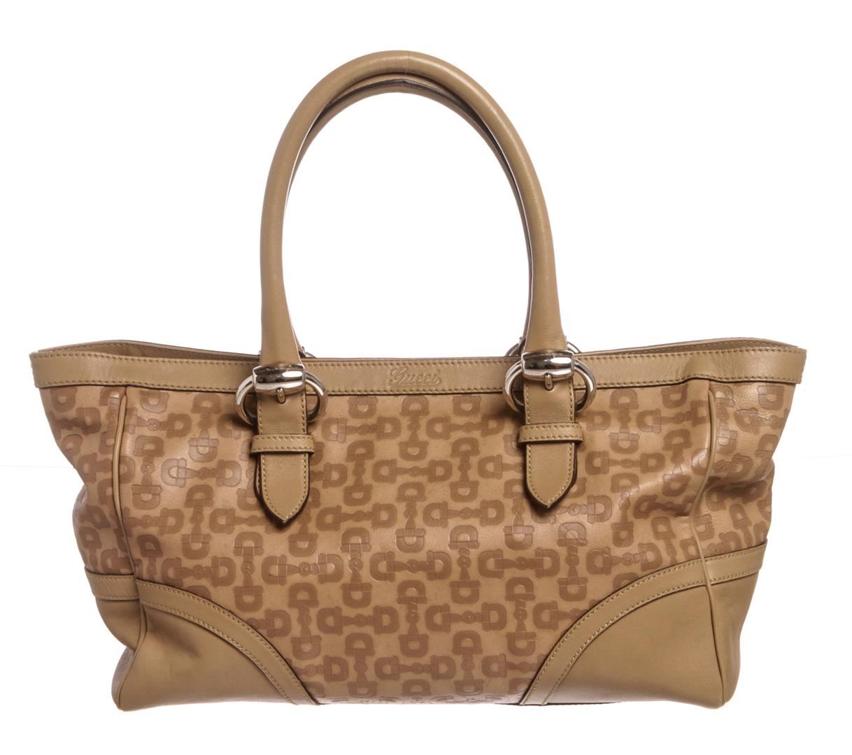 Crafted out of brown horsebit leather pattern, silver-tone hardware, dual rolled handles, and magnetic snap closure. Inner brown canvas lining and one side zip pocket.