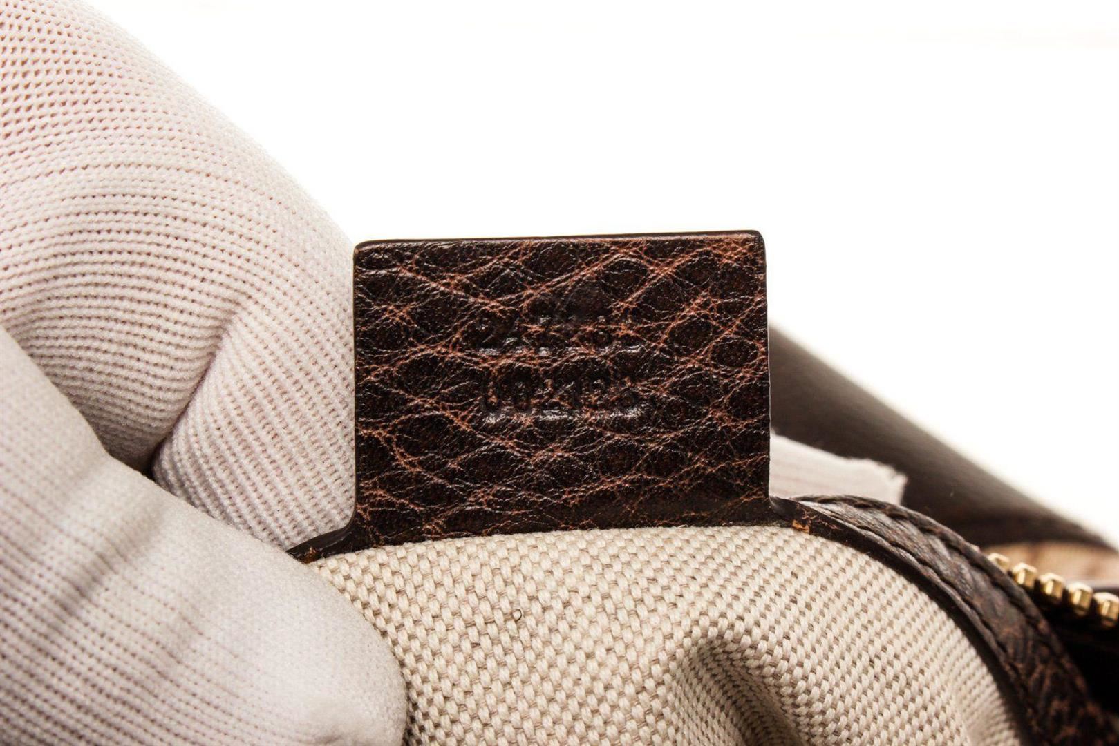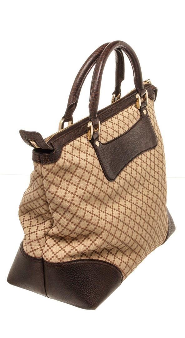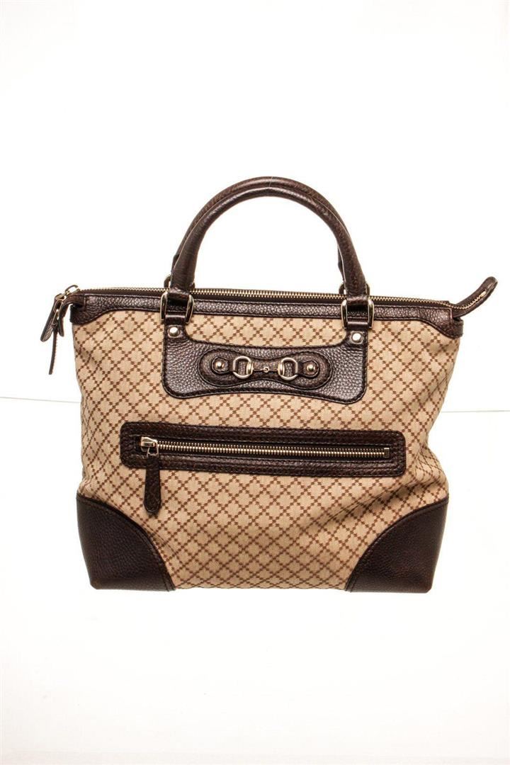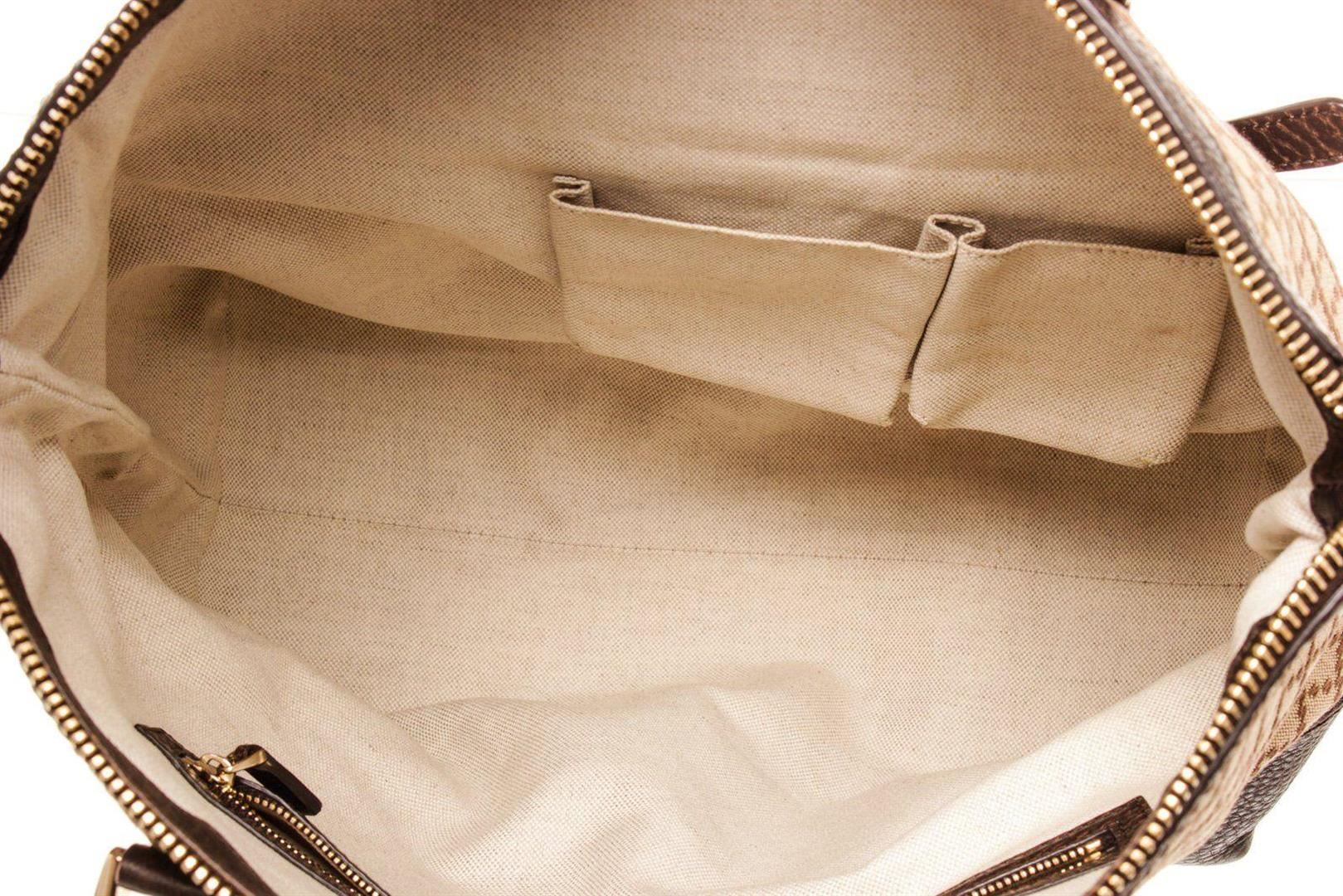 Gucci Brown Leather Catherine Tote Bag. Features green and red canvas top handles with dark brown leather grips and top zipper trim. This zipper opens to a brown fabric interior with one zipper pocket and one slip pocket,