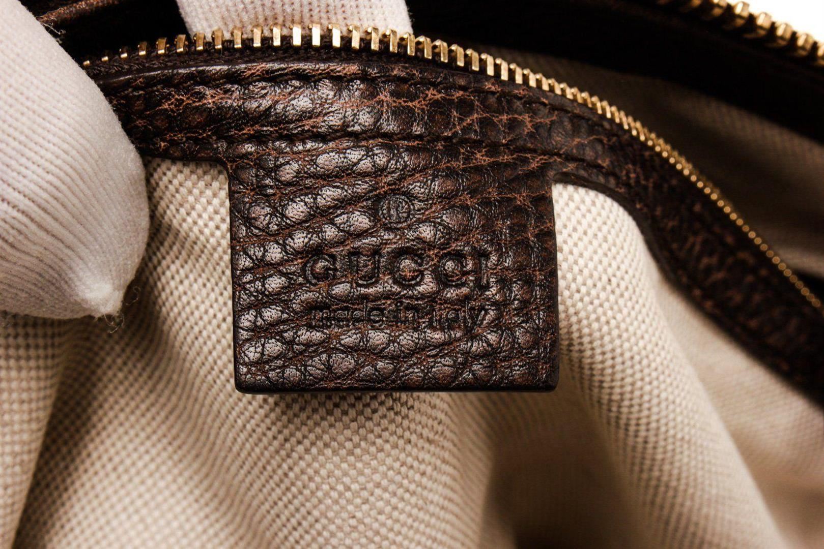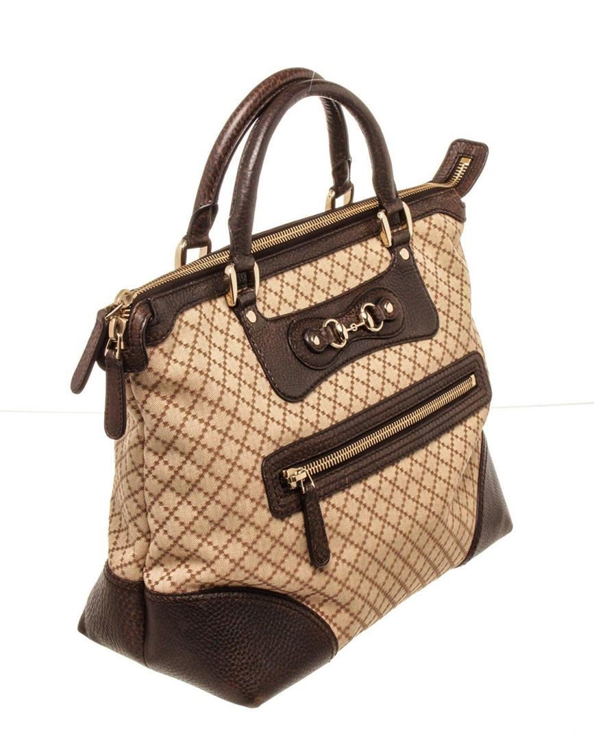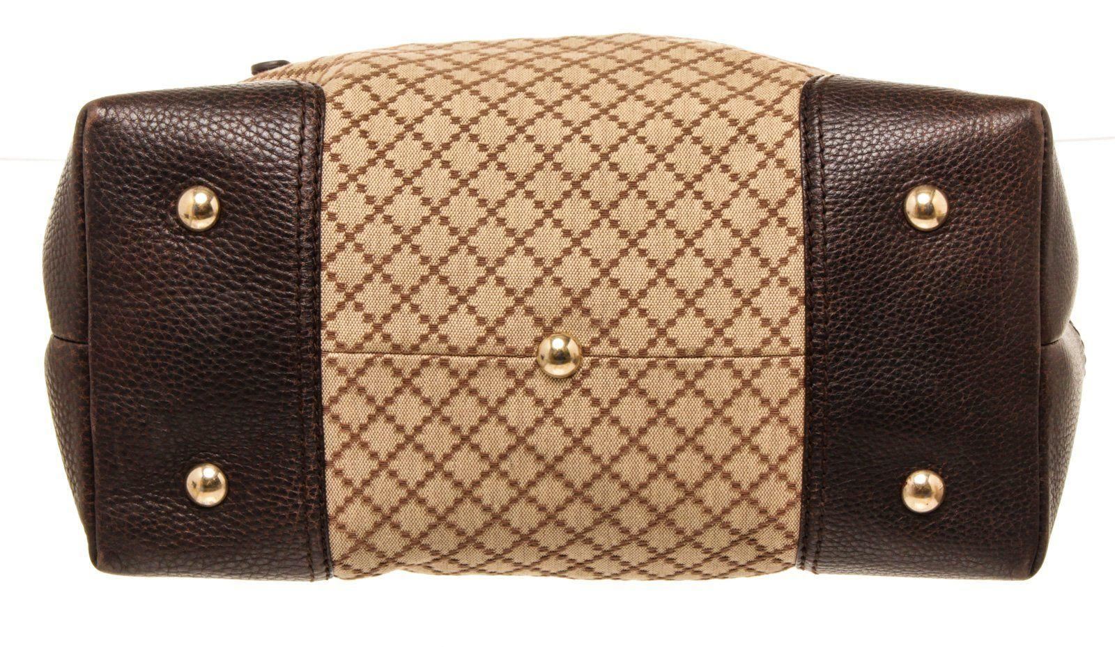 Gucci Brown Leather Catherine Tote Bag. Features green and red canvas top handles with dark brown leather grips and top zipper trim. This zipper opens to a brown fabric interior with one zipper pocket and one slip pocket,