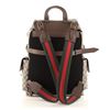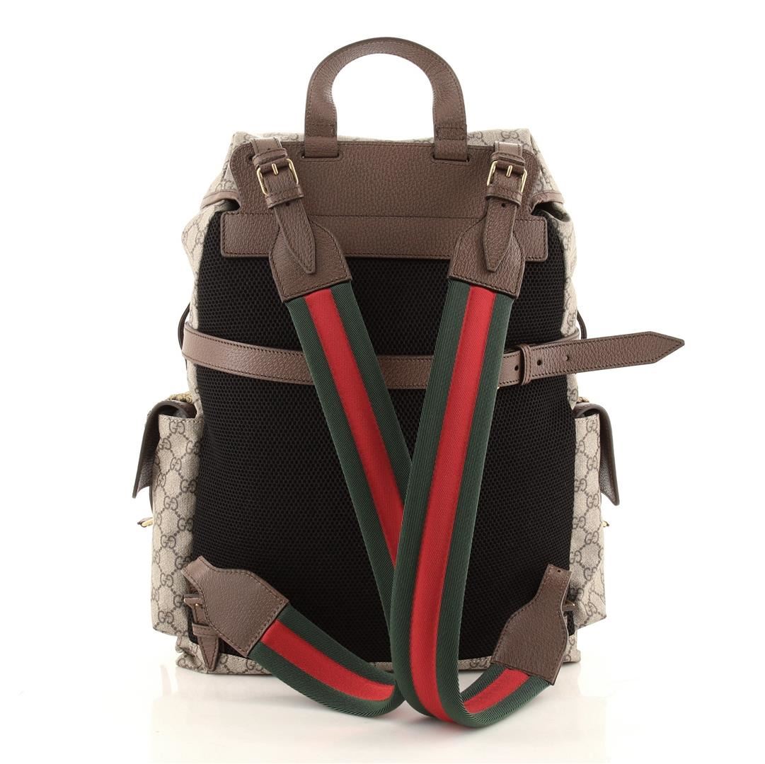 Gucci Brown Print GG Supreme Coated Canvas Donald Duck with Applique Soft Large Backpack features canvas coated soft backpack with brown leather trim, beige fine-textile interior lining, two small exterior pockets, adjustable shoulder straps, leather top handle, and drawstring closure.