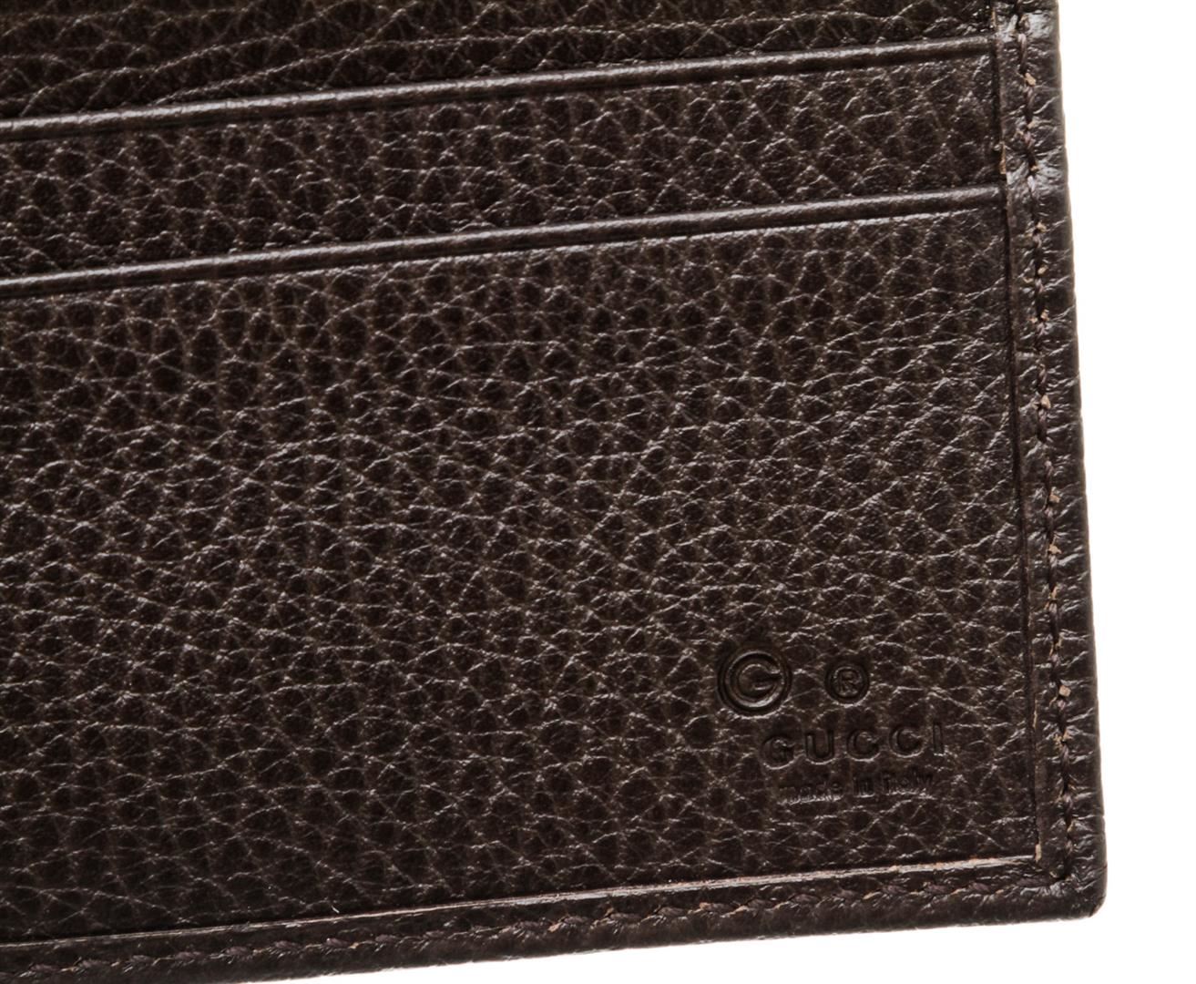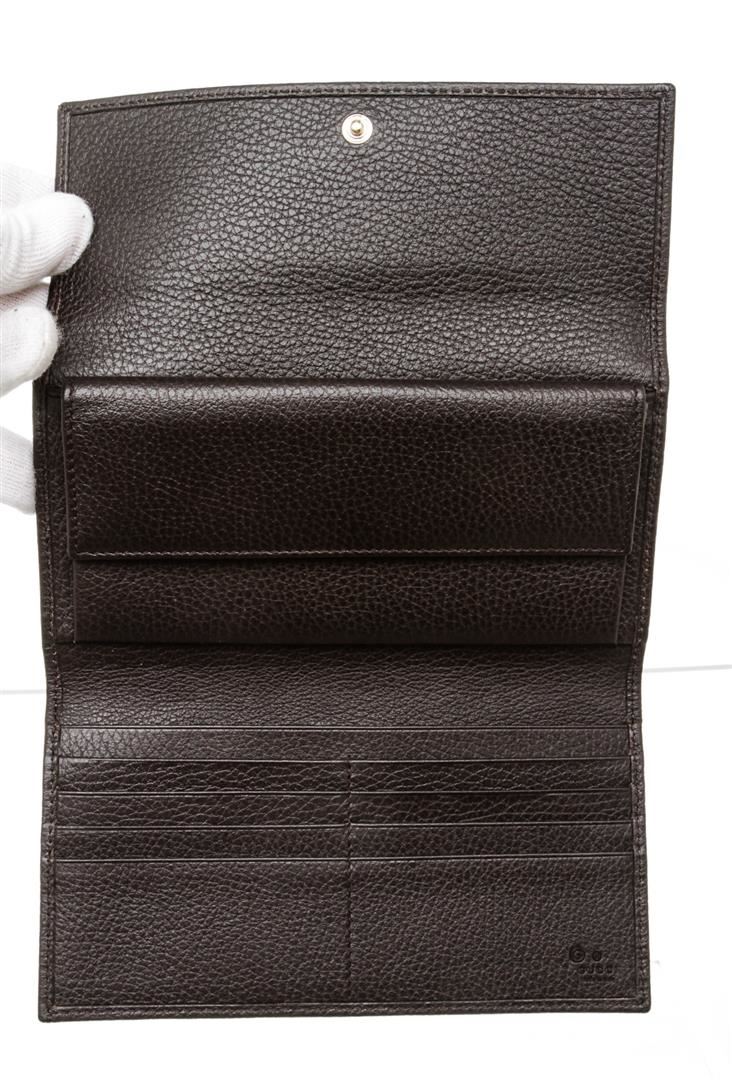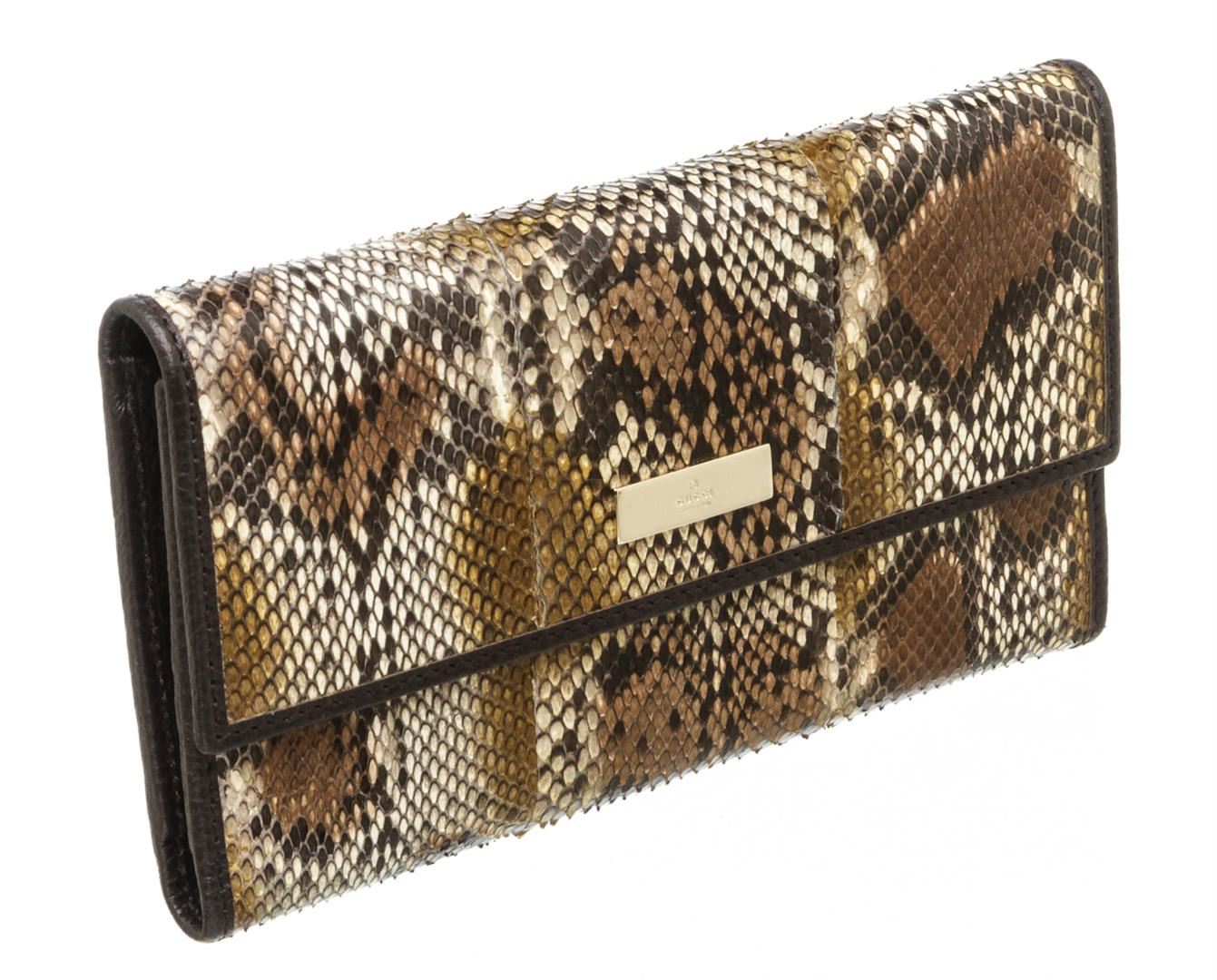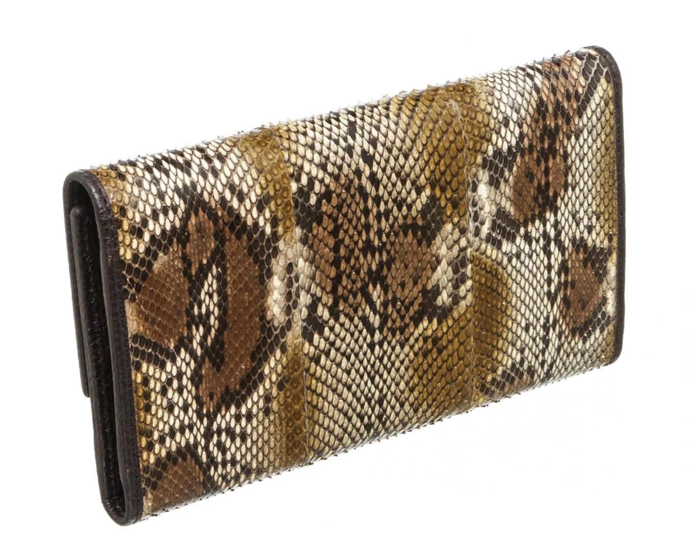 One Gucci Brown Python Trifold Wallet. Brown Python Leather Gucci Trifold Wallet featuring card holder slots, slots for bills and coin holder with snap closure. Gold-tone logo-embossed snap closure at front. MKR