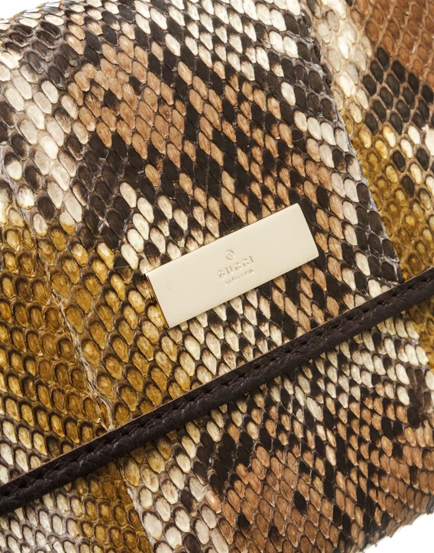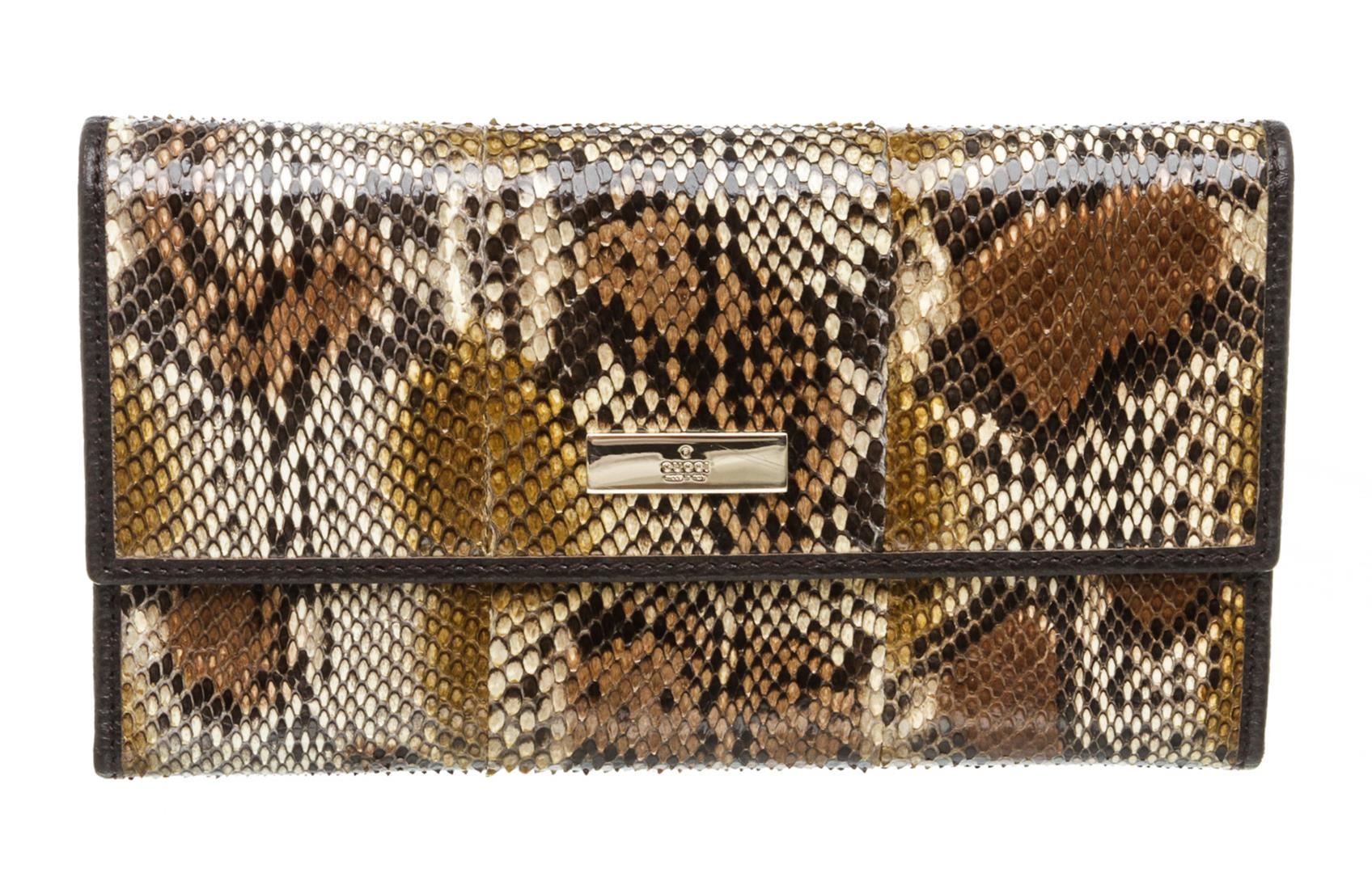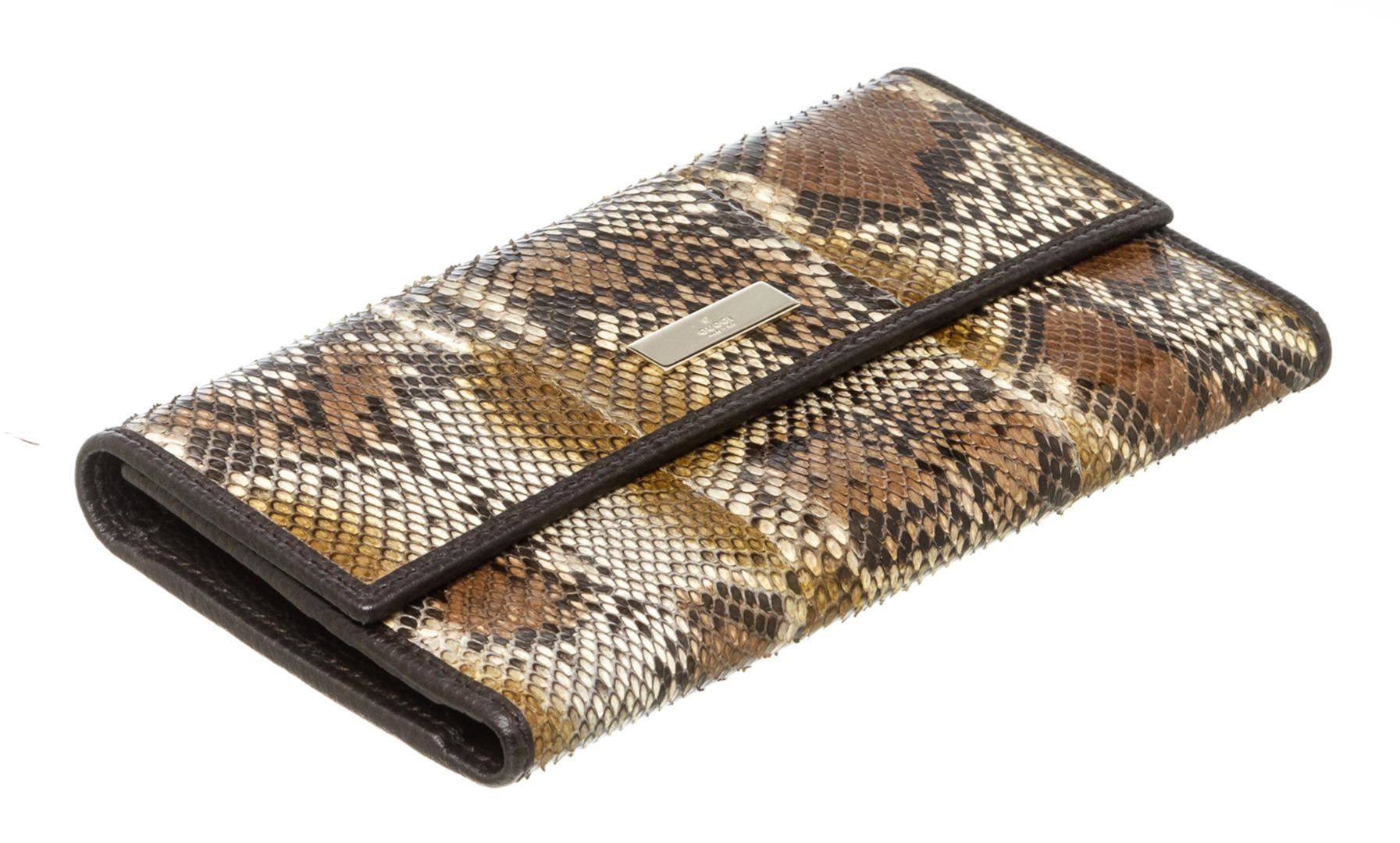 One Gucci Brown Python Trifold Wallet. Brown Python Leather Gucci Trifold Wallet featuring card holder slots, slots for bills and coin holder with snap closure. Gold-tone logo-embossed snap closure at front. MKR