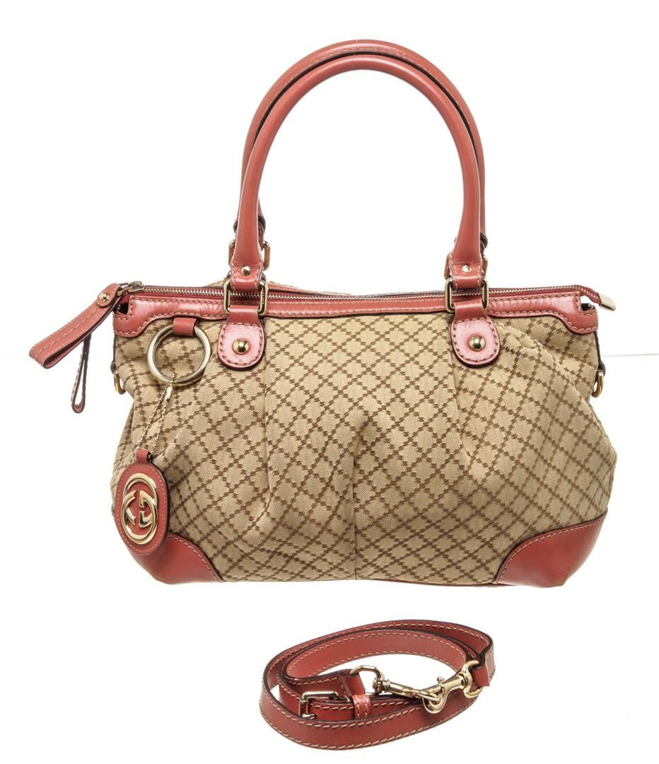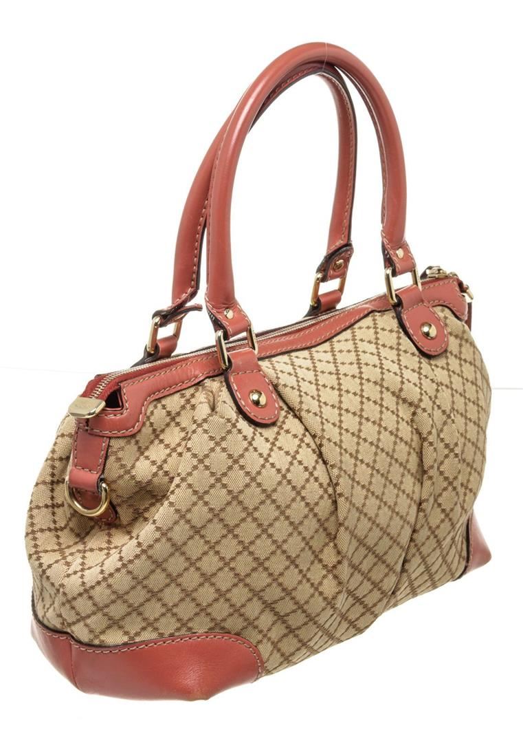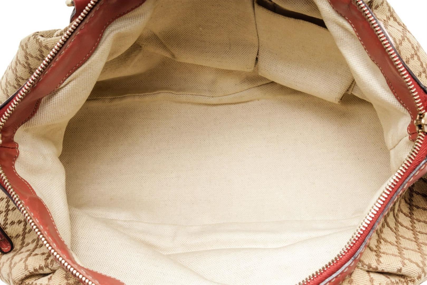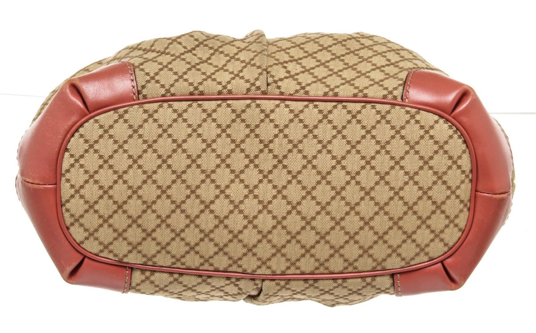 Gucci Brown Red Canvas 2 Way Shoulder Bag with canvas, gold-tone hardware, trim leather, interior slip pocket, dual top handle and zipper closure.