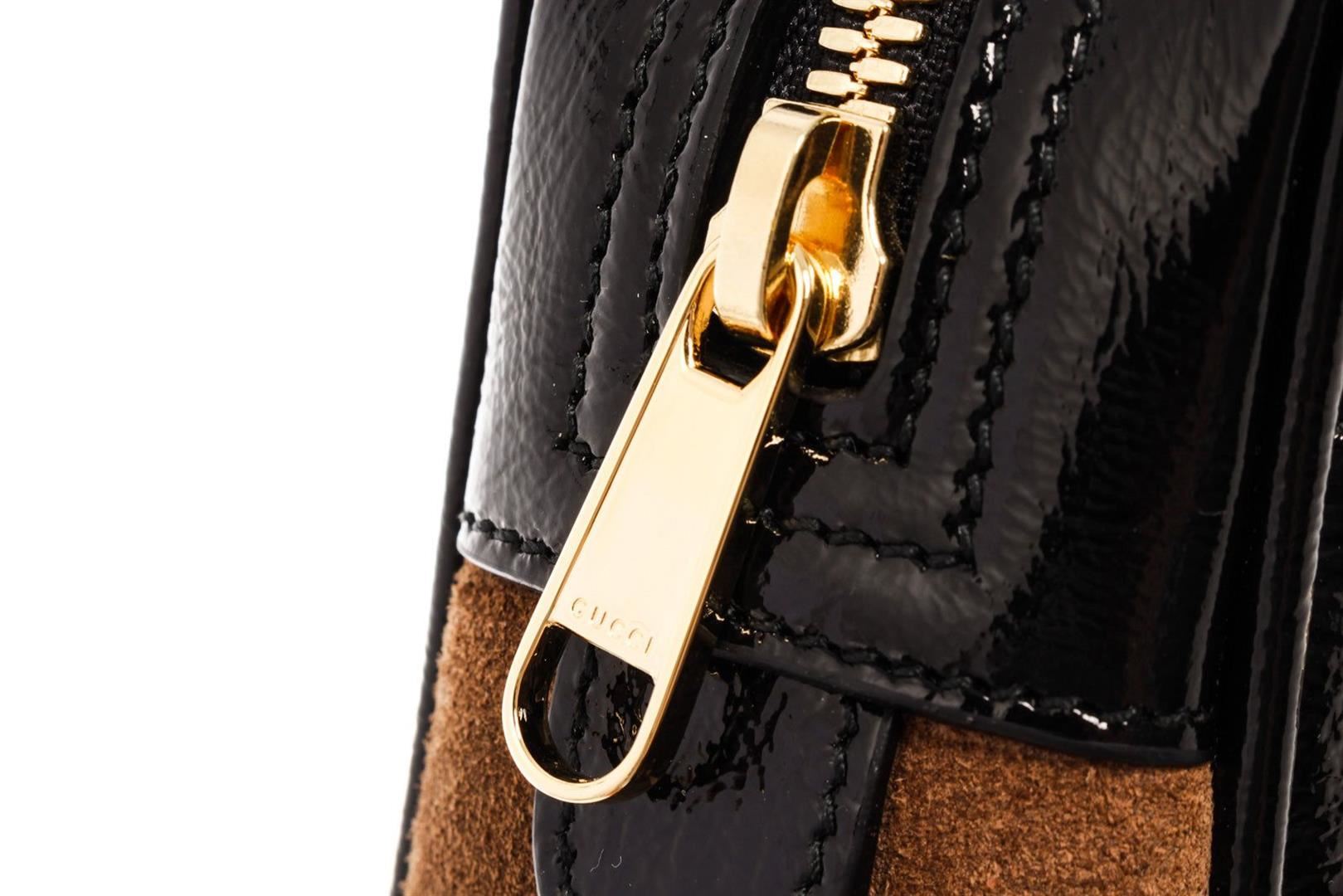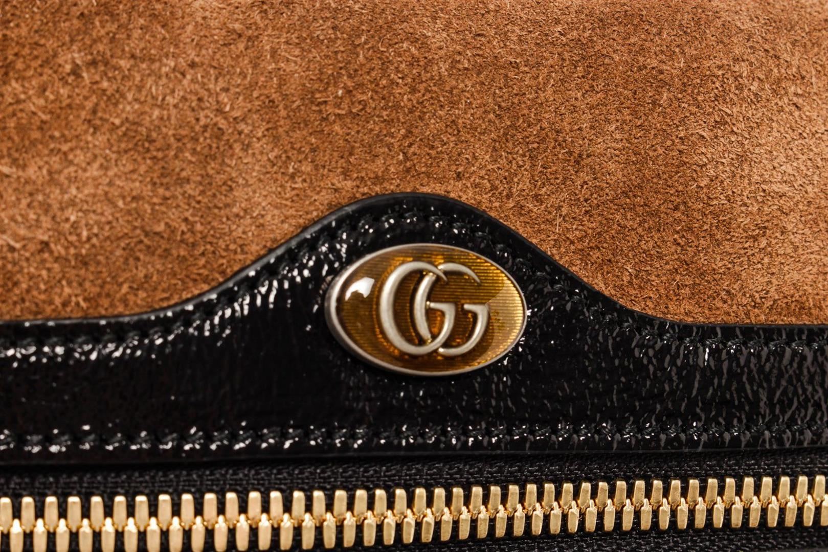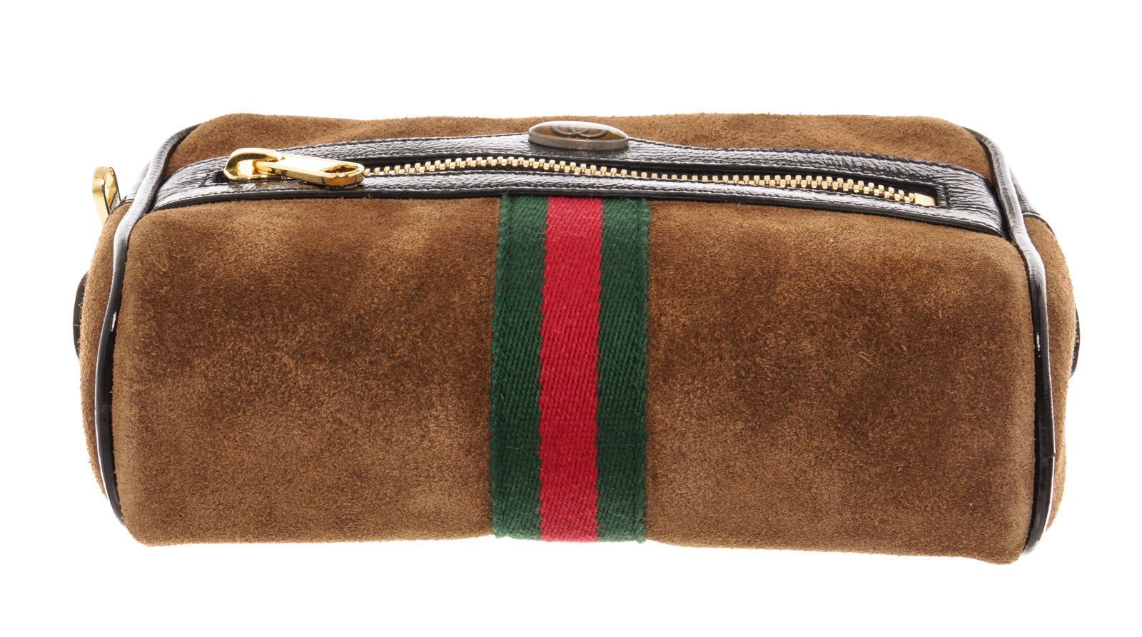 Brown suede Gucci Ophidia small waist bag with gold-tone hardware, black leather trim, an interlocking GG logo plate at front, red and green Web accent, adjustable waist strap, single exterior pocket with zipper, beige suede lining & single interior pocket and zip closure at top.