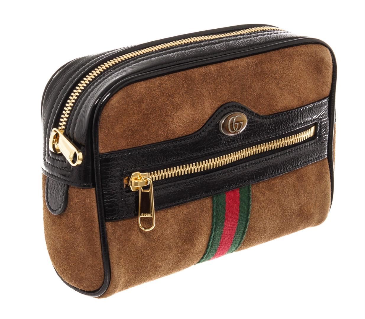 Brown suede Gucci Ophidia small waist bag with gold-tone hardware, black leather trim, an interlocking GG logo plate at front, red and green Web accent, adjustable waist strap, single exterior pocket with zipper, beige suede lining & single interior pocket and zip closure at top.