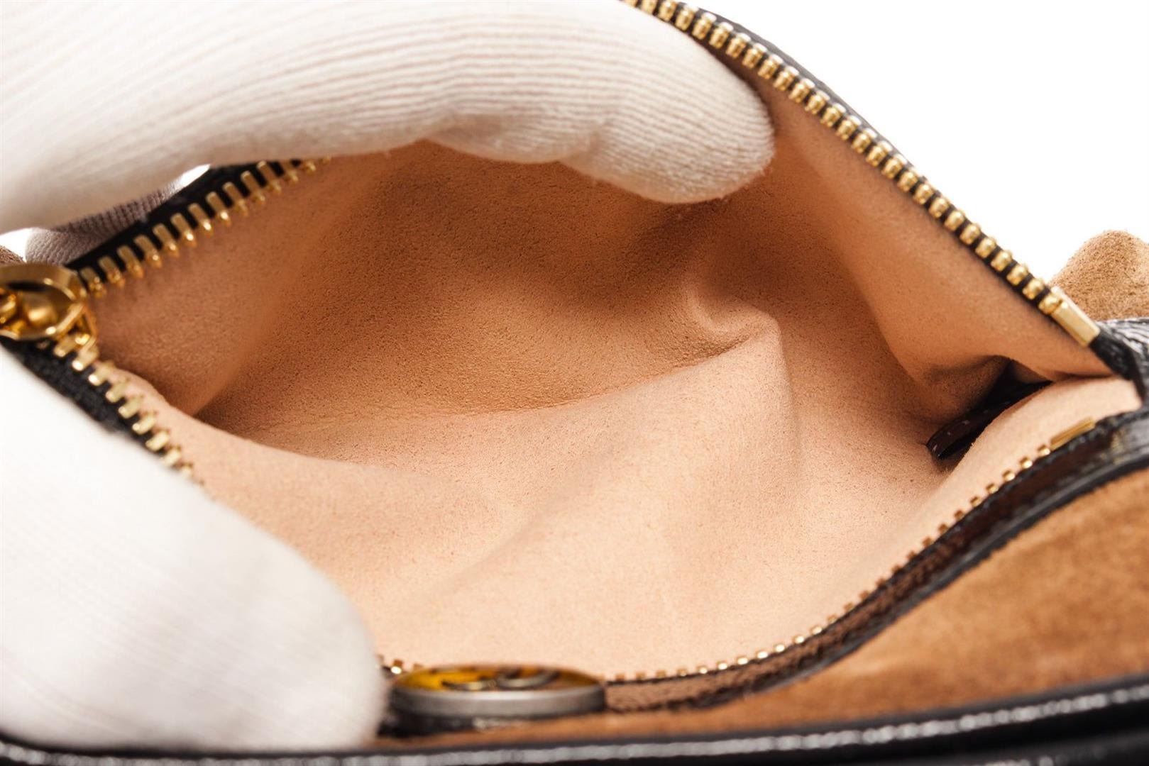 Brown suede Gucci Ophidia small waist bag with gold-tone hardware, black leather trim, an interlocking GG logo plate at front, red and green Web accent, adjustable waist strap, single exterior pocket with zipper, beige suede lining & single interior pocket and zip closure at top.