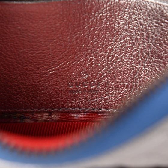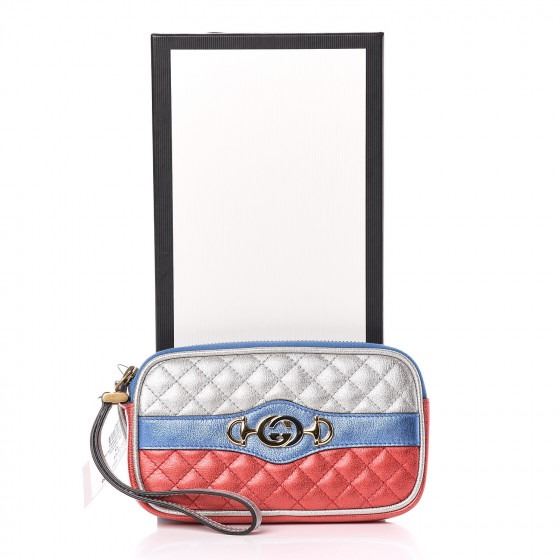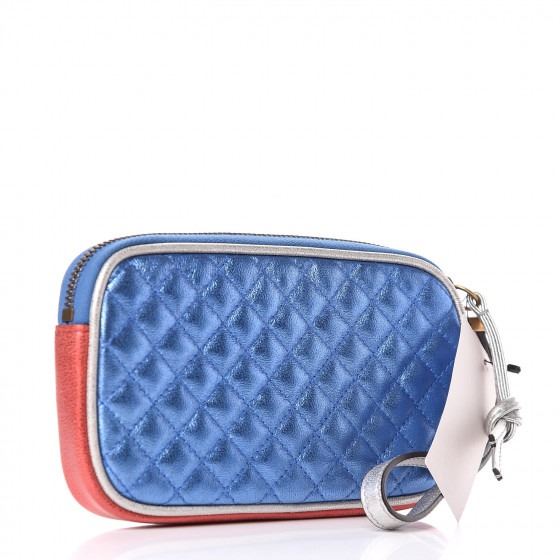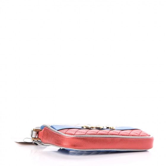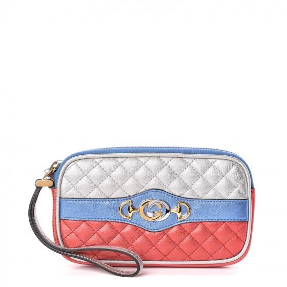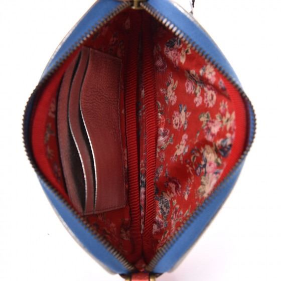 Red / Blue small bag is finely crafted of metallic silver, blue and red calfskin leather. The wristlet features a small wrist strap crafted of silver leather and gold hardware. The zip-top opens to a flower print fabric interior with two leather card slots.