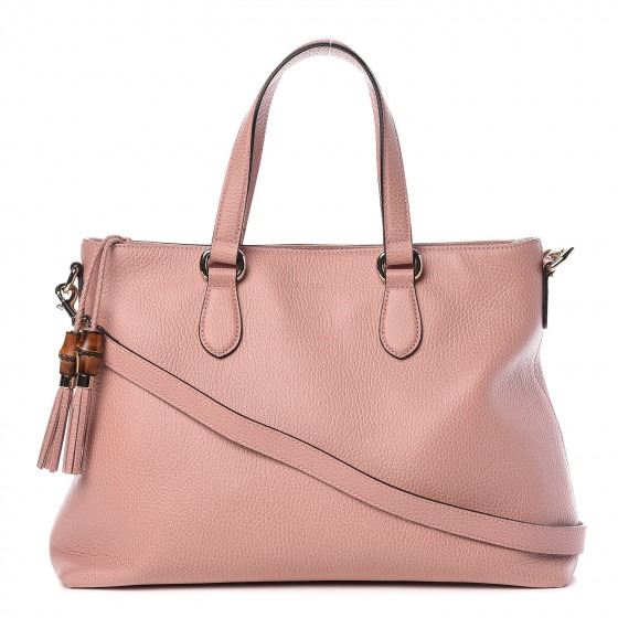 Soft Pink tote is crafted of pebbled calfskin leather . The bag features leather strap handles, an optional, adjustable shoulder strap with light gold hardware, and a bamboo-tipped braided tassel zipper pull. This opens the bag to a beige fabric interior with zipper and patch pockets.