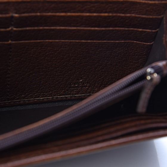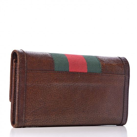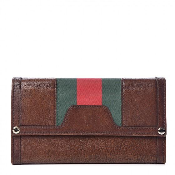 Detail: Wallet is crafted of brown calfskin leather with a green and red stripe detail. This wallet features a front flap with a snap button closure. The flap opens to a brown leather interior with card slots, zipper compartment, and a bill compartment.