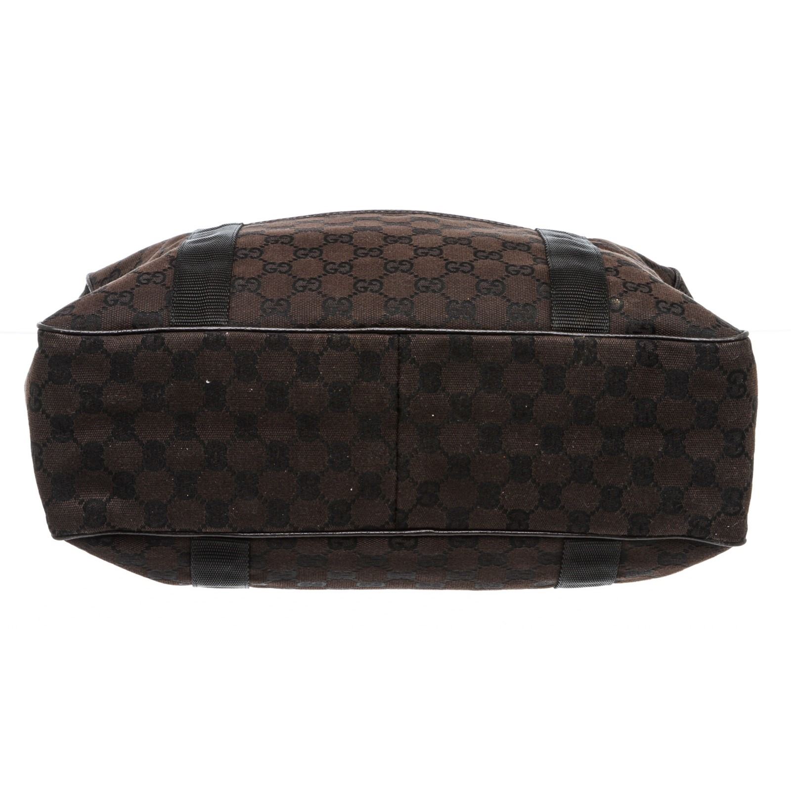 Gucci dark brown GG Canvas laptop shoulder tote bag with nylon and leather trim, tonal canvas lining, interior zip pocket, interior slip pocket, front exterior slip pocket, and overall zipper closure.