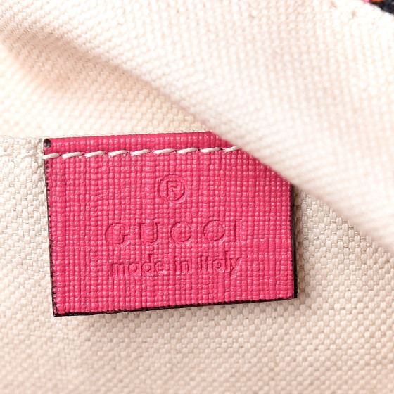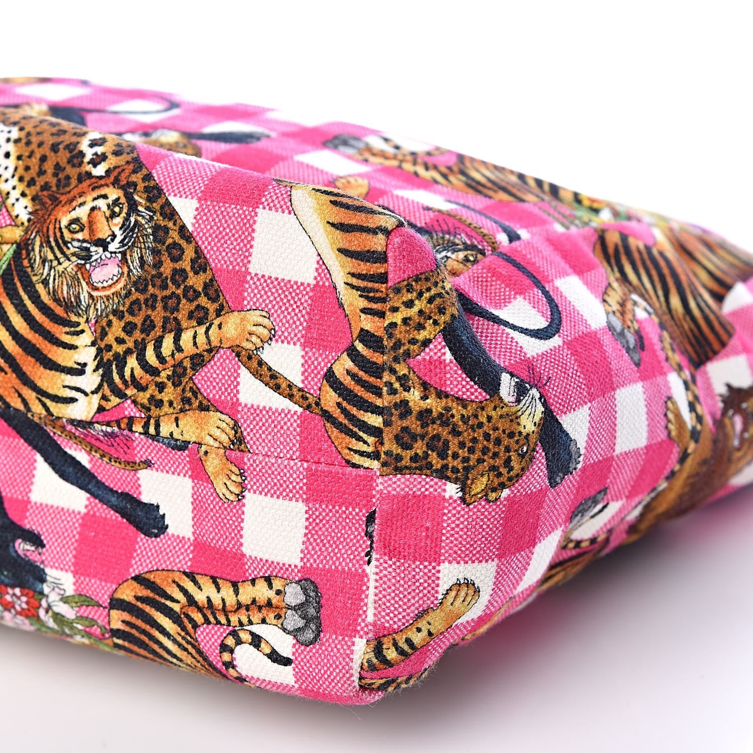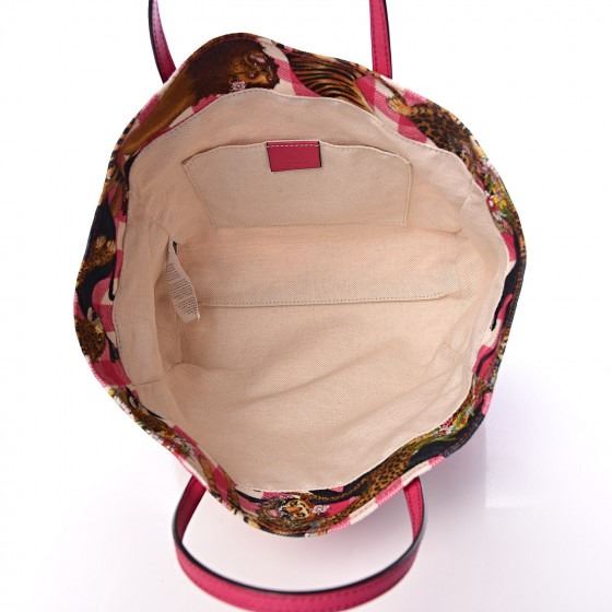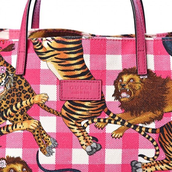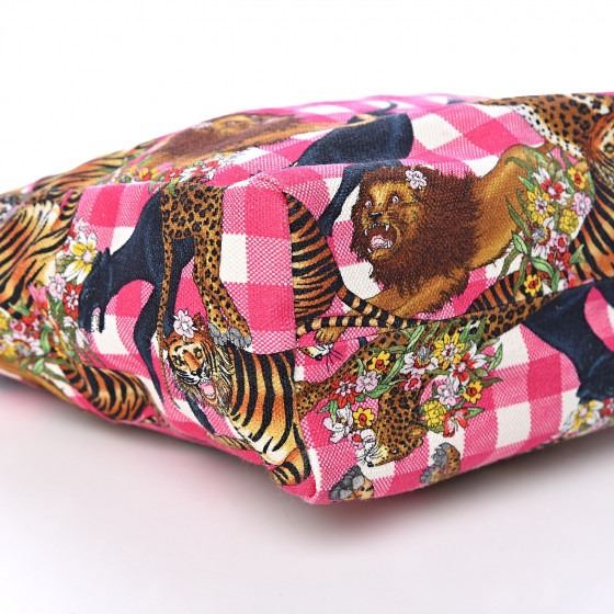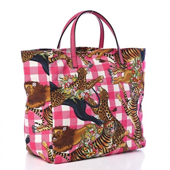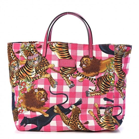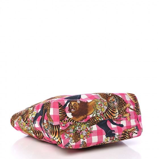 This tote is crafted of pink and white plaid canvas, with a feline overlay featuring lions, tigers, panthers, and leopards with floral accents. The bag has pink leather top handles, and the top is open to an ivory canvas interior with a patch pocket.