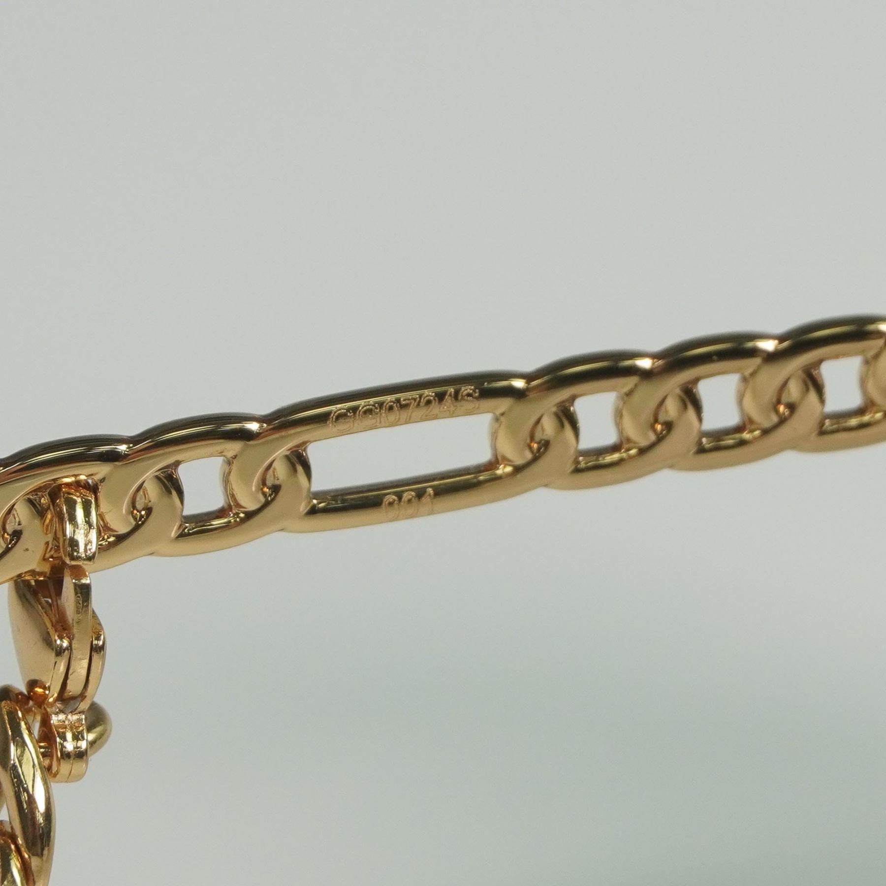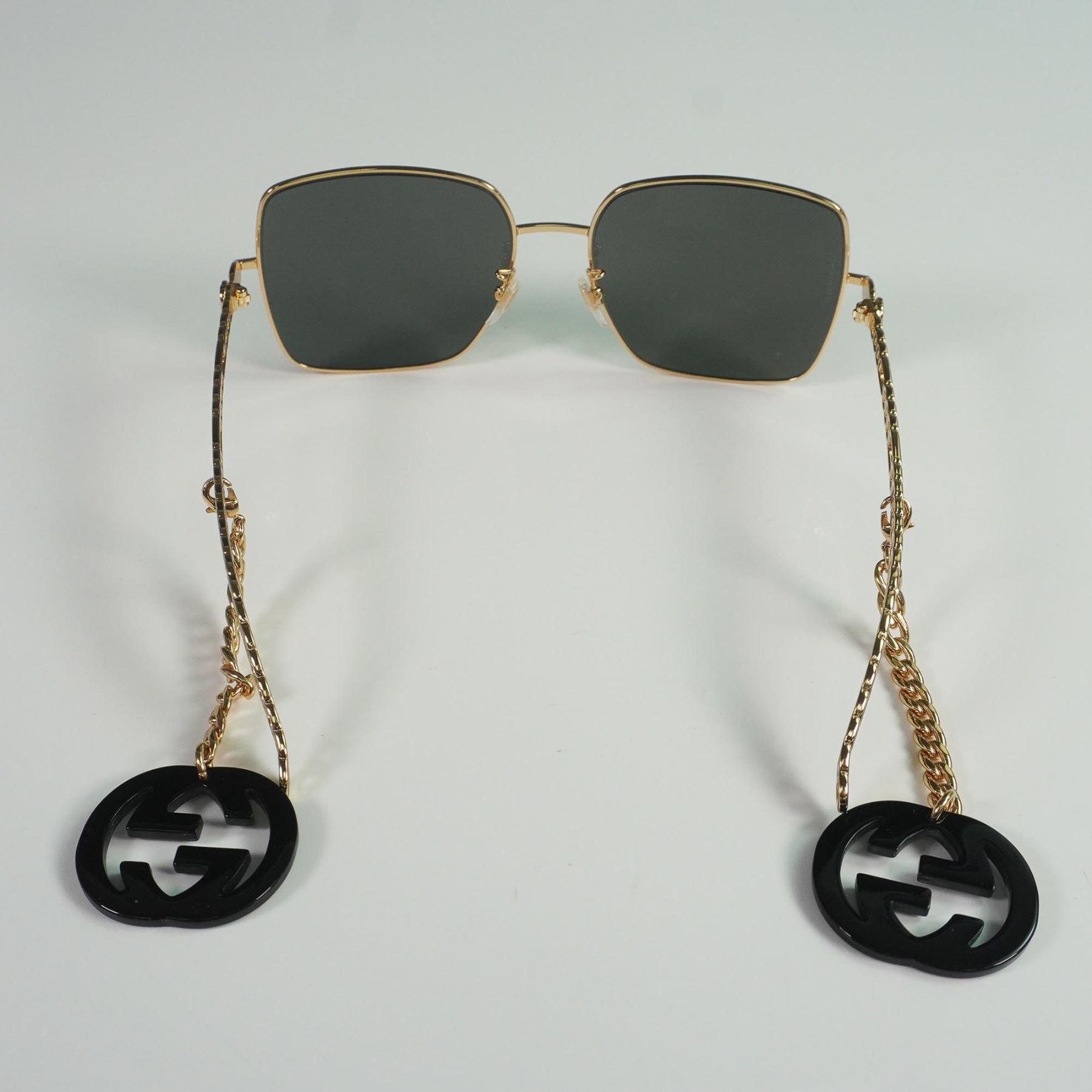 Pair of designer sunglasses featuring square gradient lenses set in gold toned metal frames with intricate chain link along the arms. Each side is adorned with dangling, detachable charms featuring the iconic Gucci interlocking GG logo in black acrylic. Exquisite bold and fashionable piece that blends luxury and edge. Inner temple marked GG0724S.