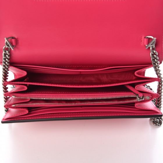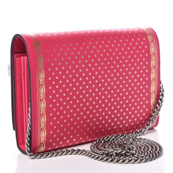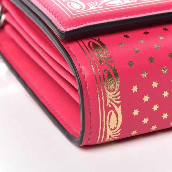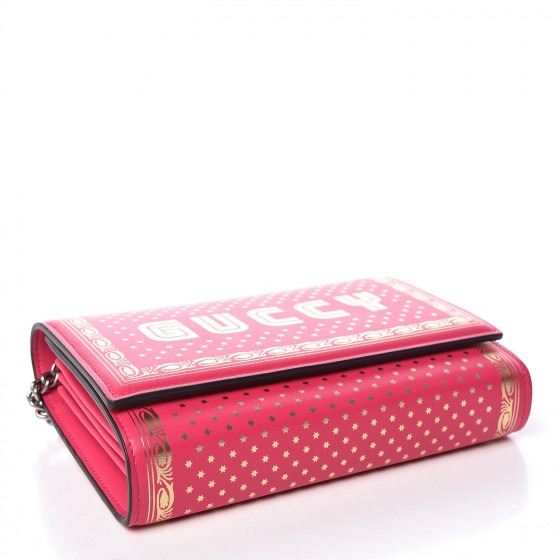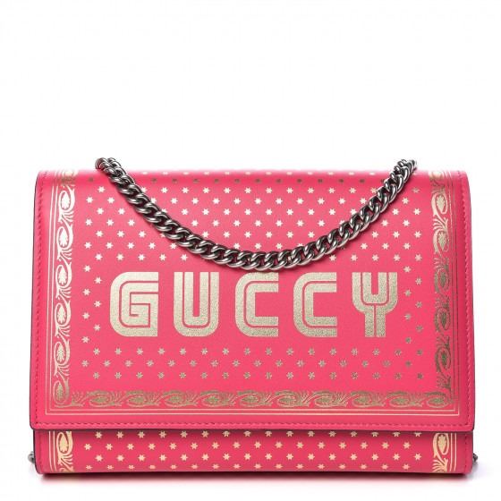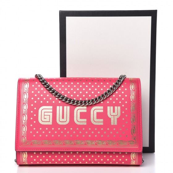 Pink chic shoulder bag is crafted of bright pink calfskin leather with gold detailing and "GUCCY" printed across the center of the bag using the "Sega" video game lettering as an homage to the 80s. The bag features a aged silver removable shoulder strap and the flap opens to pink leather interior with a center zippered compartment, patch pockets and card slots.