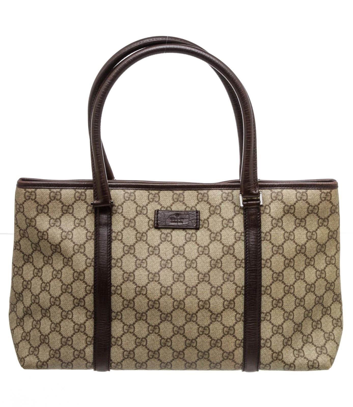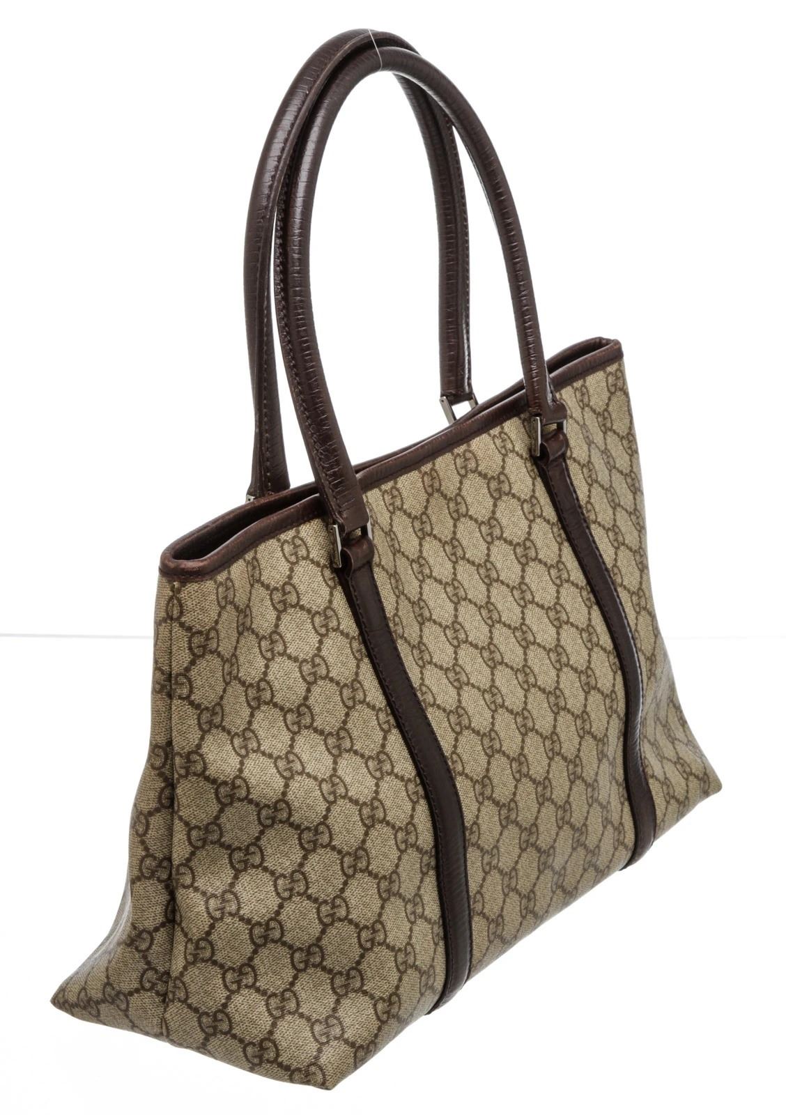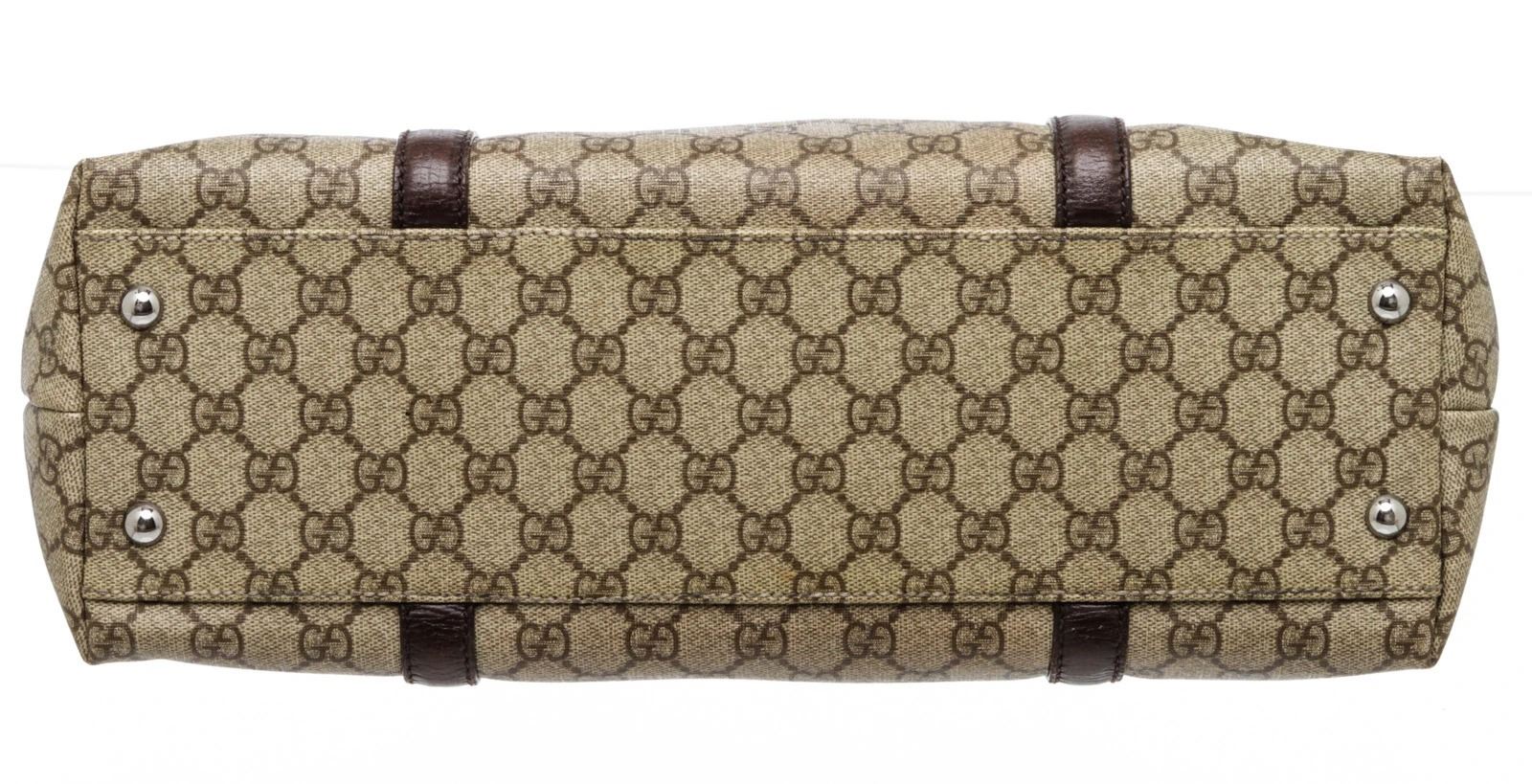 Crafted from brown GG coated canvas, this tote features dual-rolled tall leather handles, tonal leather trims, and silver-tone hardware accents. The bag’s magnetic snap closure opens to a canvas-lined interior with wall pocket ,