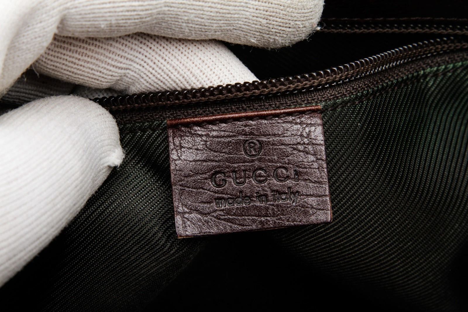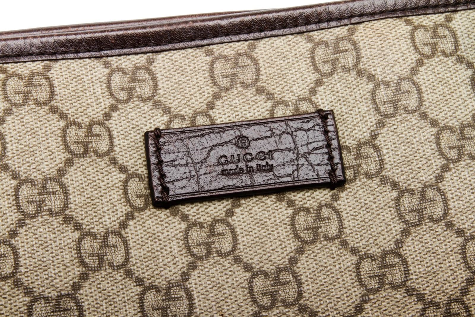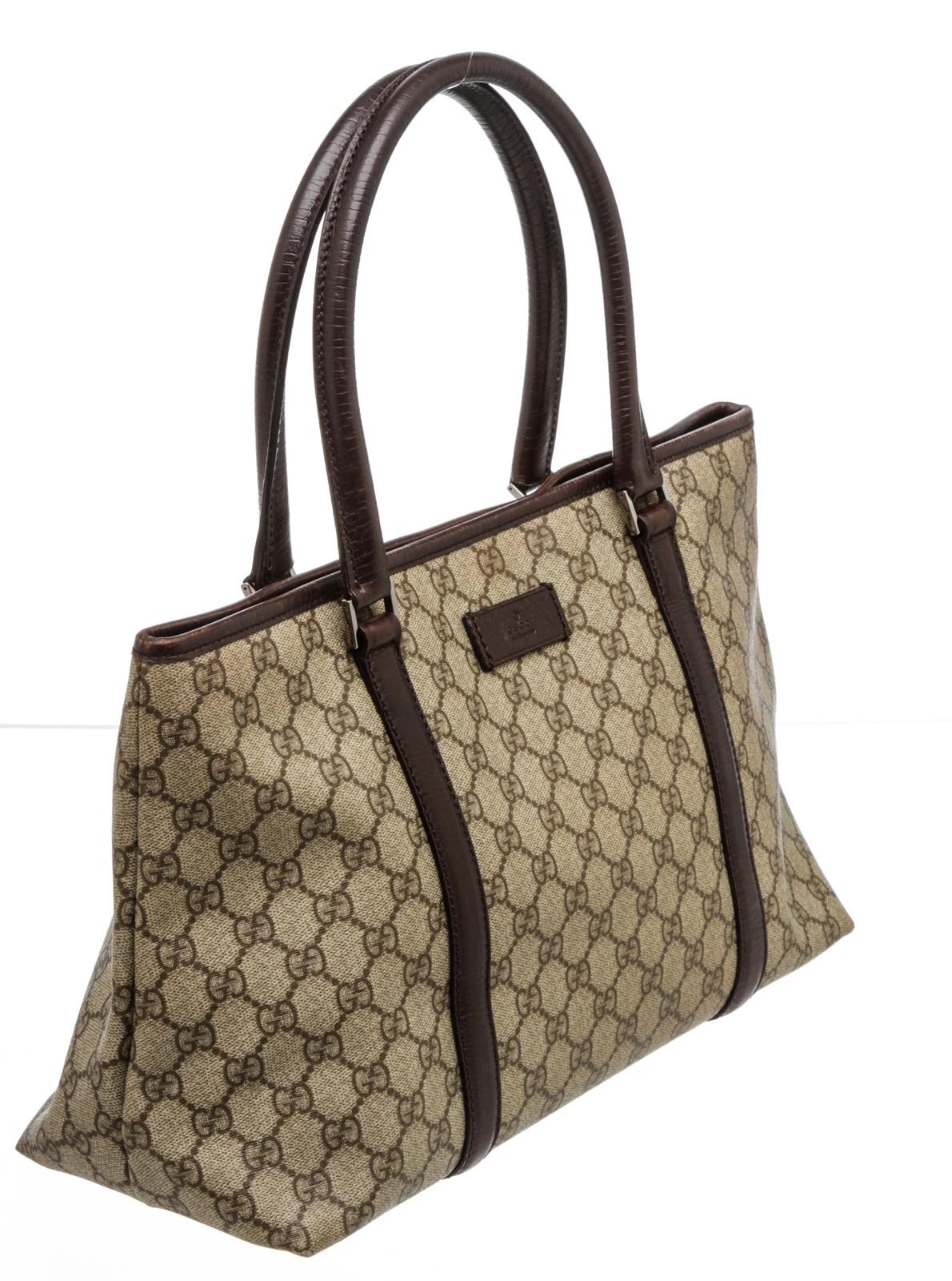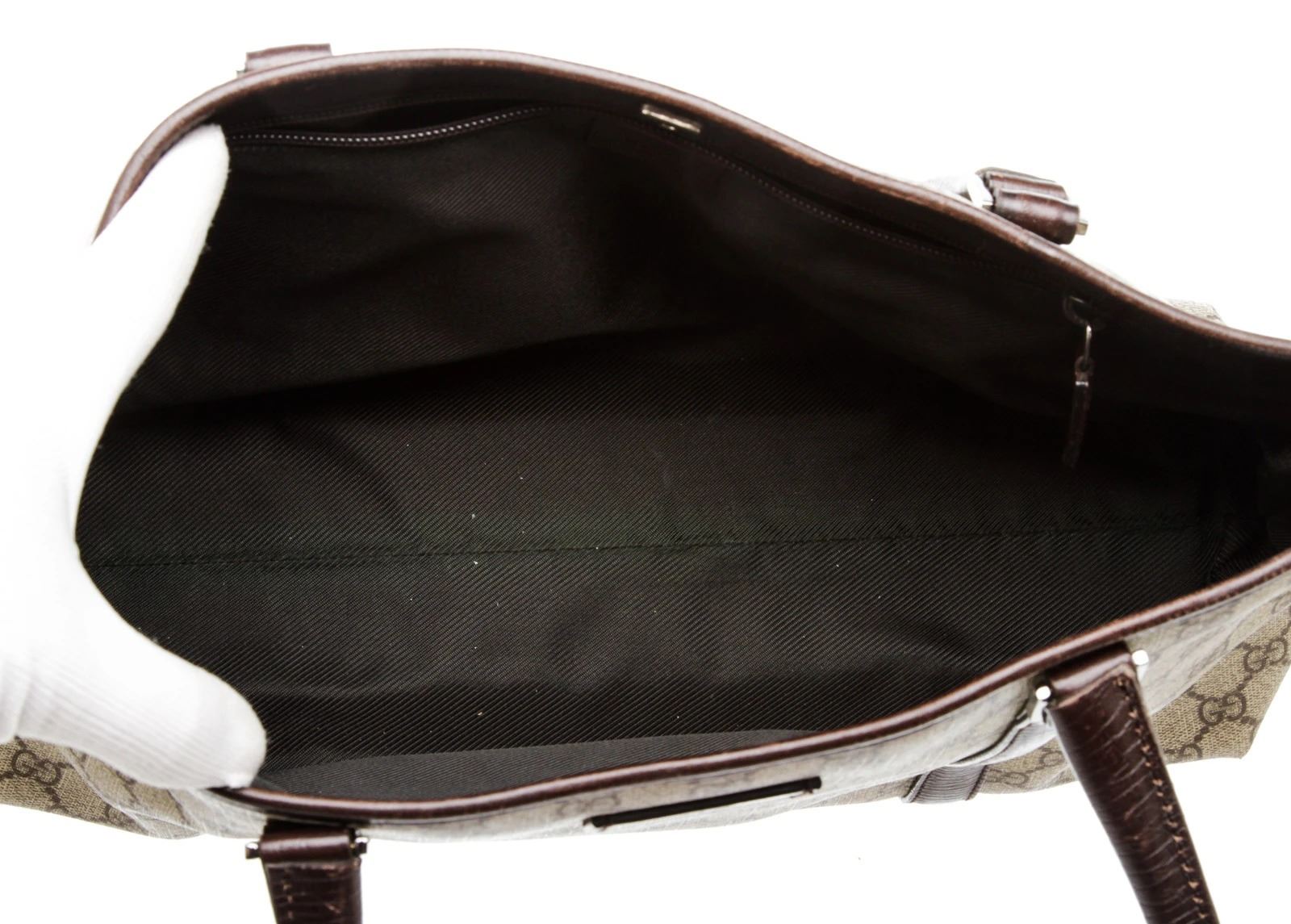 Crafted from brown GG coated canvas, this tote features dual-rolled tall leather handles, tonal leather trims, and silver-tone hardware accents. The bag’s magnetic snap closure opens to a canvas-lined interior with wall pocket ,