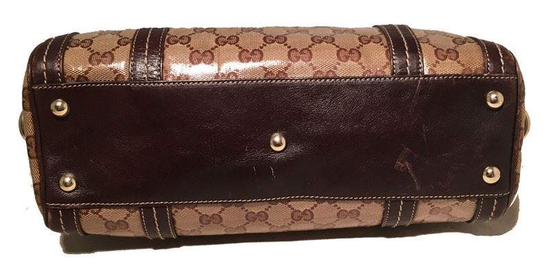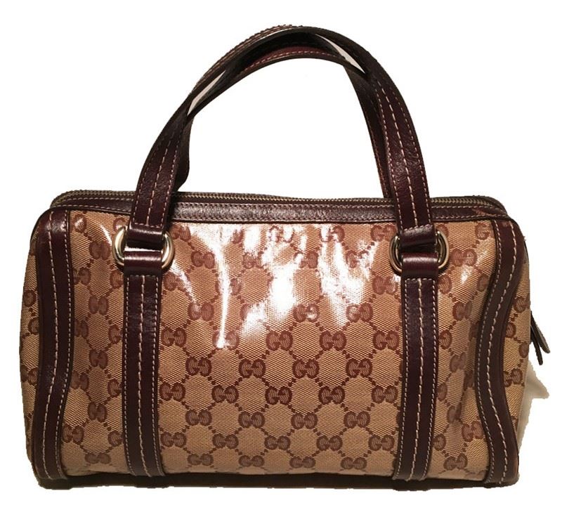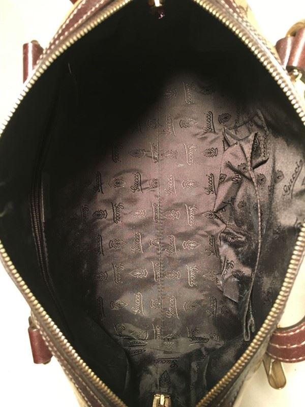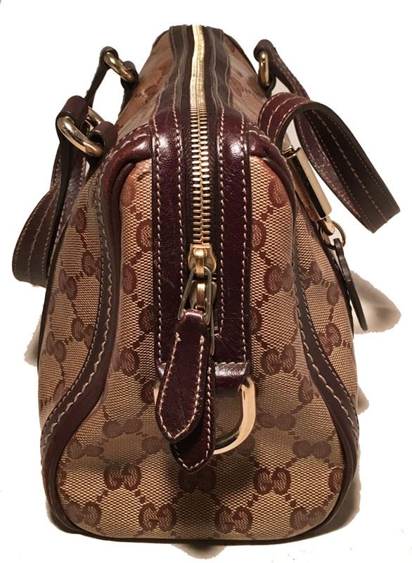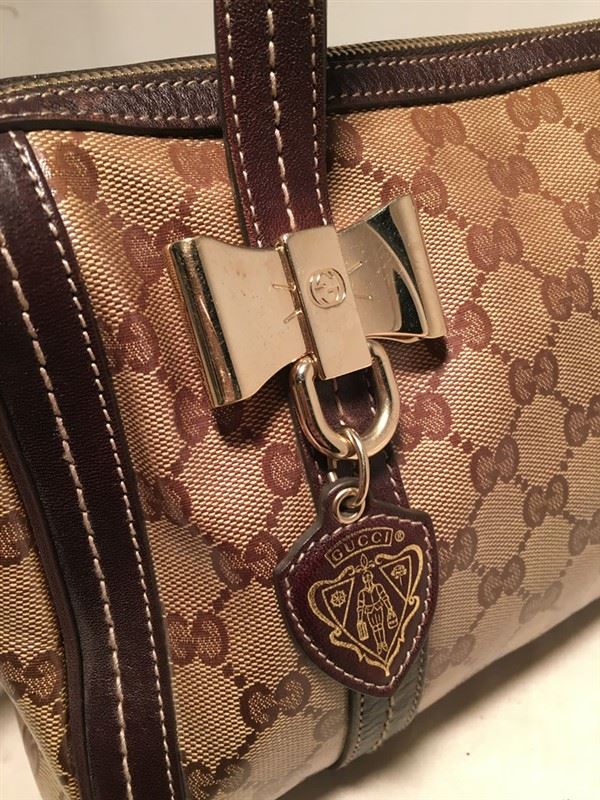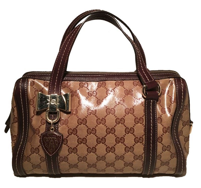 Beautiful Gucci monogram bowler handbag in very good condition. Coated monogram canvas exterior trimmed with brown leather and silver hardware. Double brown leather handles and a unique silver bow detail along front side with Gucci emblem charm attached. Top zipper closure opens to a brown nylon lined interior that holds 1 side zippered pocket. No stains, or smells. Clean interior. Light scuffs on exterior leather consistent with age and gentle use. does not detract from overall use or appearance but must be mentioned. Perfect for everyday use as it comfortably carries all your essentials in classic Gucci style. Purchase includes a dust cover. Measurements: 12"x5"x7" 4" handle drop #bags878