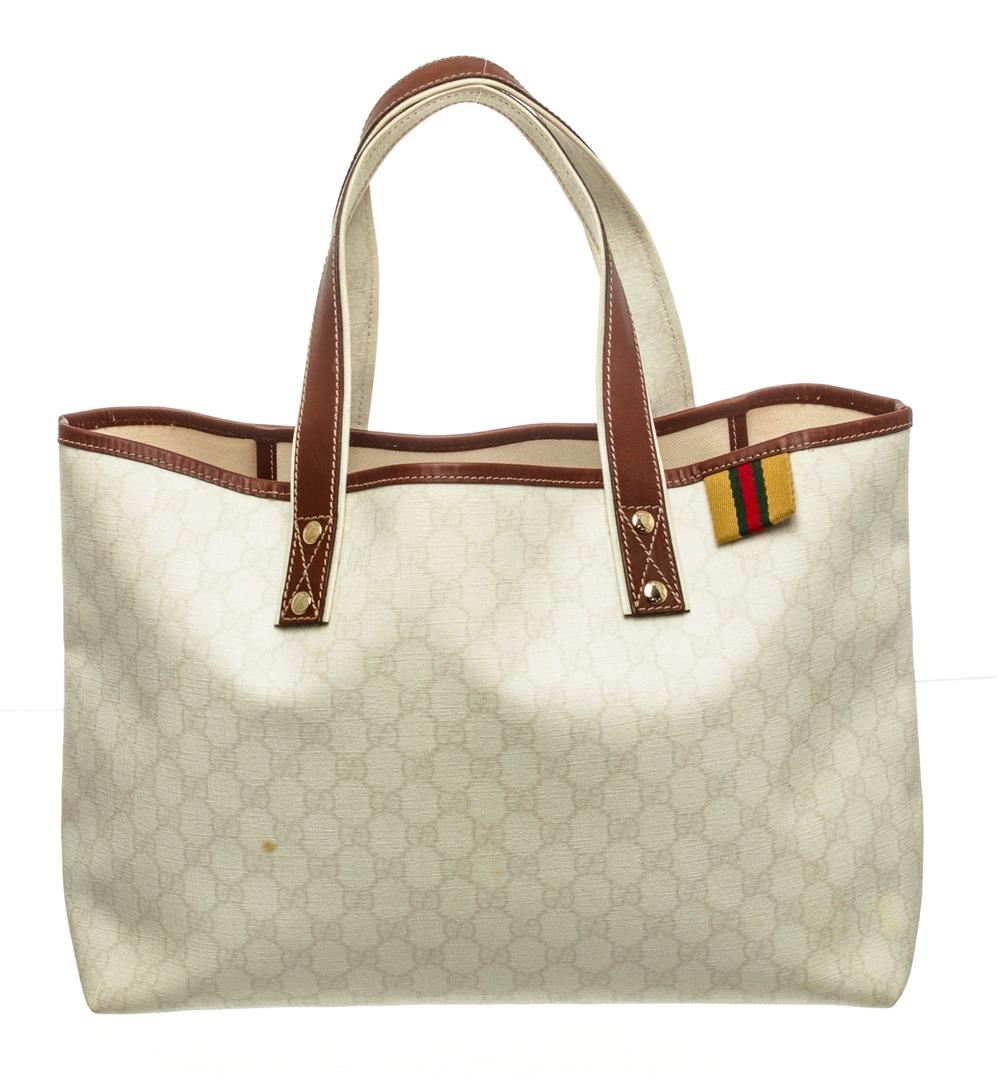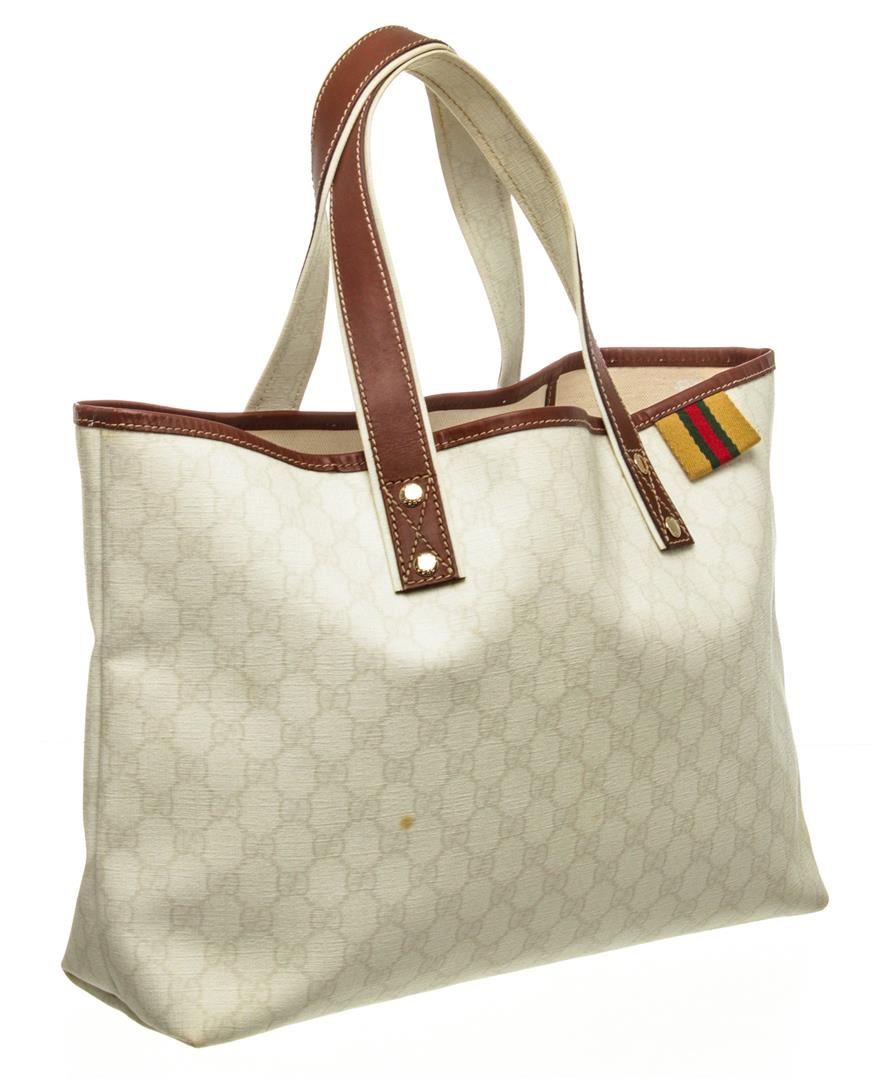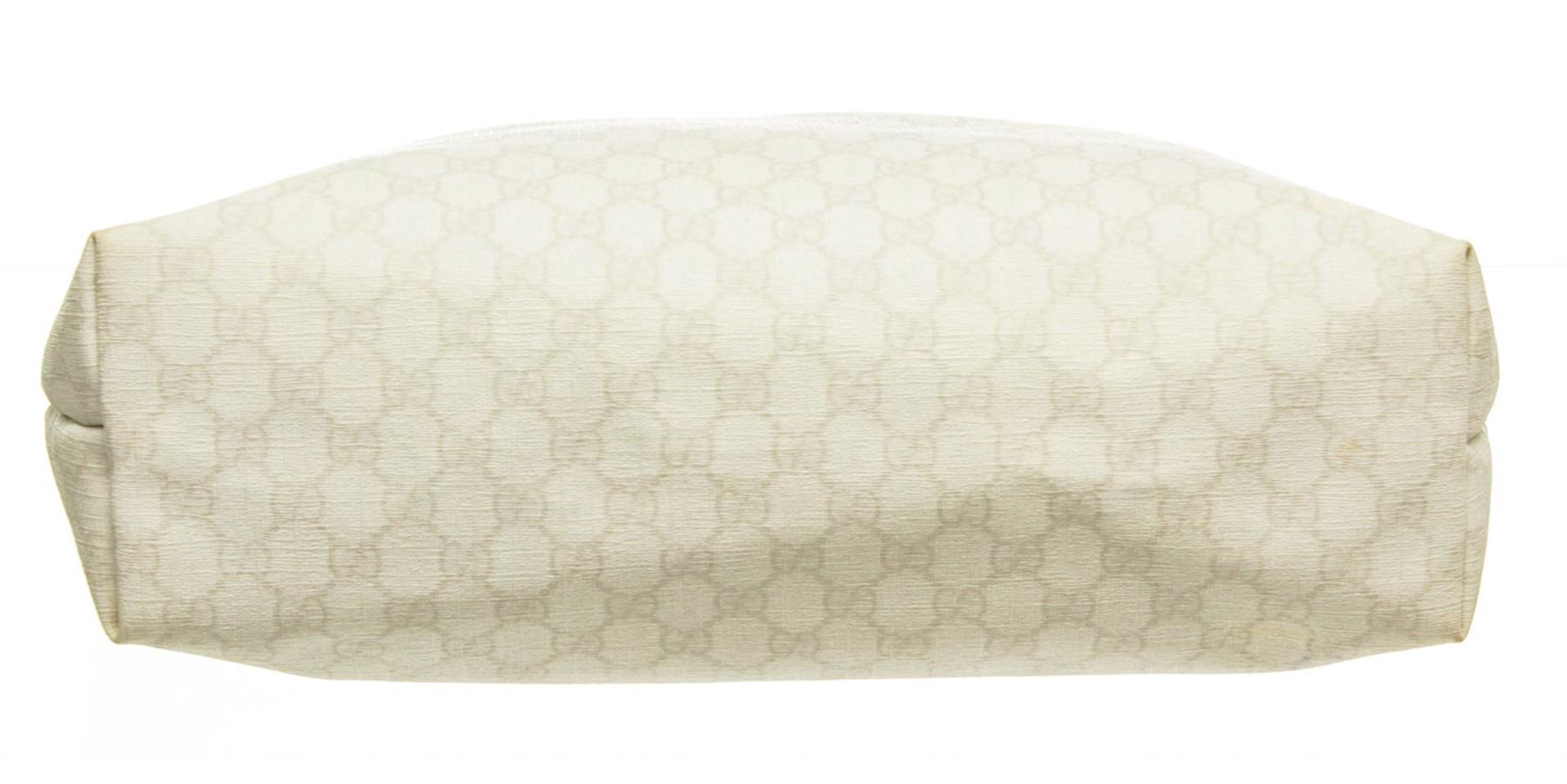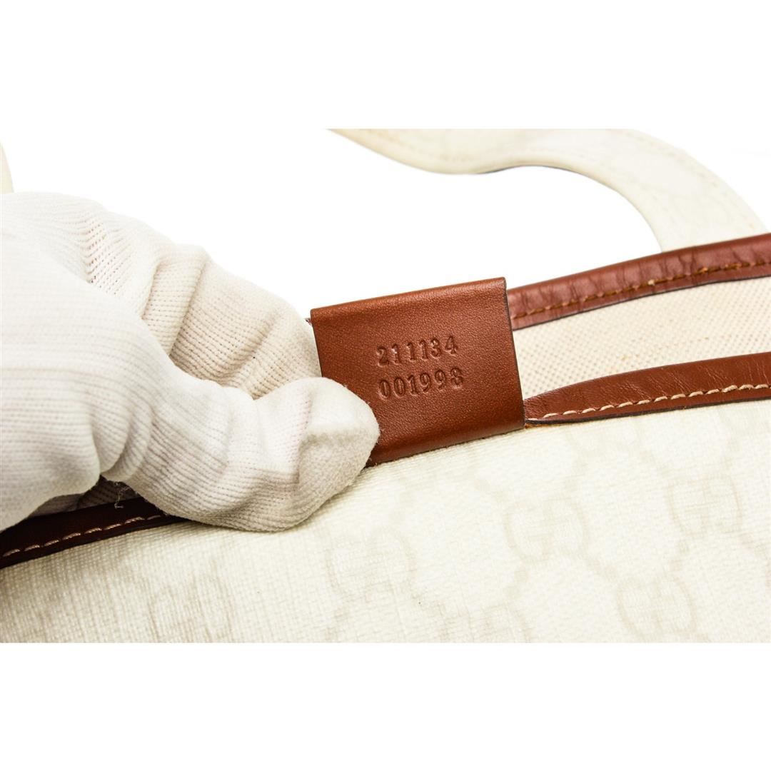 Crafted out of cream color GG supreme canvas, brown leather trim, and dual flat handles. Inner unlined single slip pocket.