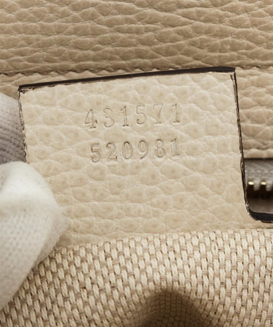 One Gucci Cream White Grained Leather Soho Top Handle Bag. Crafted out of cream white grained leather, gold-tone hardware, and zip top closure. MKX