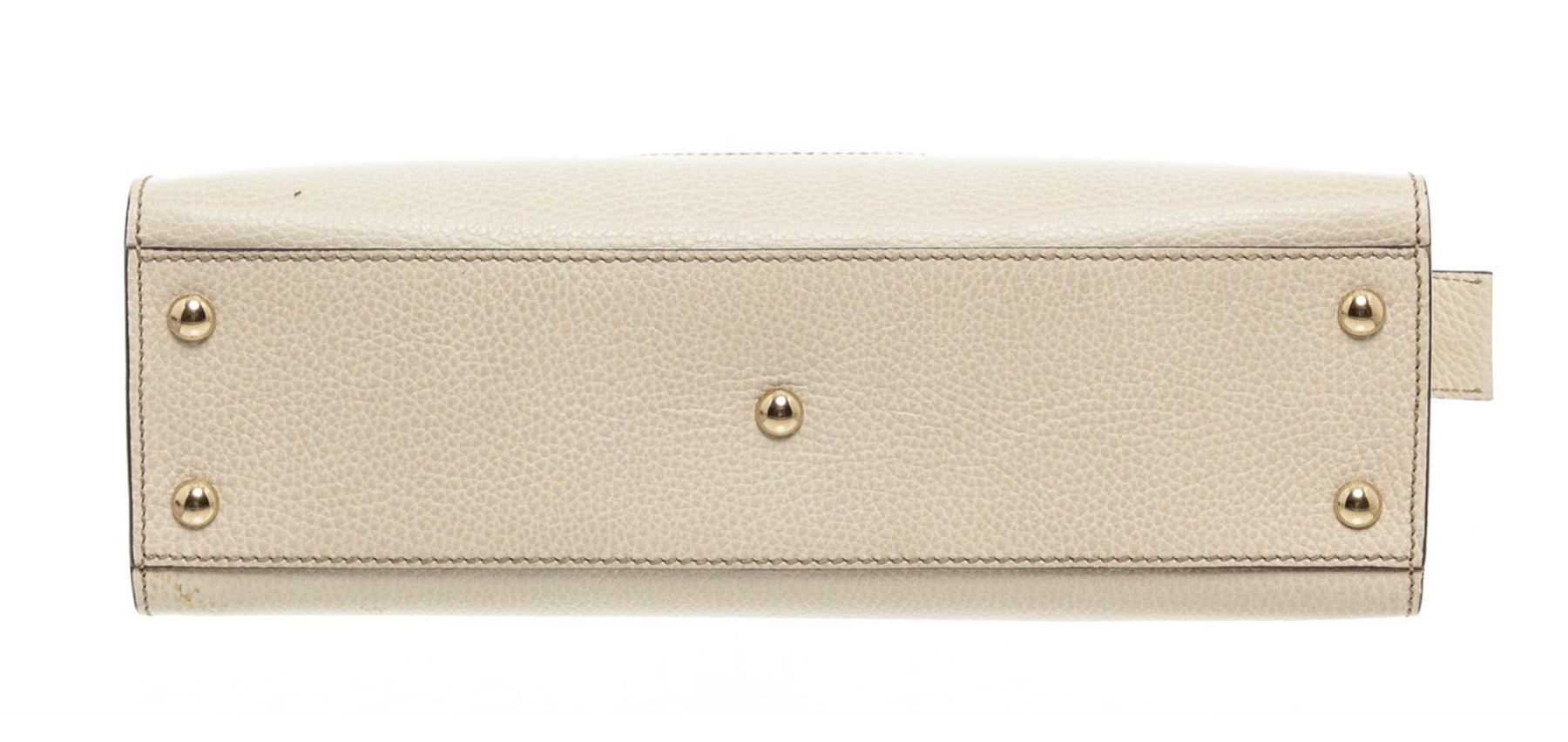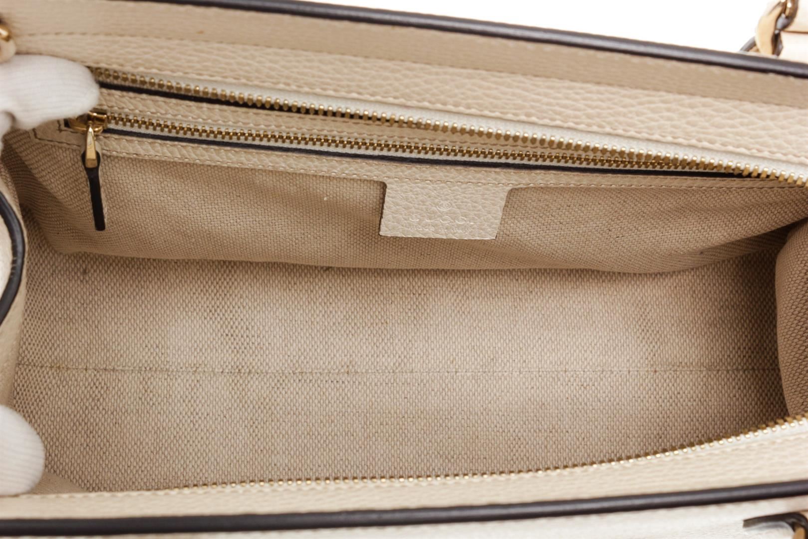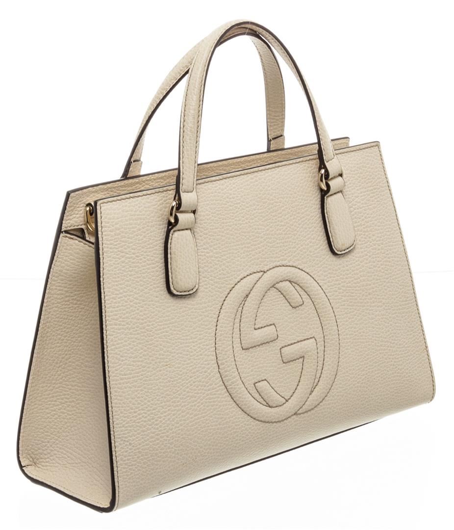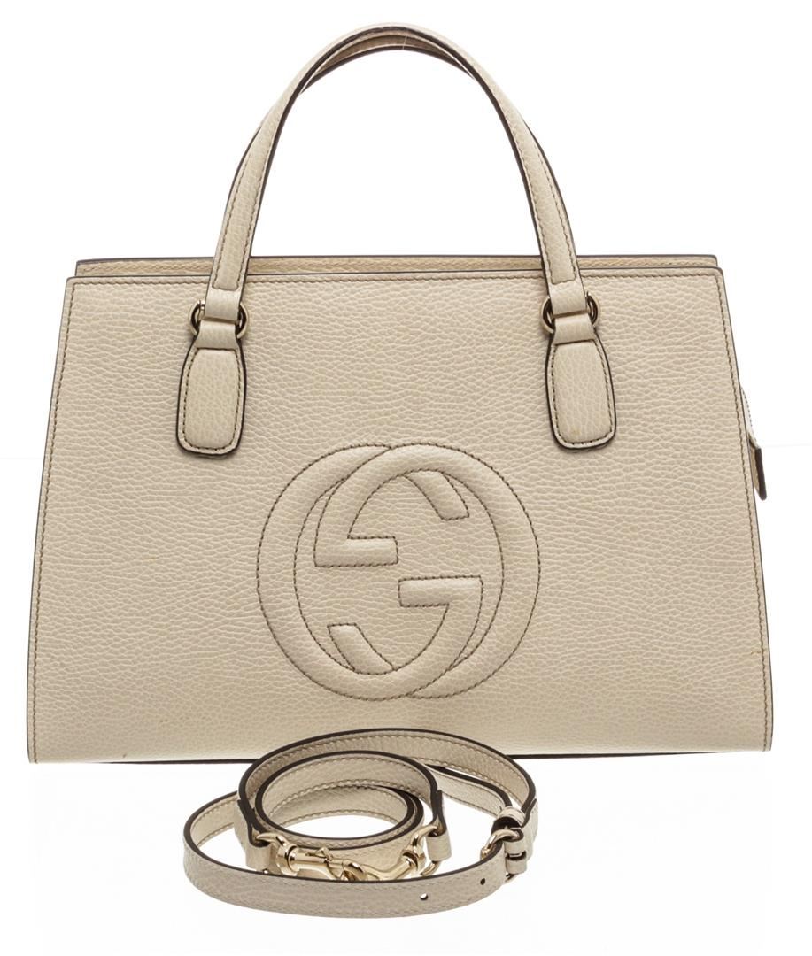 One Gucci Cream White Grained Leather Soho Top Handle Bag. Crafted out of cream white grained leather, gold-tone hardware, and zip top closure. MKX
