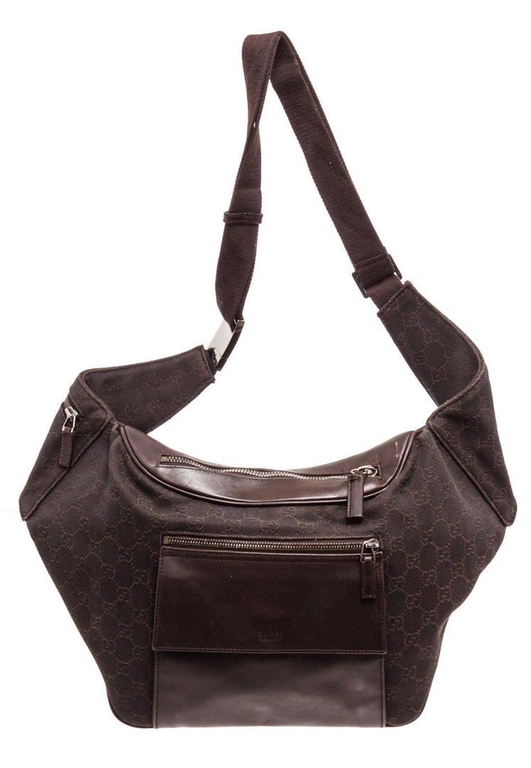 Gucci Dark Brown Beige Canvas Leather Large Waist Bag with gold-tone hardware, leather lining, exterior zip pockets and zipper closure. Measurements: Length: 13 in / 33 cm Width: 4 in / 10 cm 9 in / 23 cmCONDITION: Pre-Owned Good overall, please see photographs for detail.