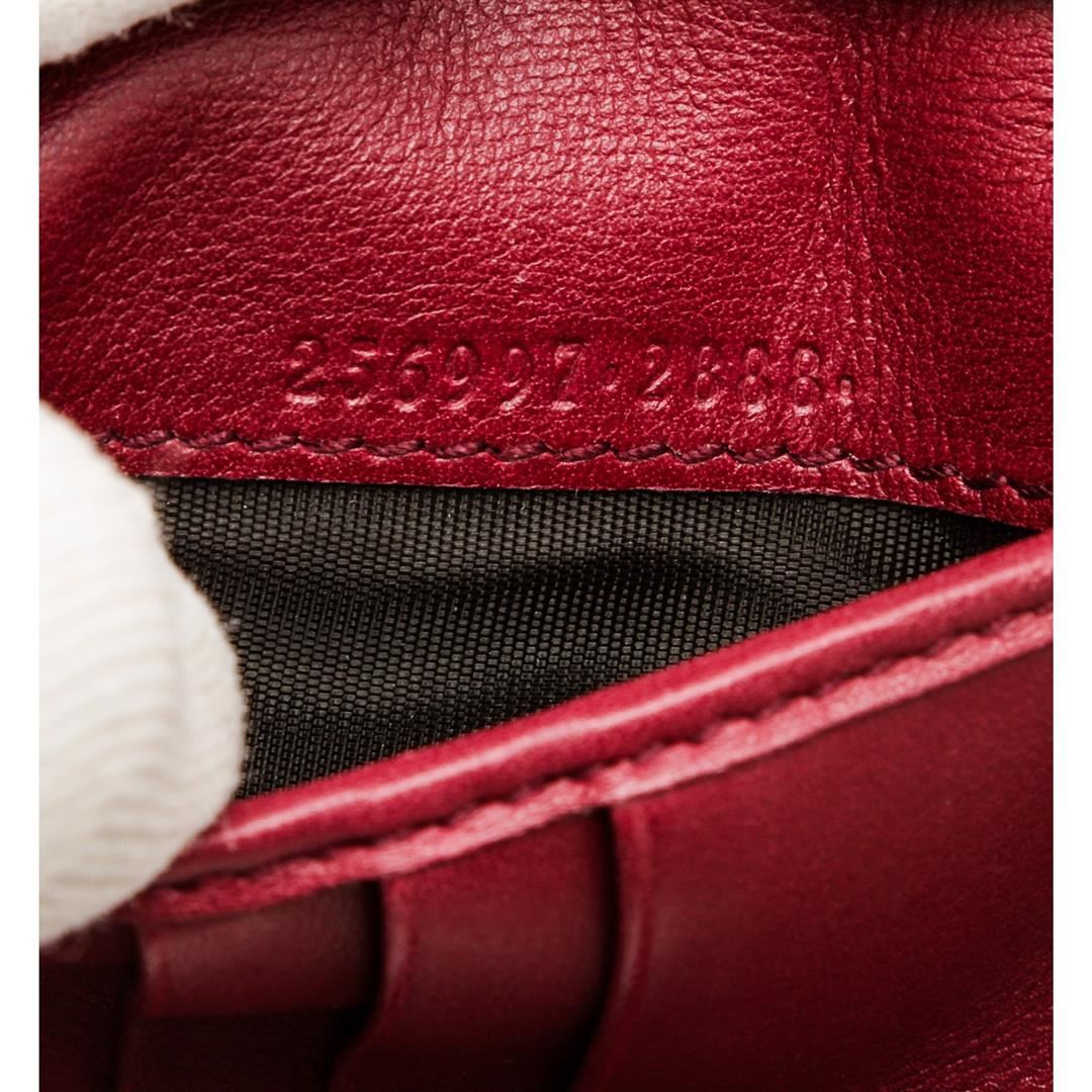 Dark Red Guccissima leather Gucci French purse with gold tone hardware, single exterior coin compartment with snap closure at flap, tonal leather lining, dual slip pockets at interior walls, dual bill compartments, ten card slots and snap closure at top strap. Authentic.