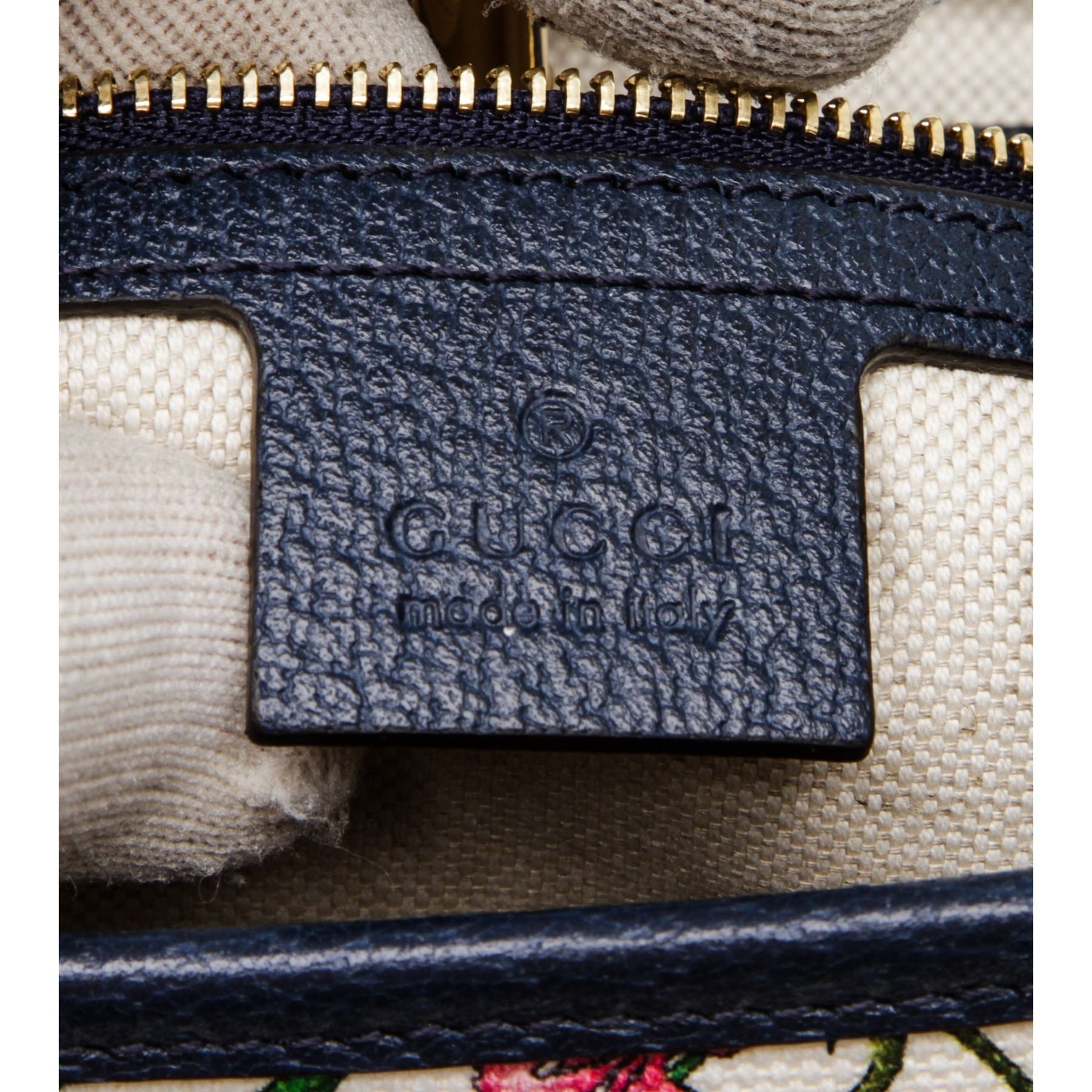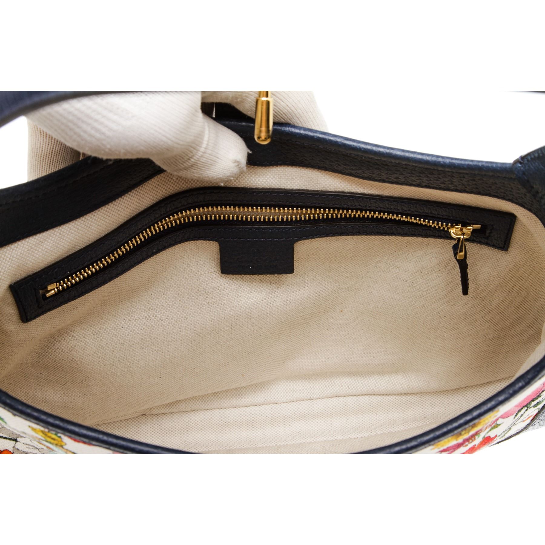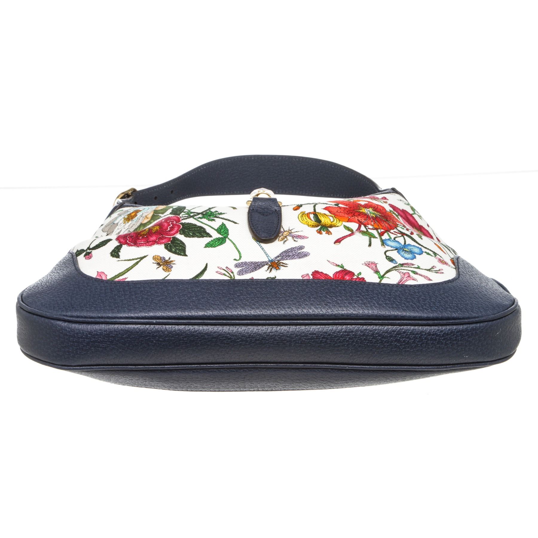 Debuting in the Cruise 2019 collection, this Gucci handbag is crafted out of floral and insect multi-color canvas, dark blue pebbled leather trim, and gold-tone hardware. Inner beige canvas lining, dual slip pockets, and one zip pocket at interior wall.