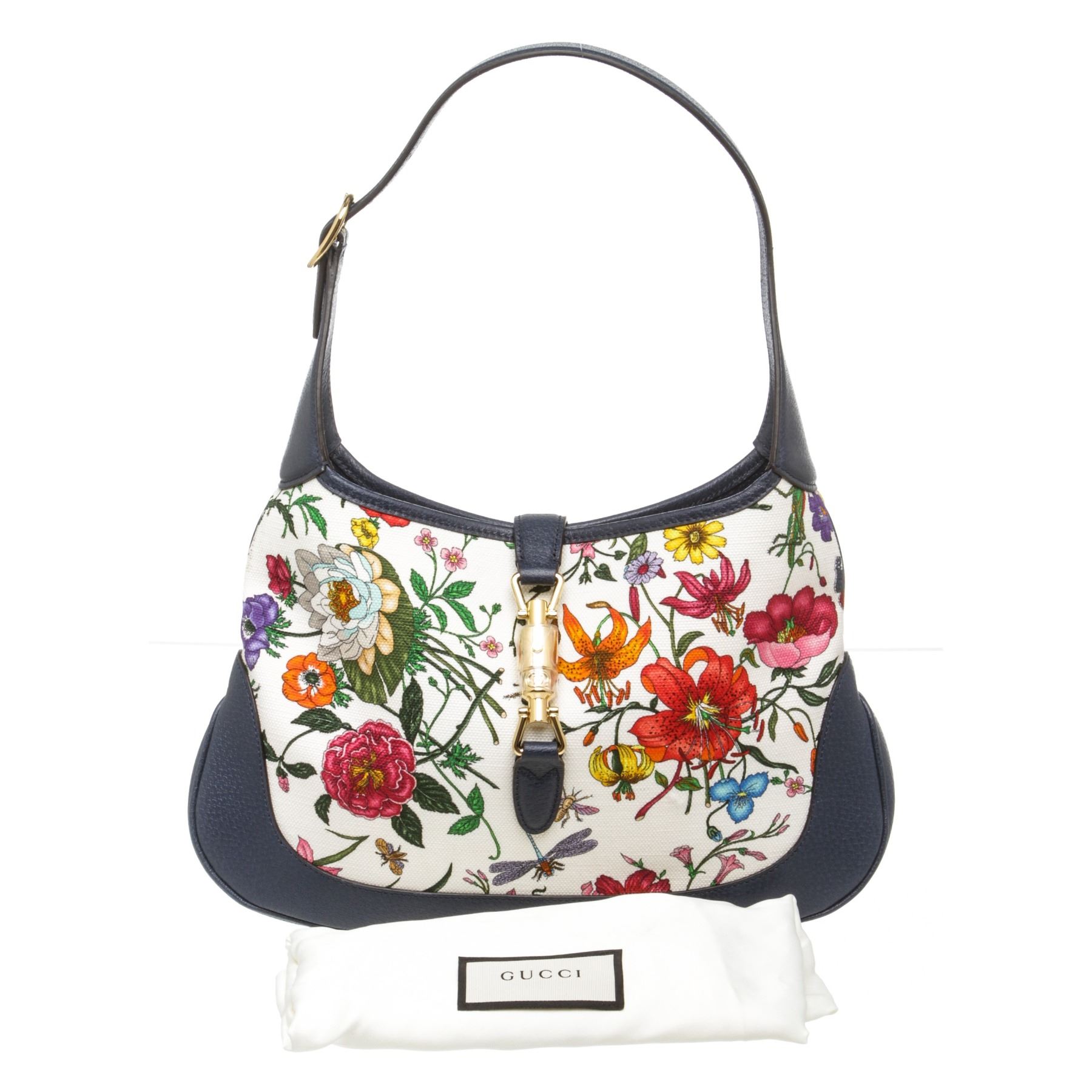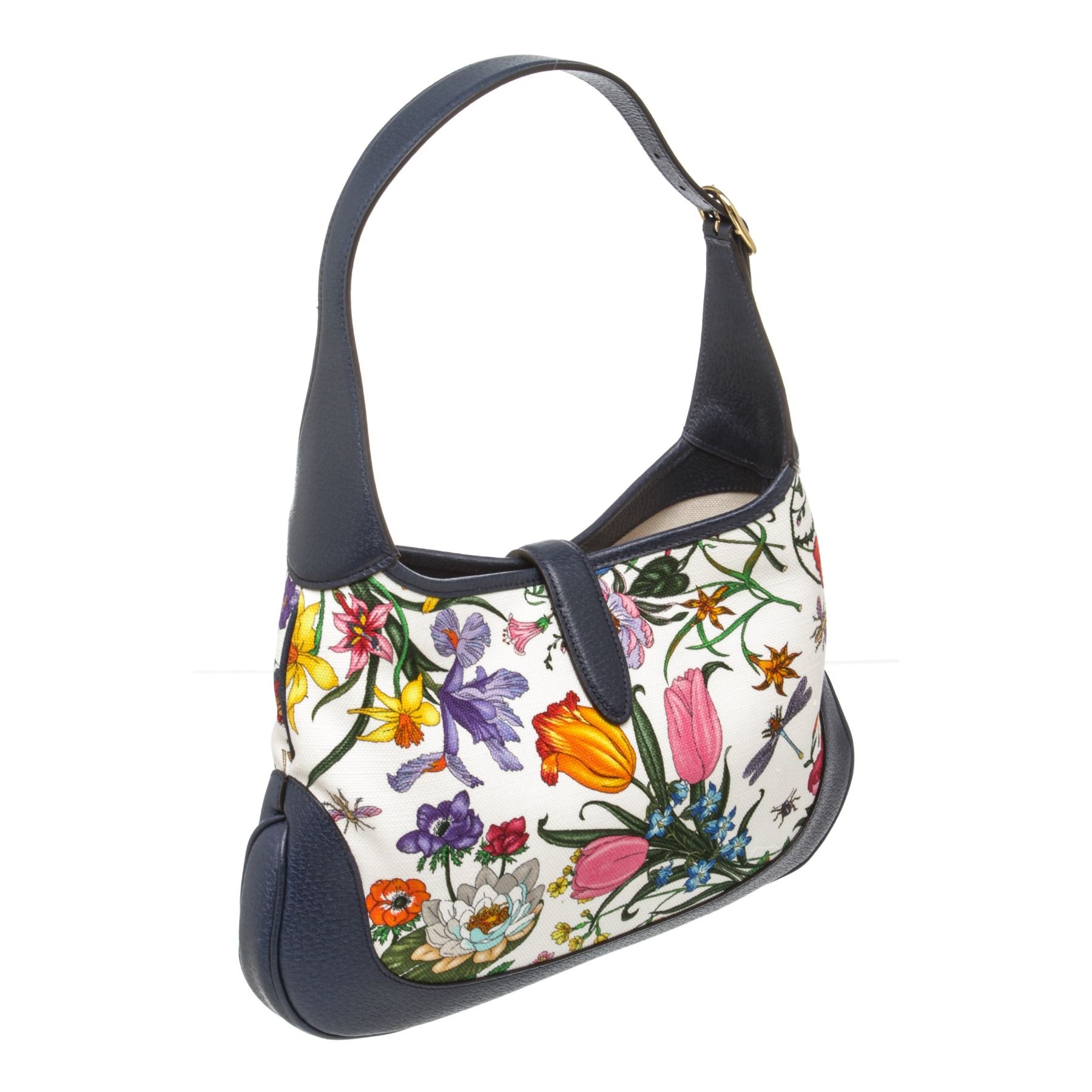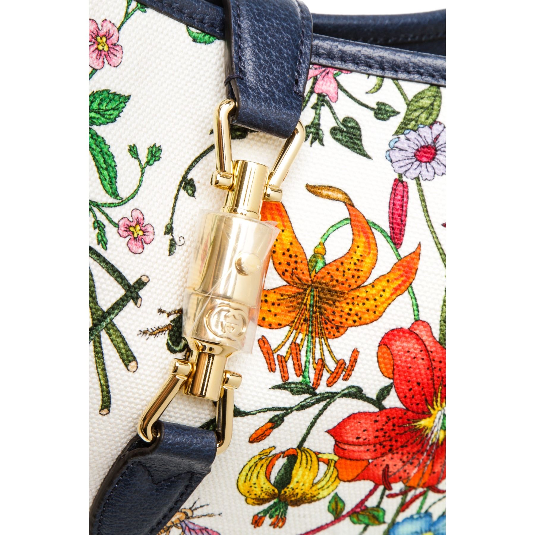 Debuting in the Cruise 2019 collection, this Gucci handbag is crafted out of floral and insect multi-color canvas, dark blue pebbled leather trim, and gold-tone hardware. Inner beige canvas lining, dual slip pockets, and one zip pocket at interior wall.