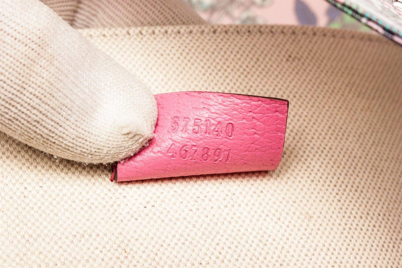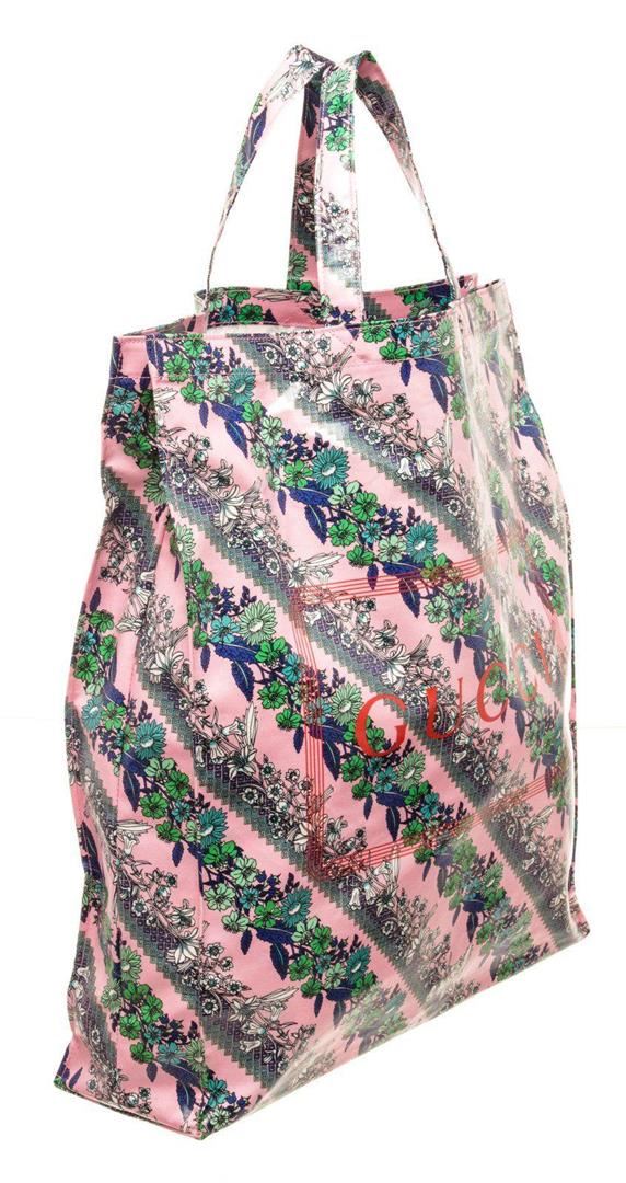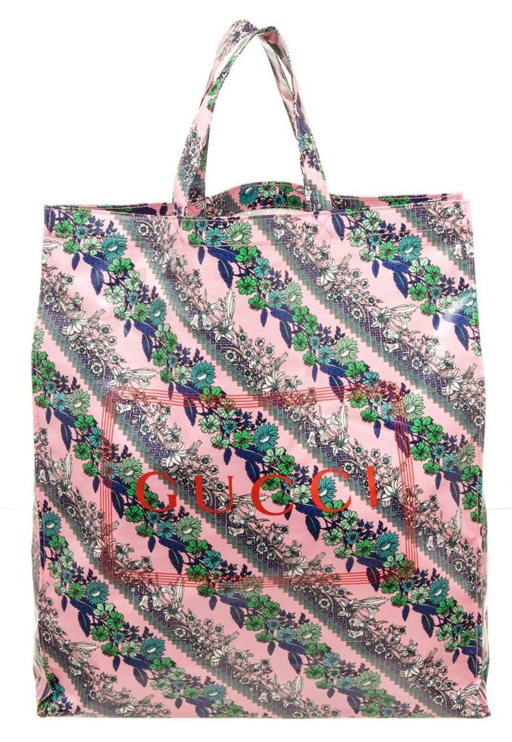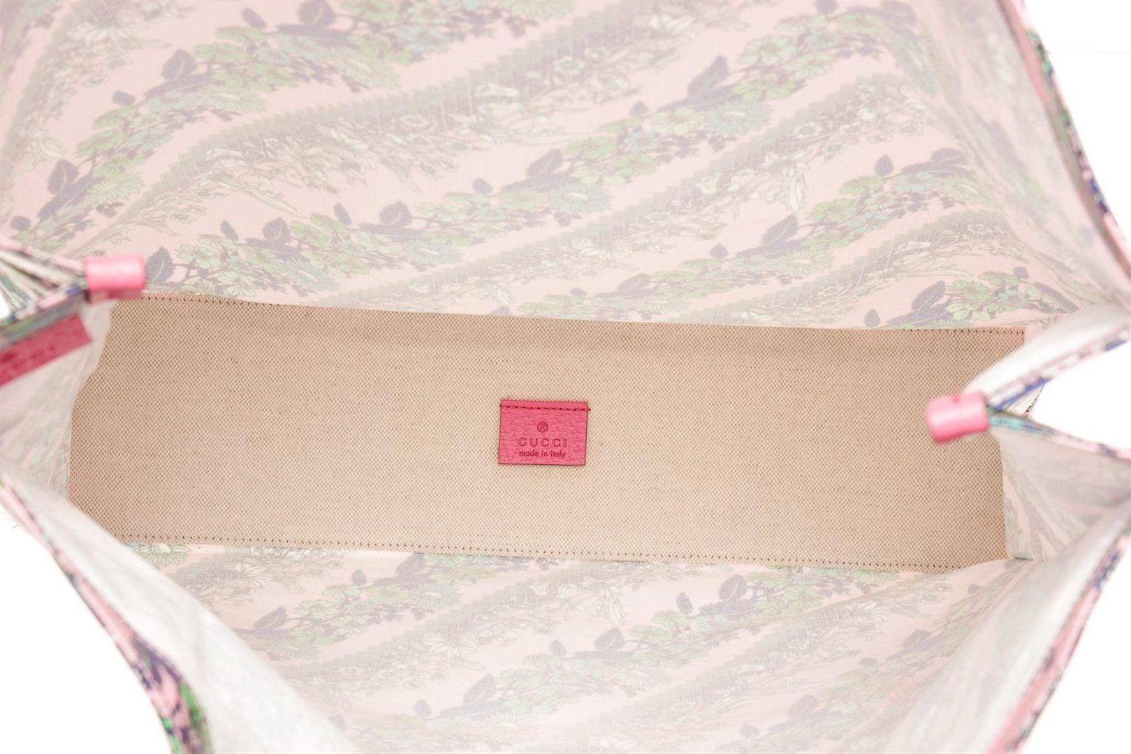 Gucci Floral Pink Coared Canvas Tote Bag with material coated canvas, silver tone hardware, top dual handle, flap closure.