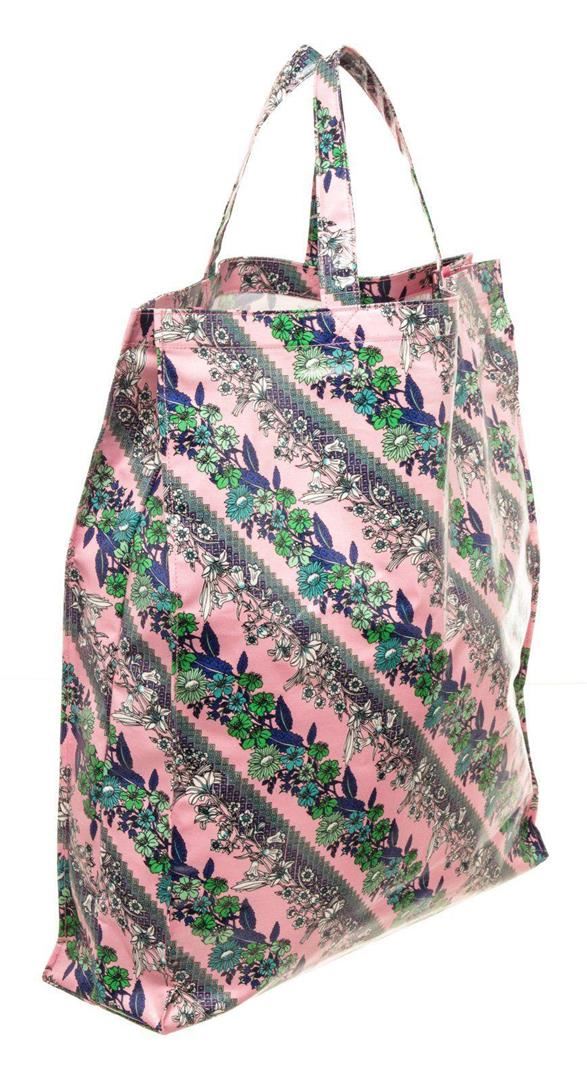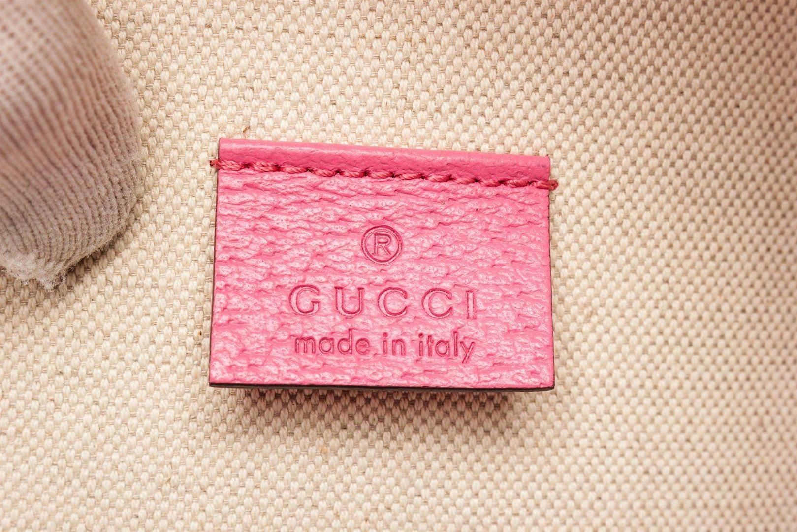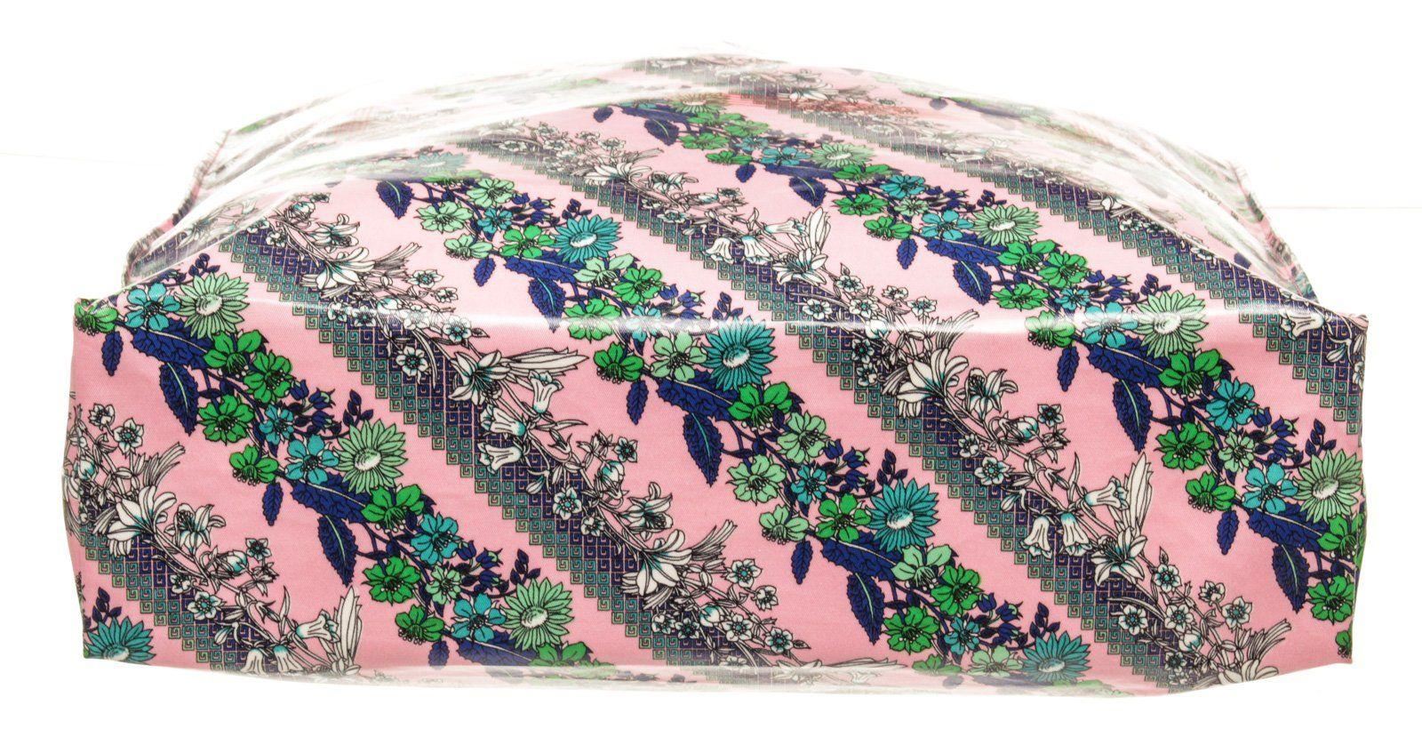 Gucci Floral Pink Coared Canvas Tote Bag with material coated canvas, silver tone hardware, top dual handle, flap closure.