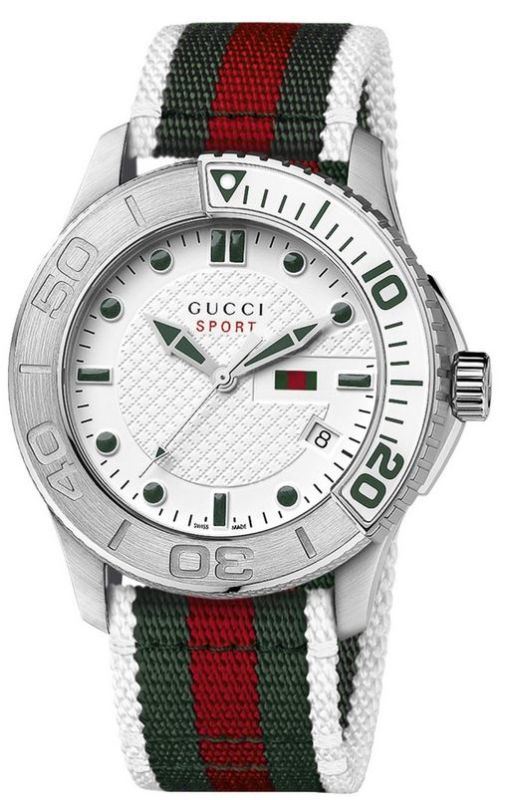 Model: YA126231 - CASE = [Material:Stainless Steel], [Case Diameter:44], [Case Thickness:11mm], [Bezel:Rotating], [Case Back:Solid], [Water Resistant:50 Meters - 165 Feet], [Crystal:Scratch Resistant Sapphire], DIAL = [Color:White], MOVEMENT = [Type:Quartz], [Crown:Push In], BAND = [Clasp:Tang], [Type:White, Green and Red Nylon], (In Stock - Ready to ship.)